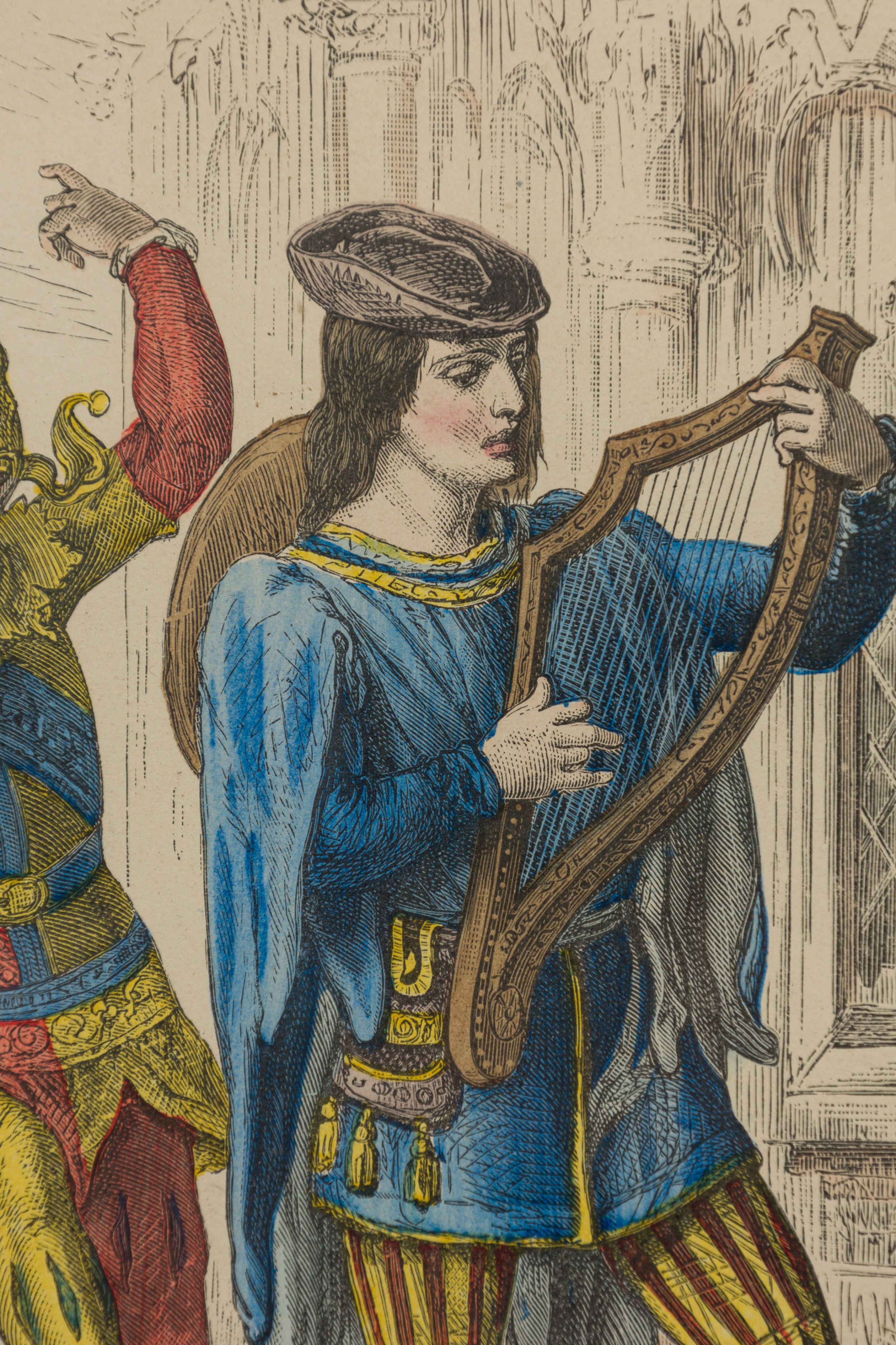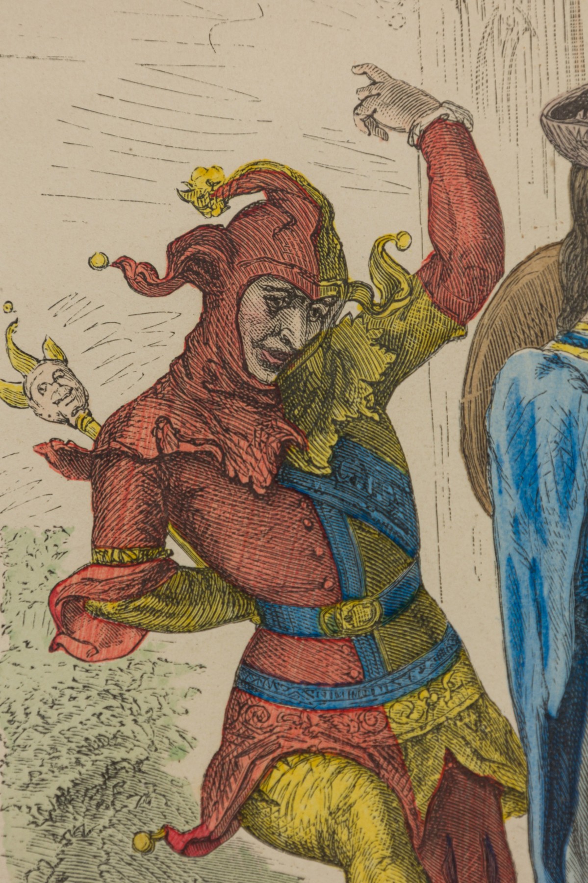 Choose one of the options below.French 19th-Century Framed Lithograph of a Musician and a Fool in Early Renaissance Attire