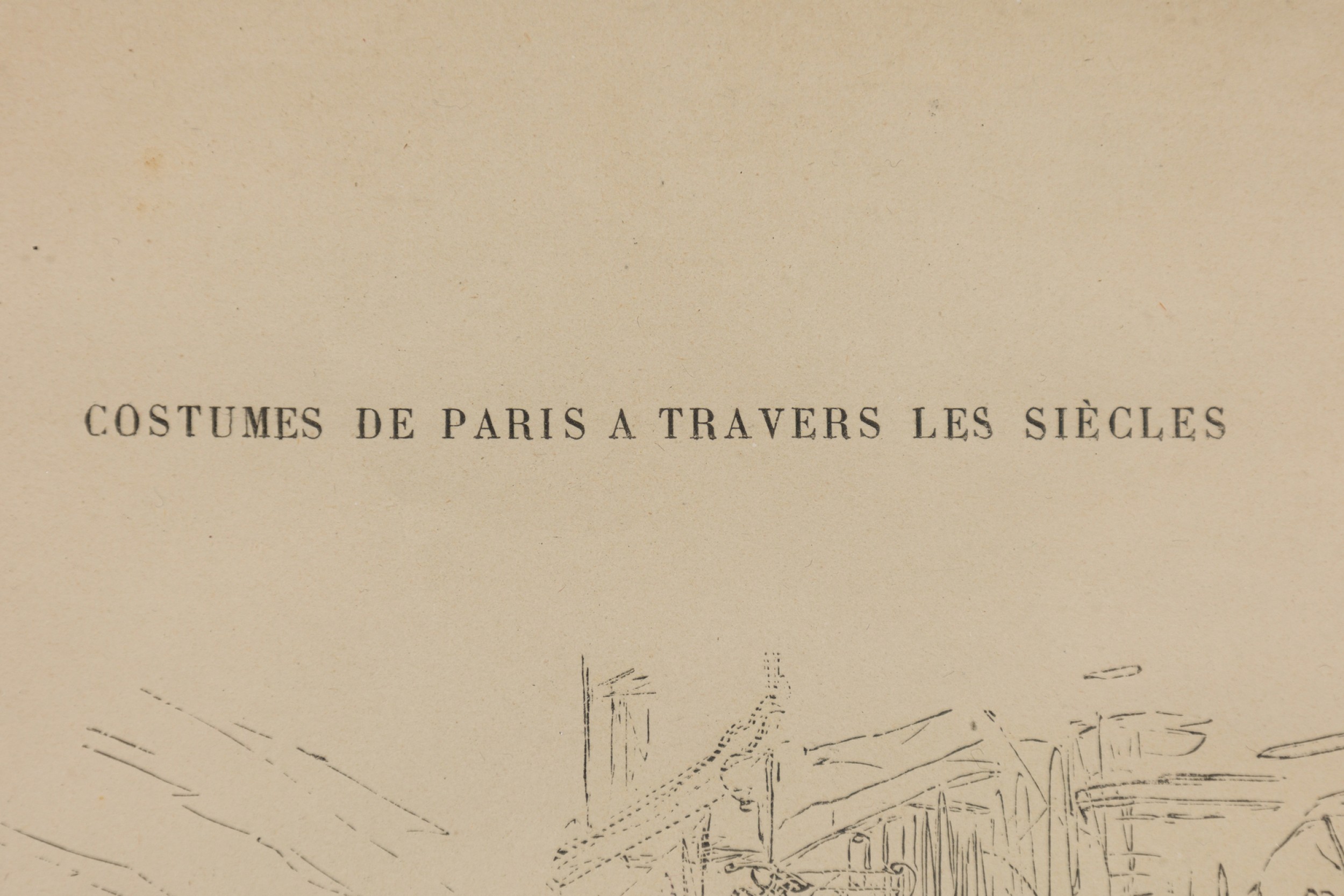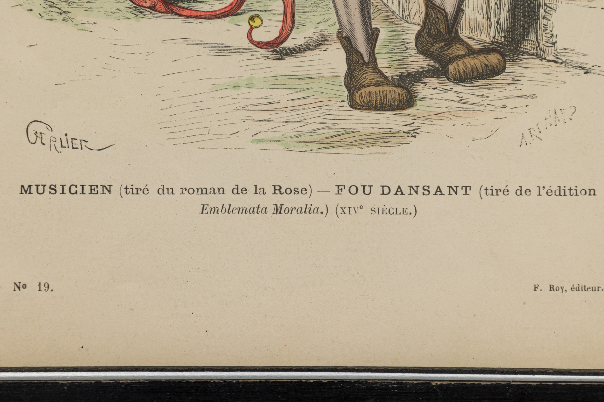 French 19th-Century framed lithograph of a musician and a fool in early Renaissance attire performing on Parisian streets in a wooden black and silver frame (Similar group of prints NWL6152A-J)