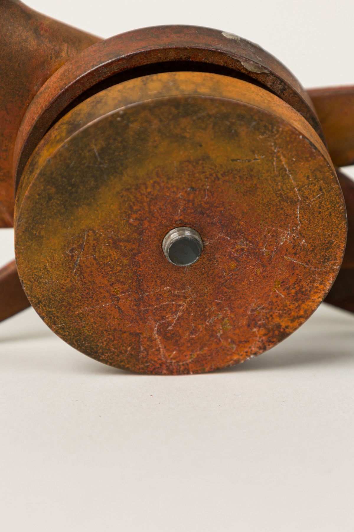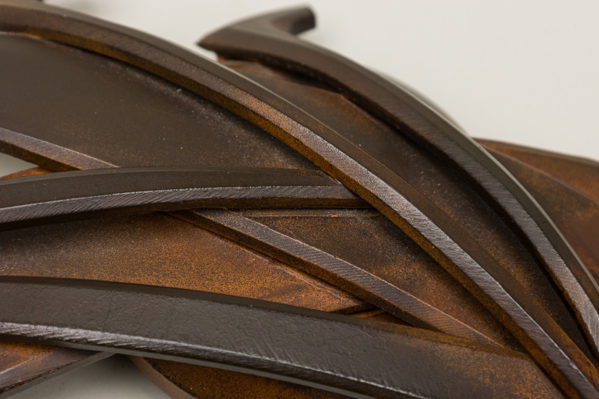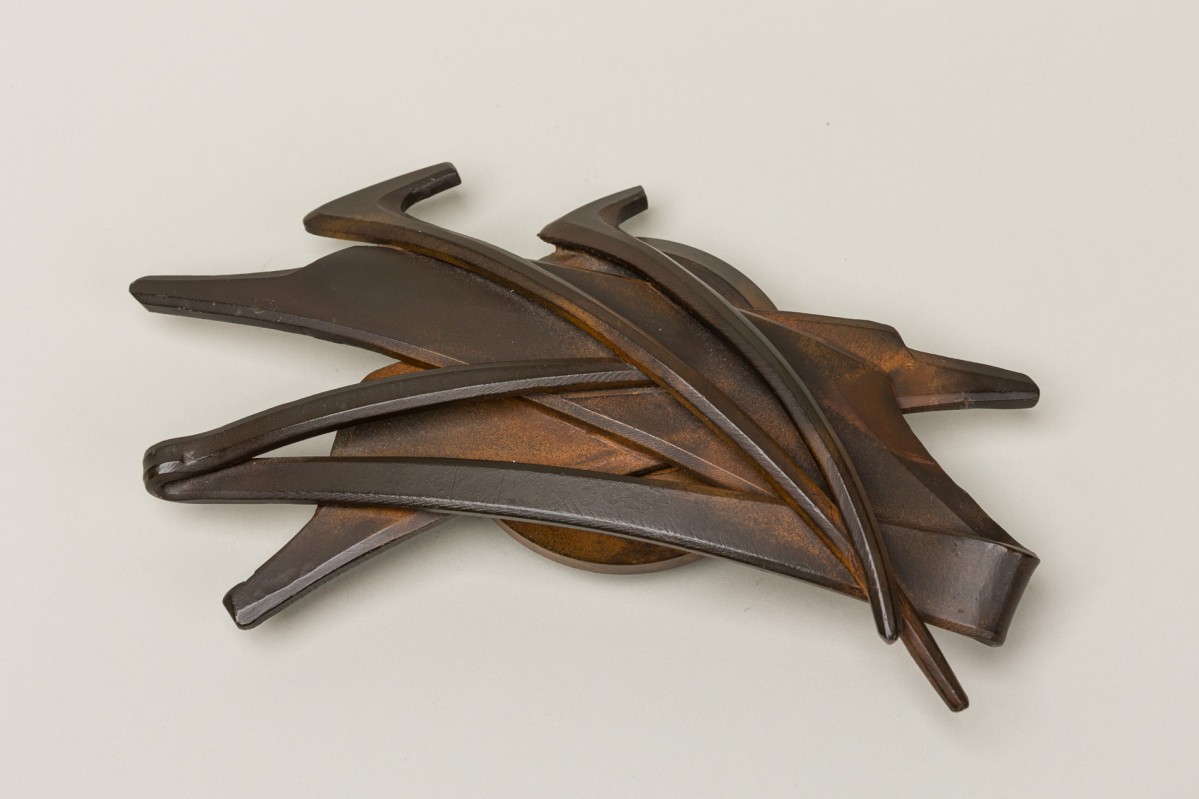 3 American Post-War forged and fabricated steel double sided knobs / paper weightS with controlled rust patina. marked (PALEY, 1994) (PRICED EACH), 9" x 1 1/2" (largest), 5"sqr (smallest)