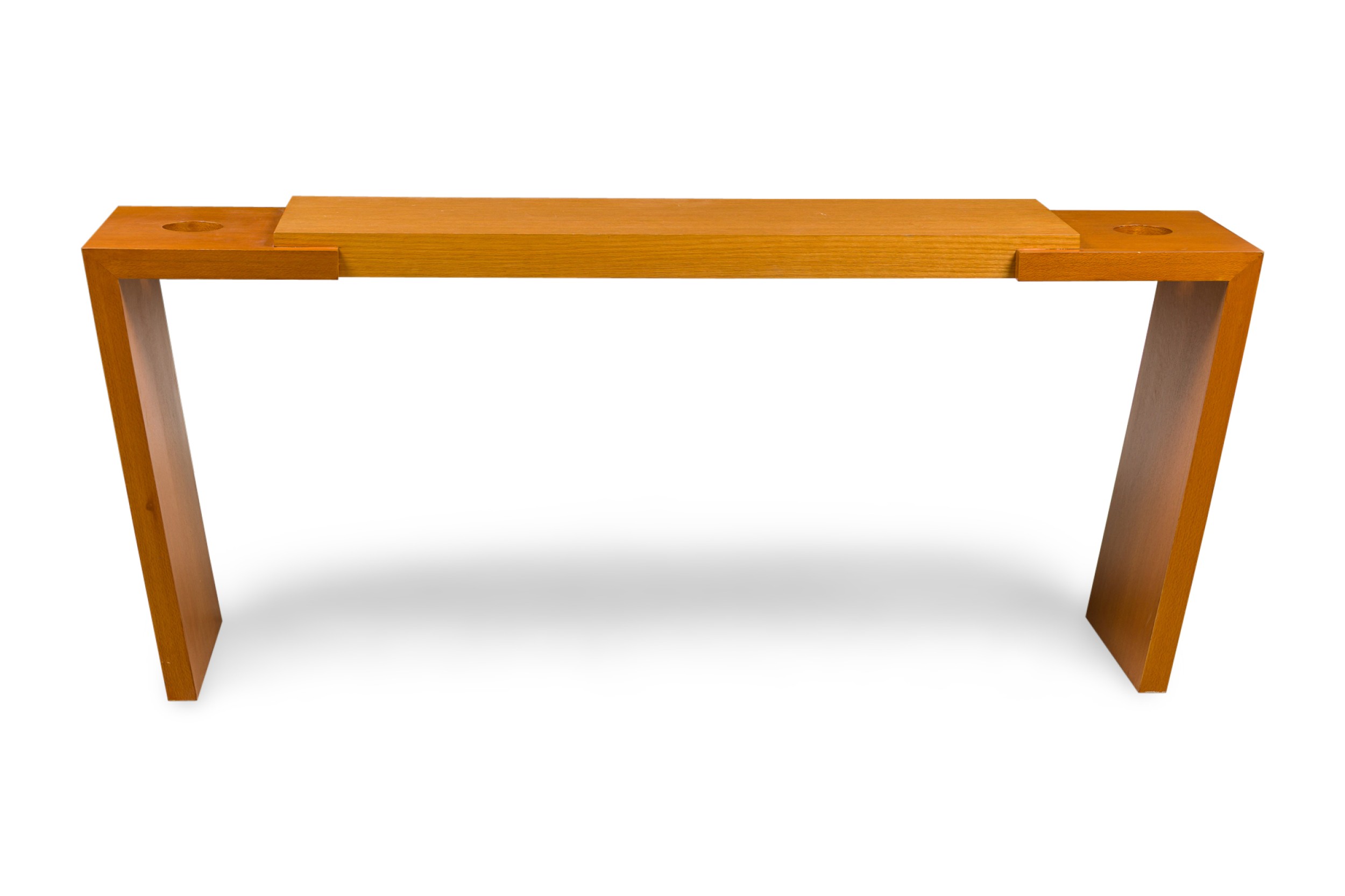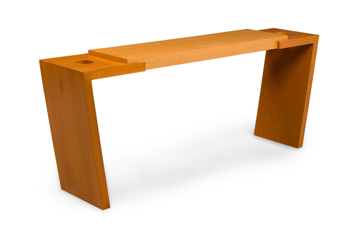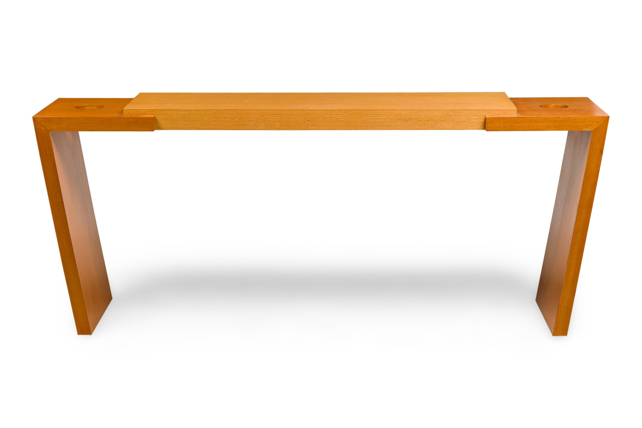 American Contemporary walnut and bleached mahogany console table with two small circular openings on both ends