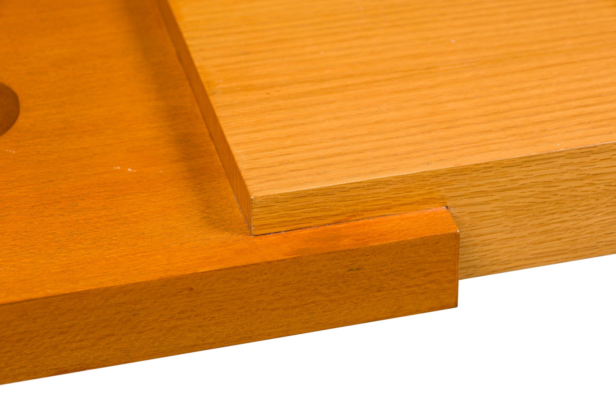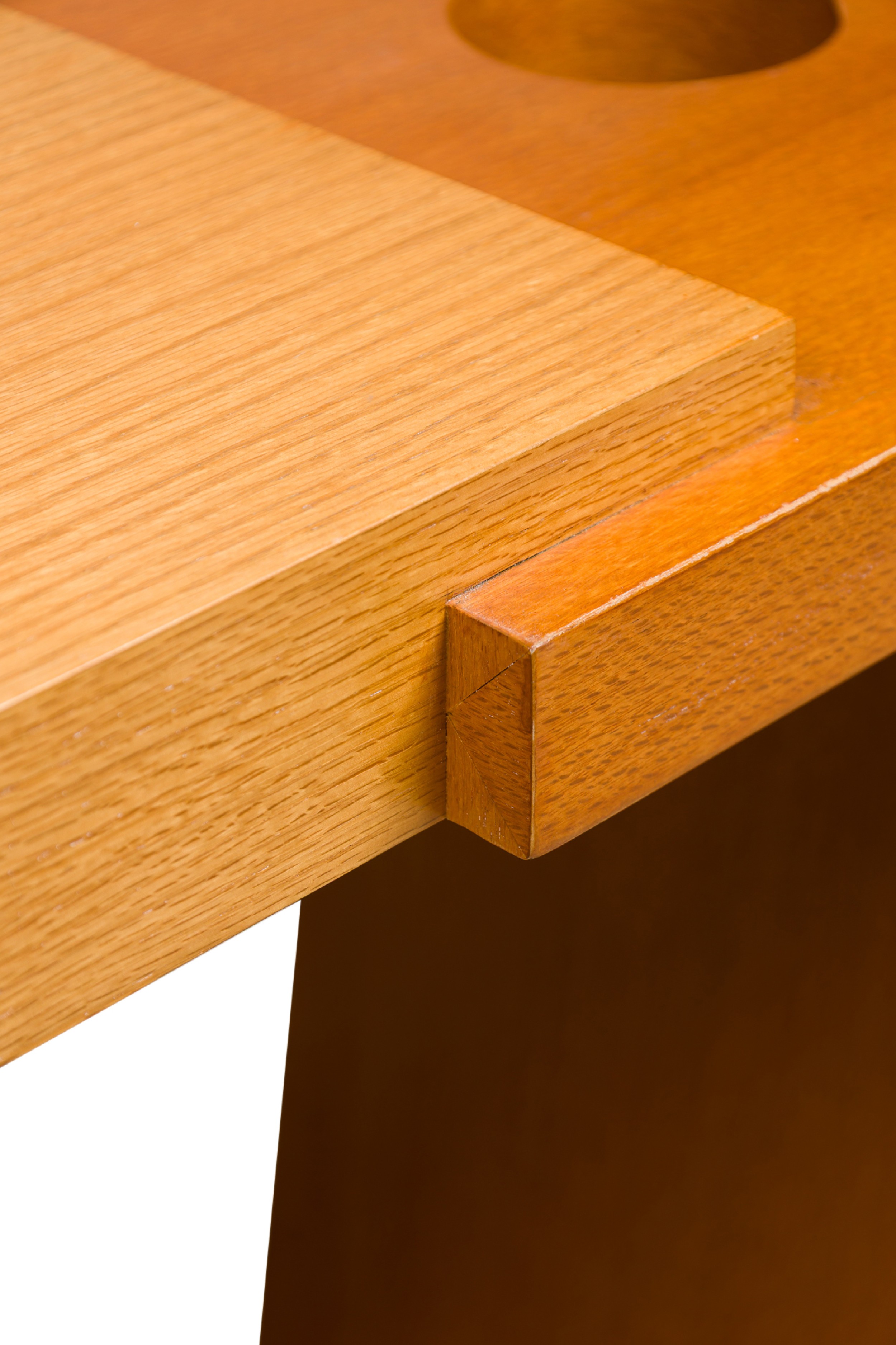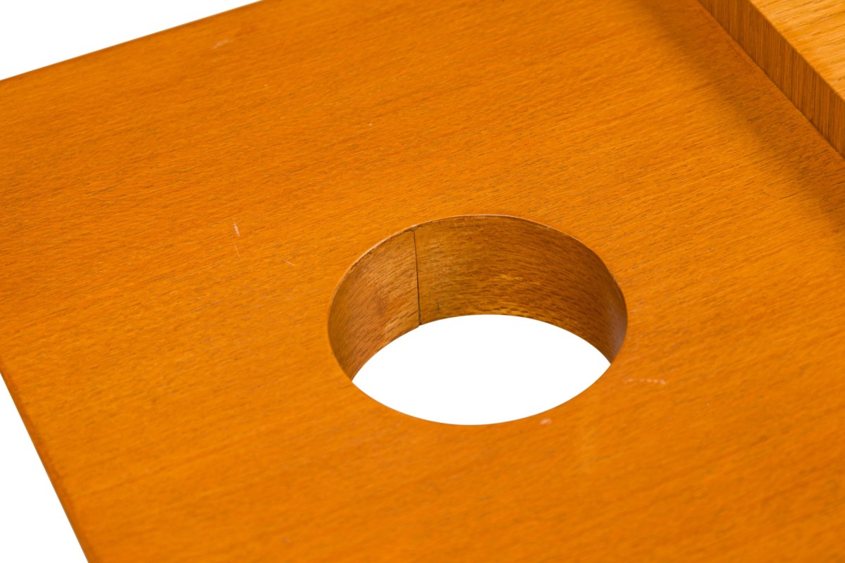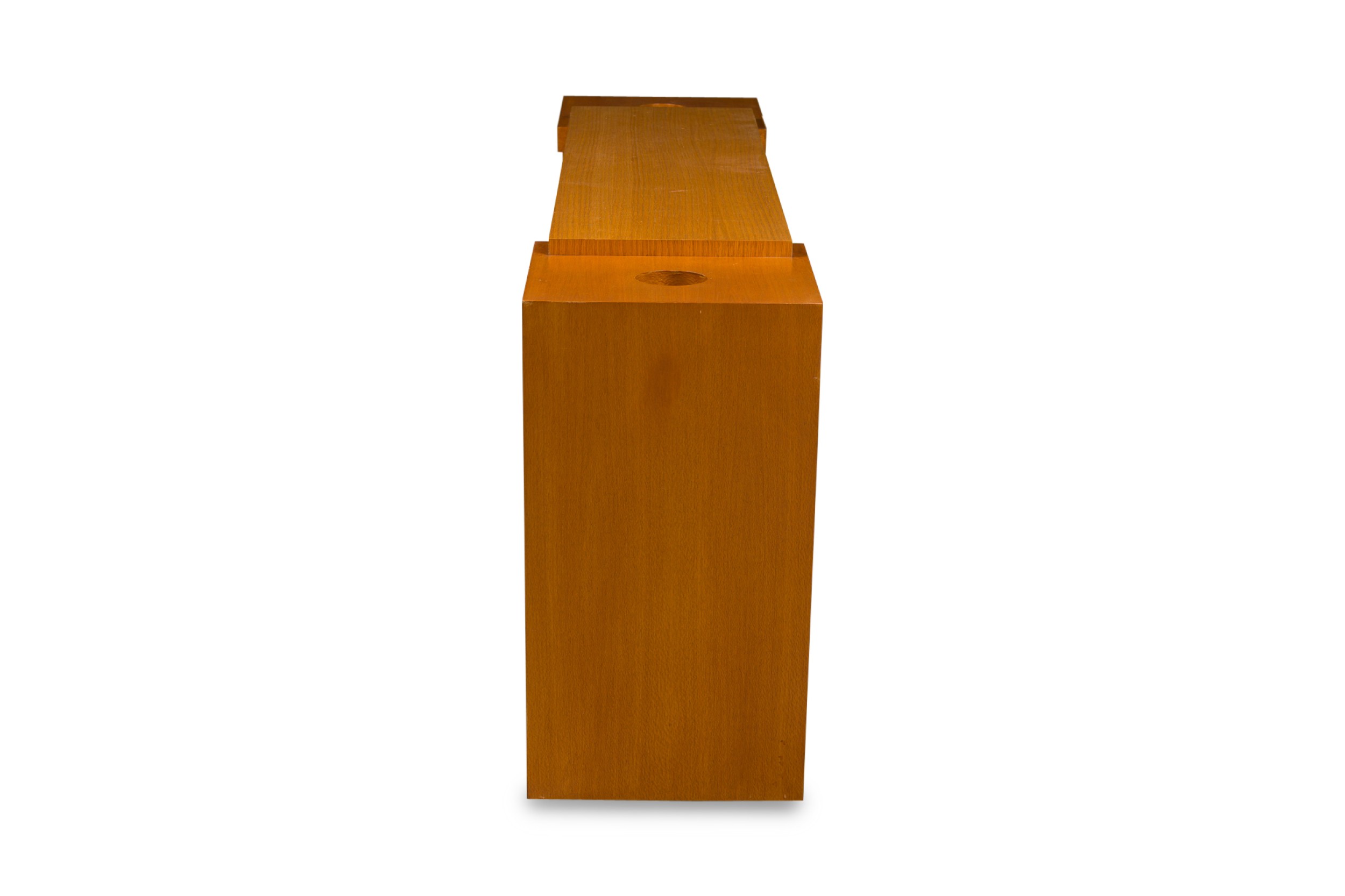 American Contemporary walnut and bleached mahogany console table with two small circular openings on both ends