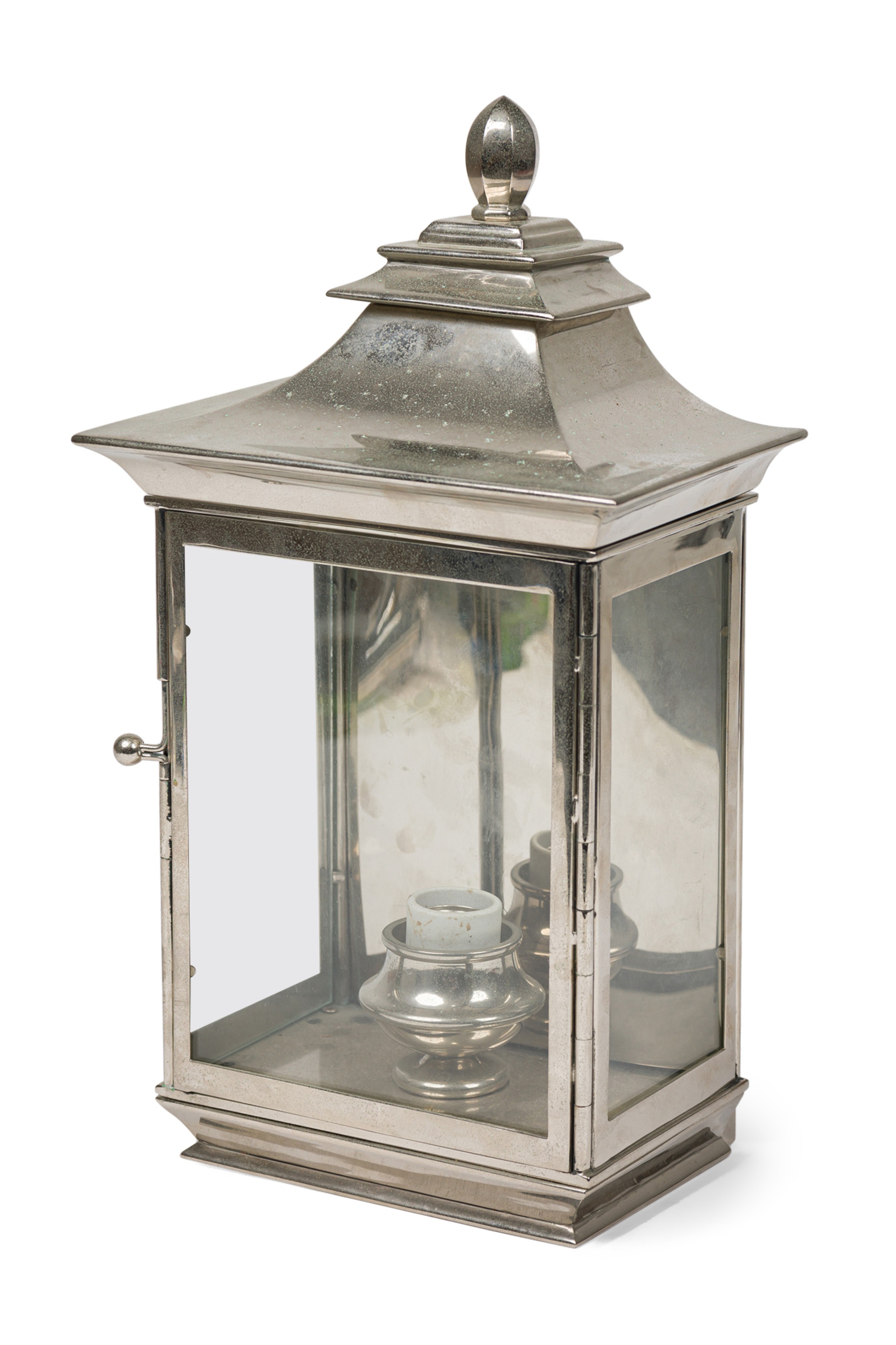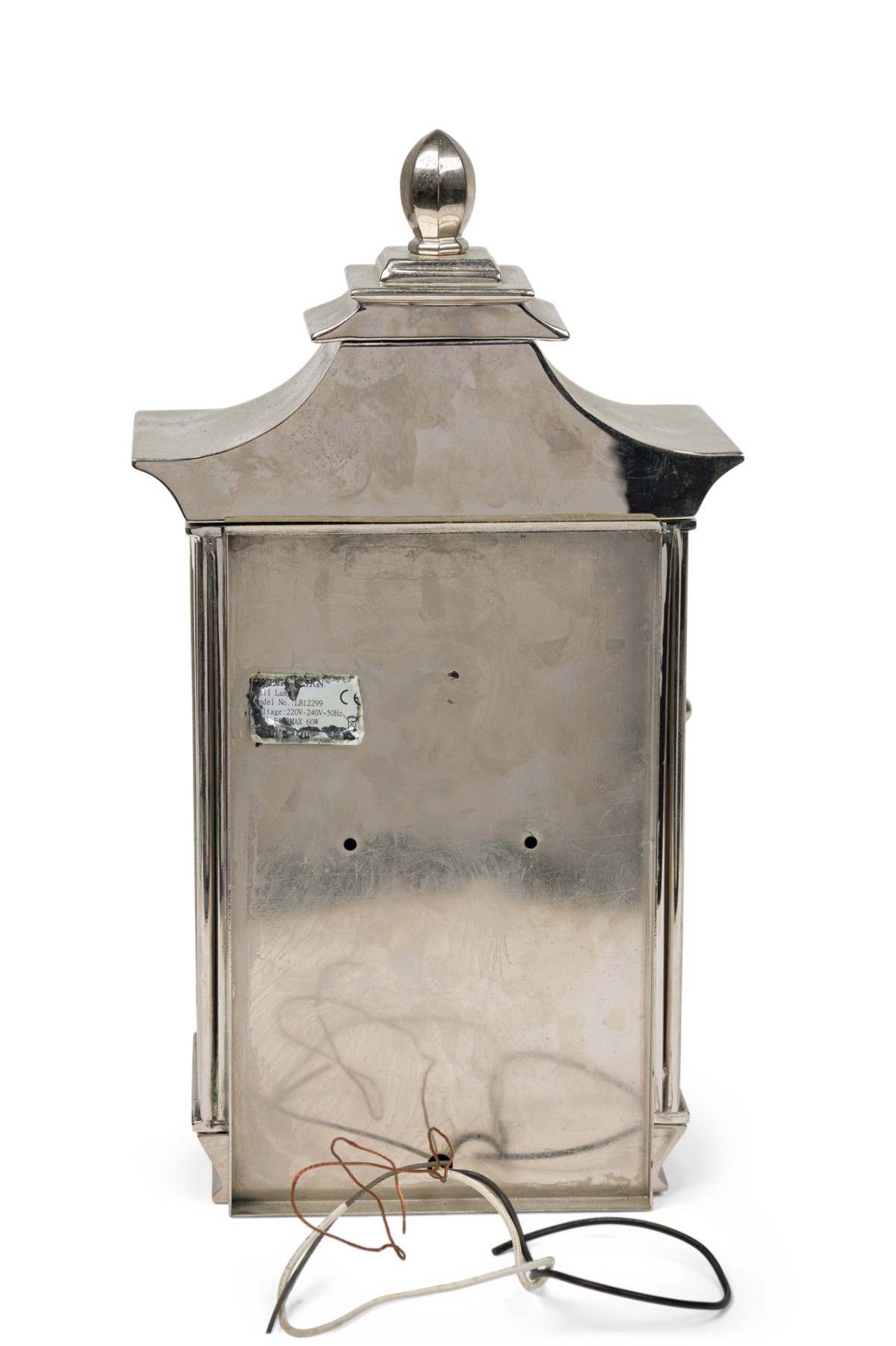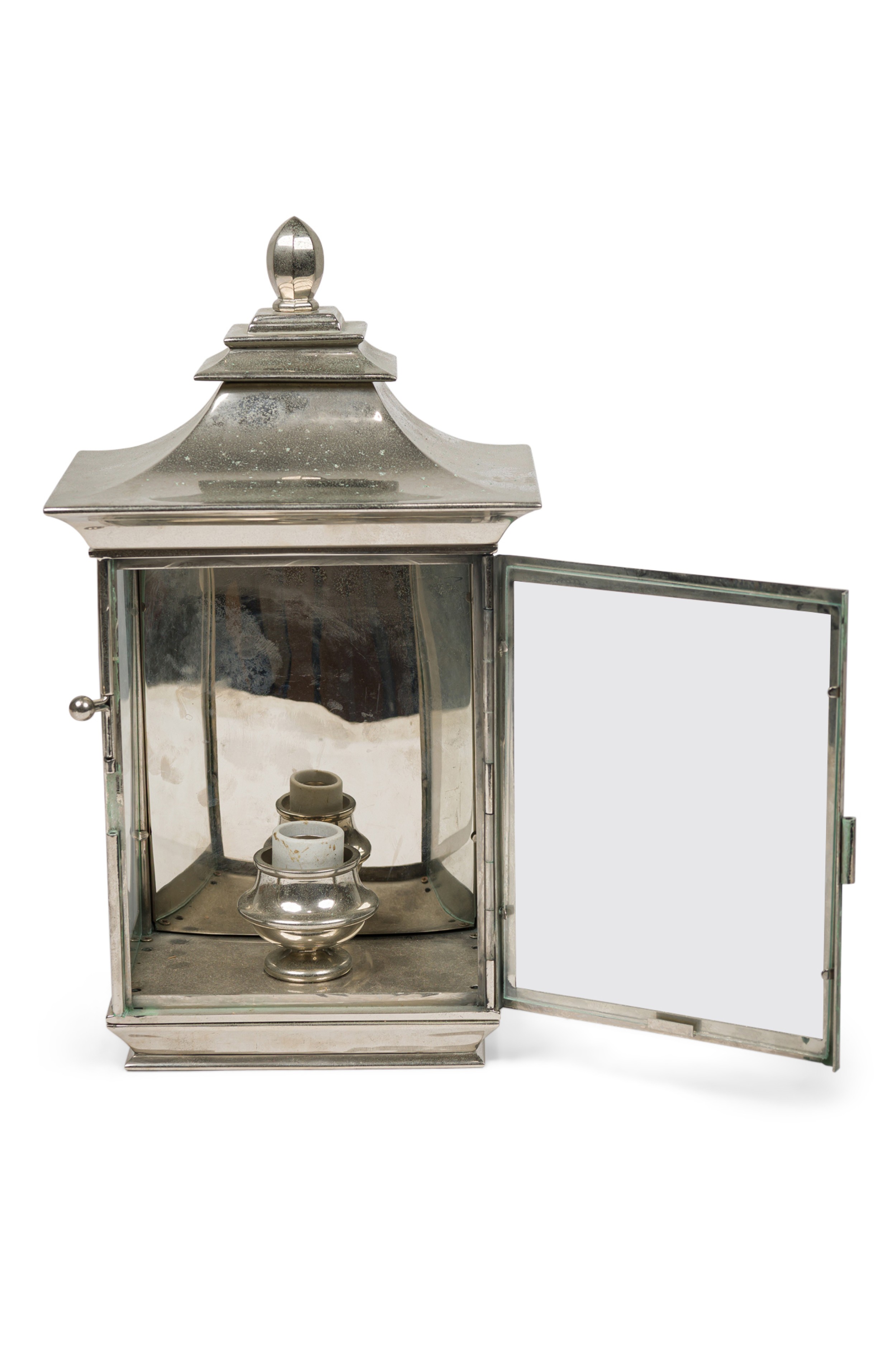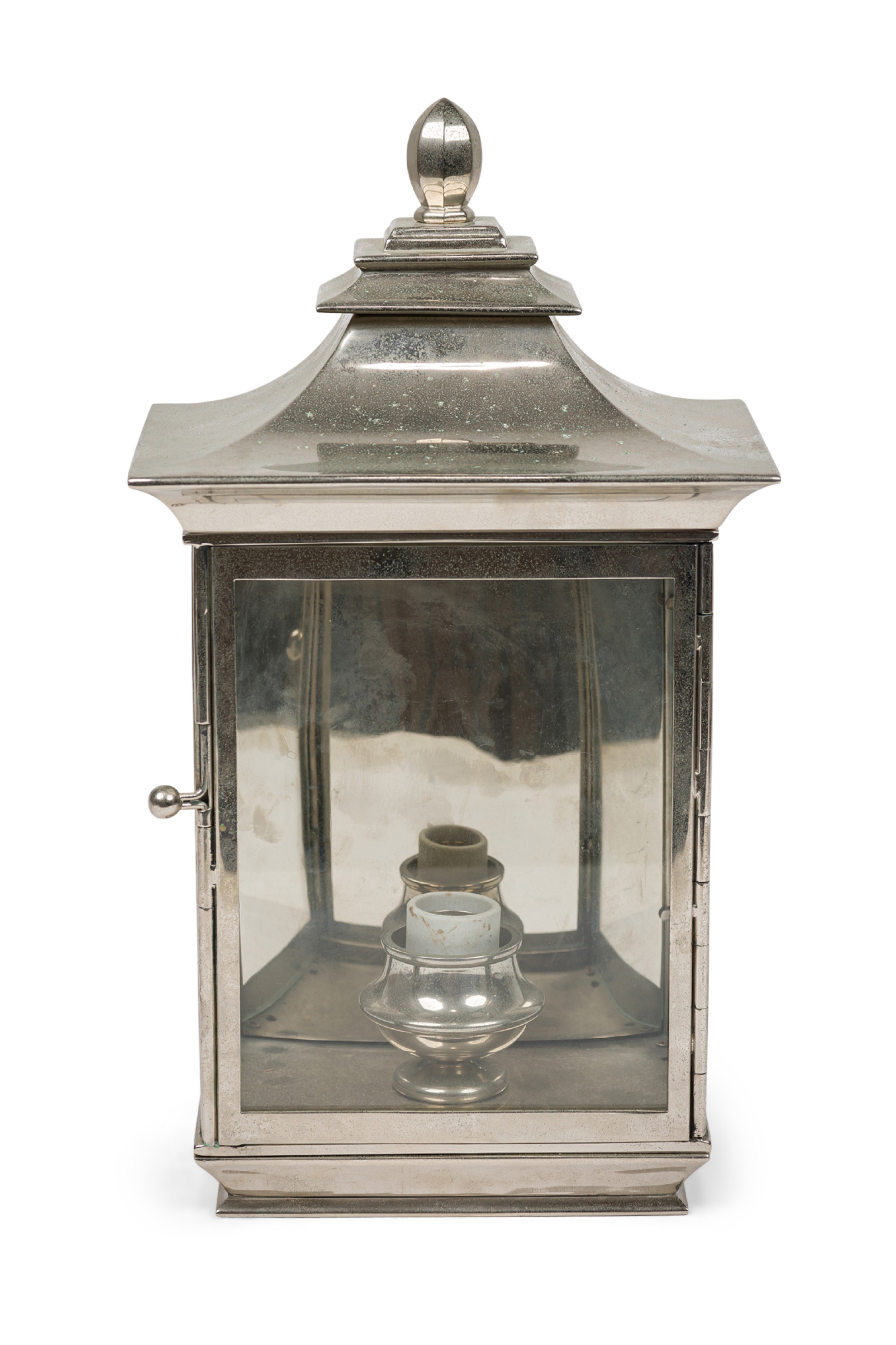 English Georgian style chromed brass wall lantern featuring a graduated two-tier pagoda top crowned with a finial and having 3 glass panels
