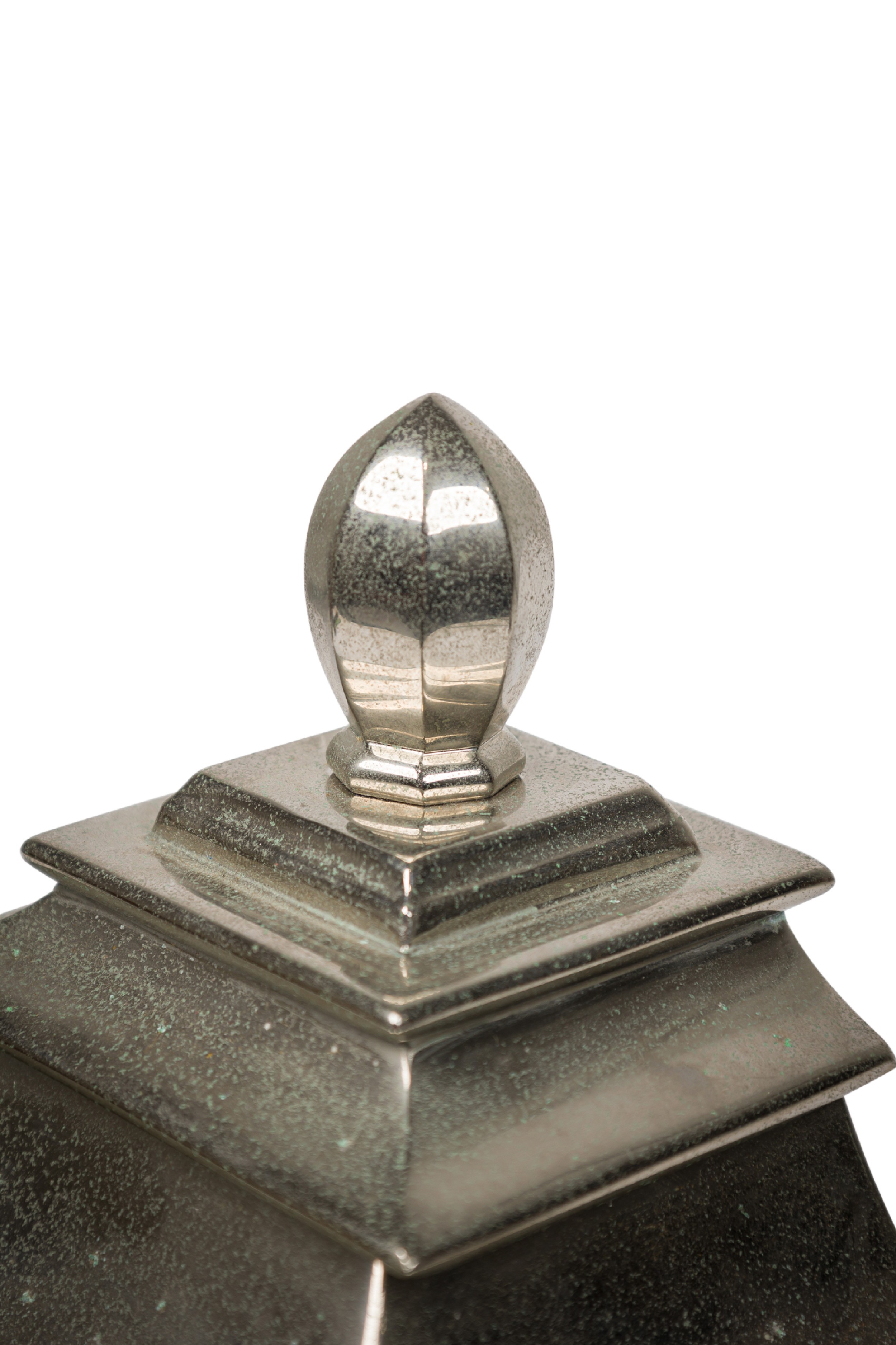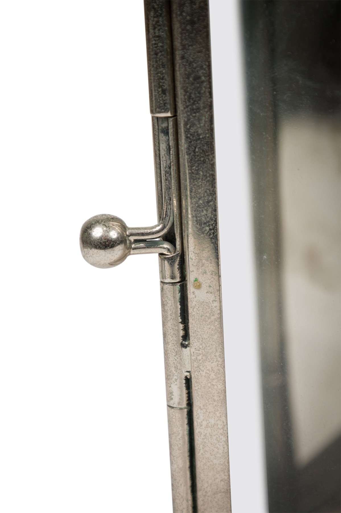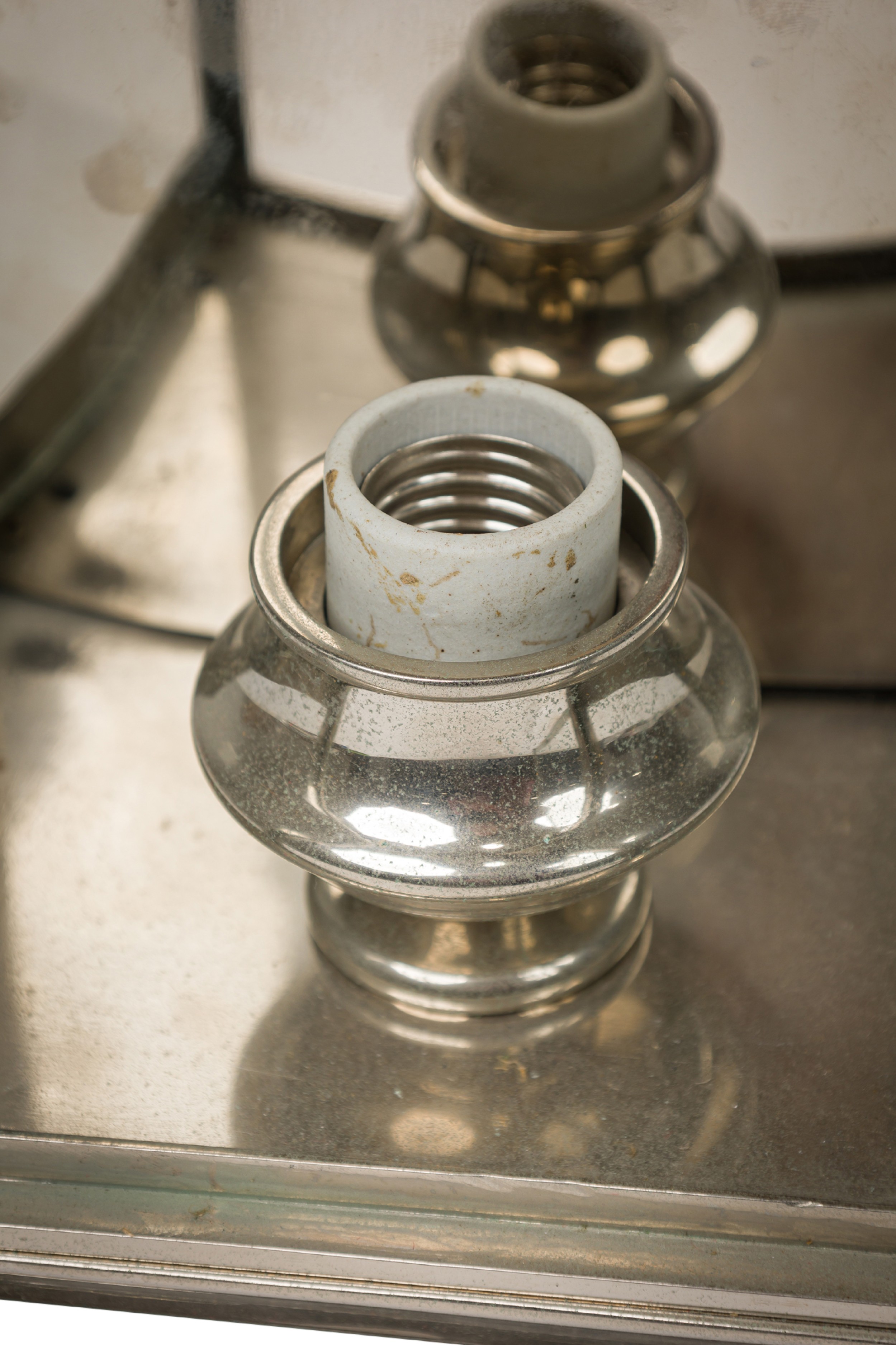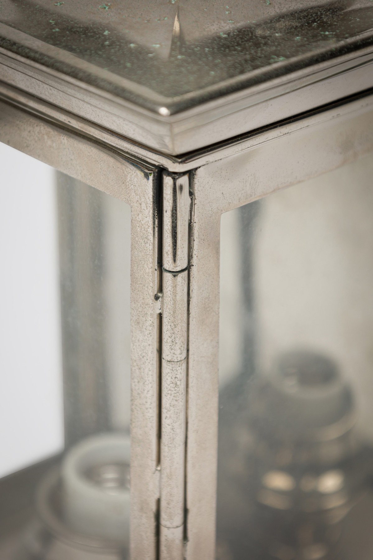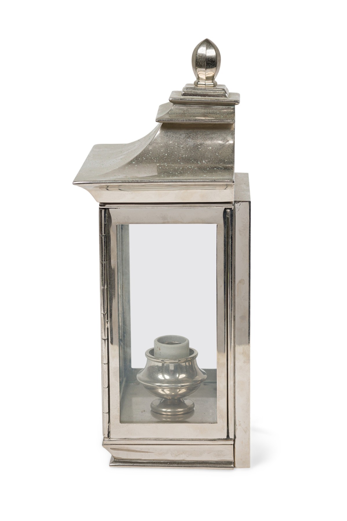 English Georgian style chromed brass wall lantern featuring a graduated two-tier pagoda top crowned with a finial and having 3 glass panels