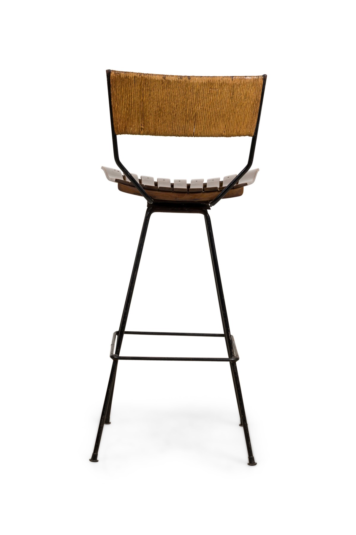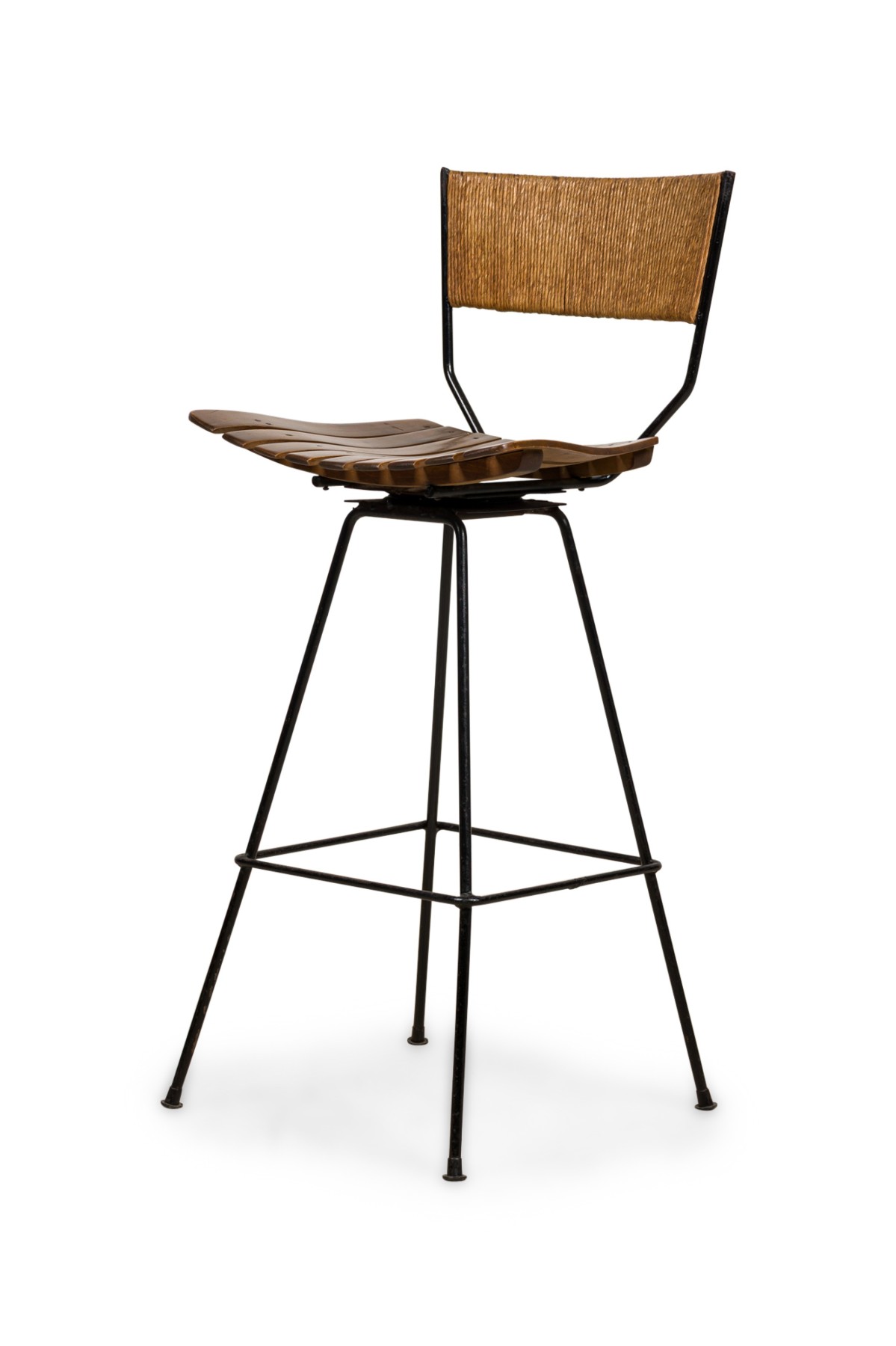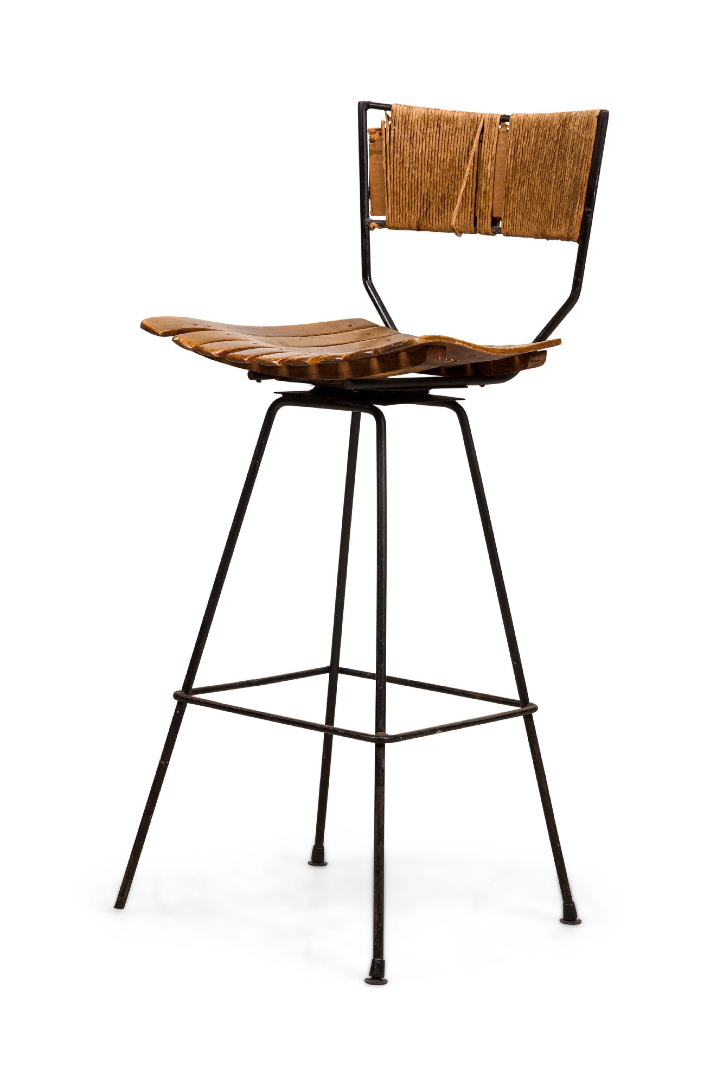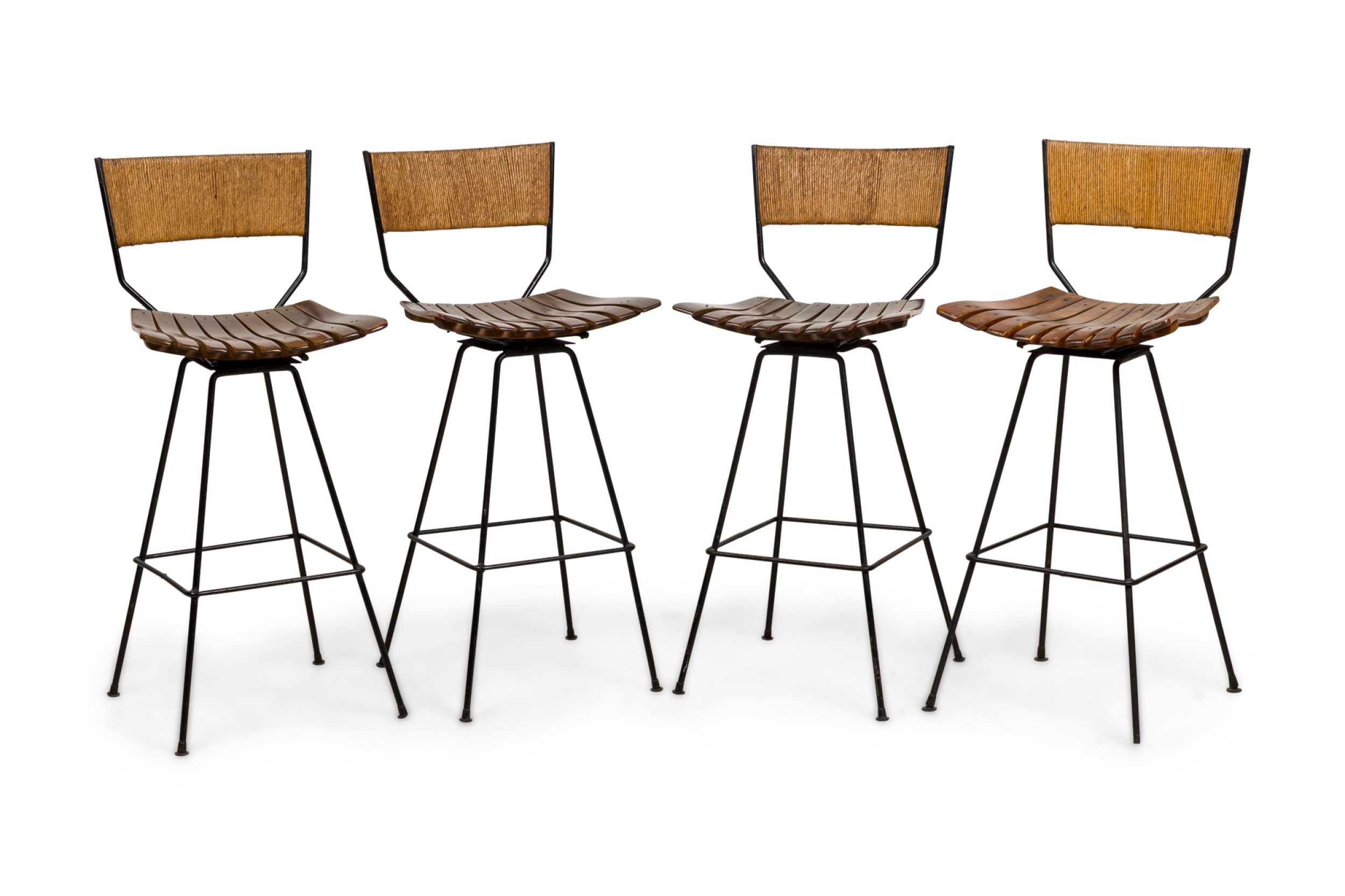 10 American Mid-Century slatted wooden swivel seat bar stools with woven rush backs and wrought iron frames. (PRICED EACH)