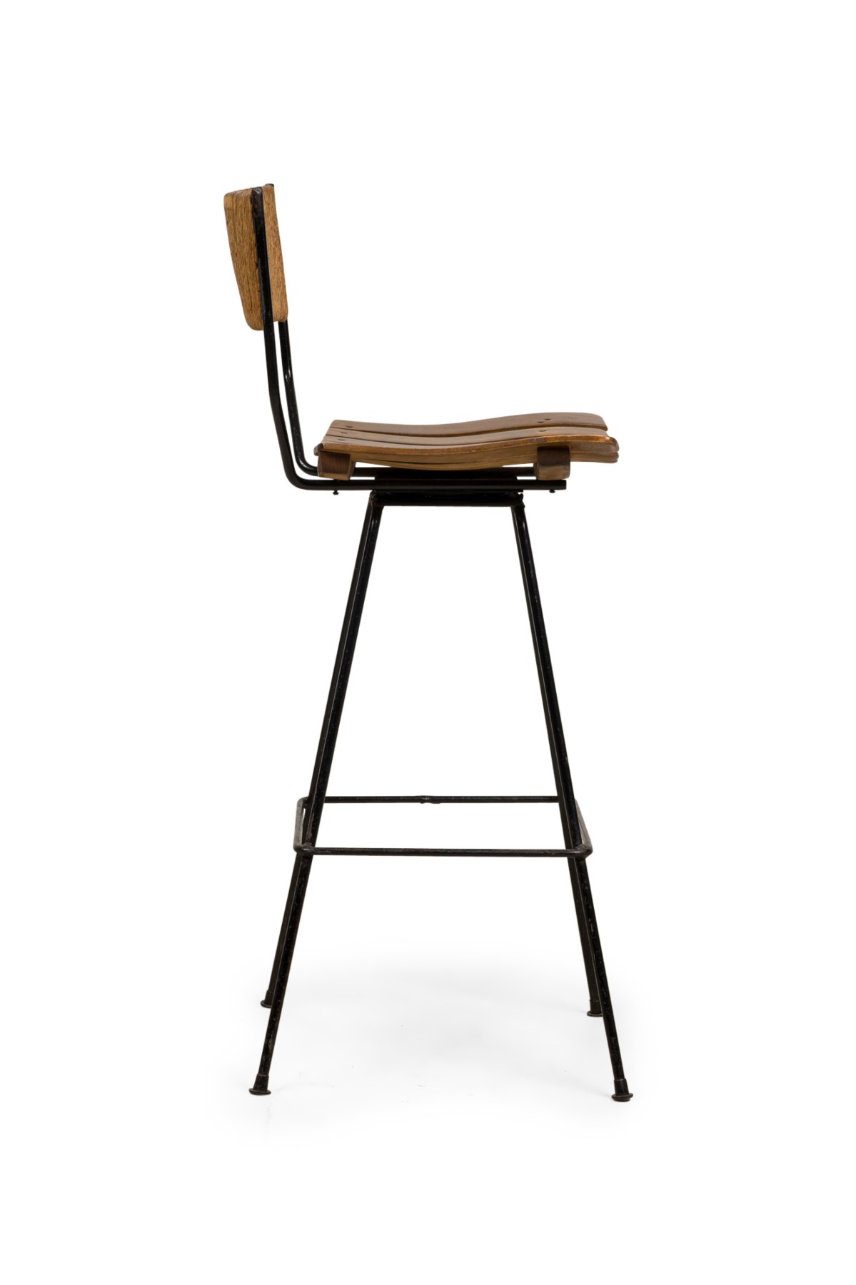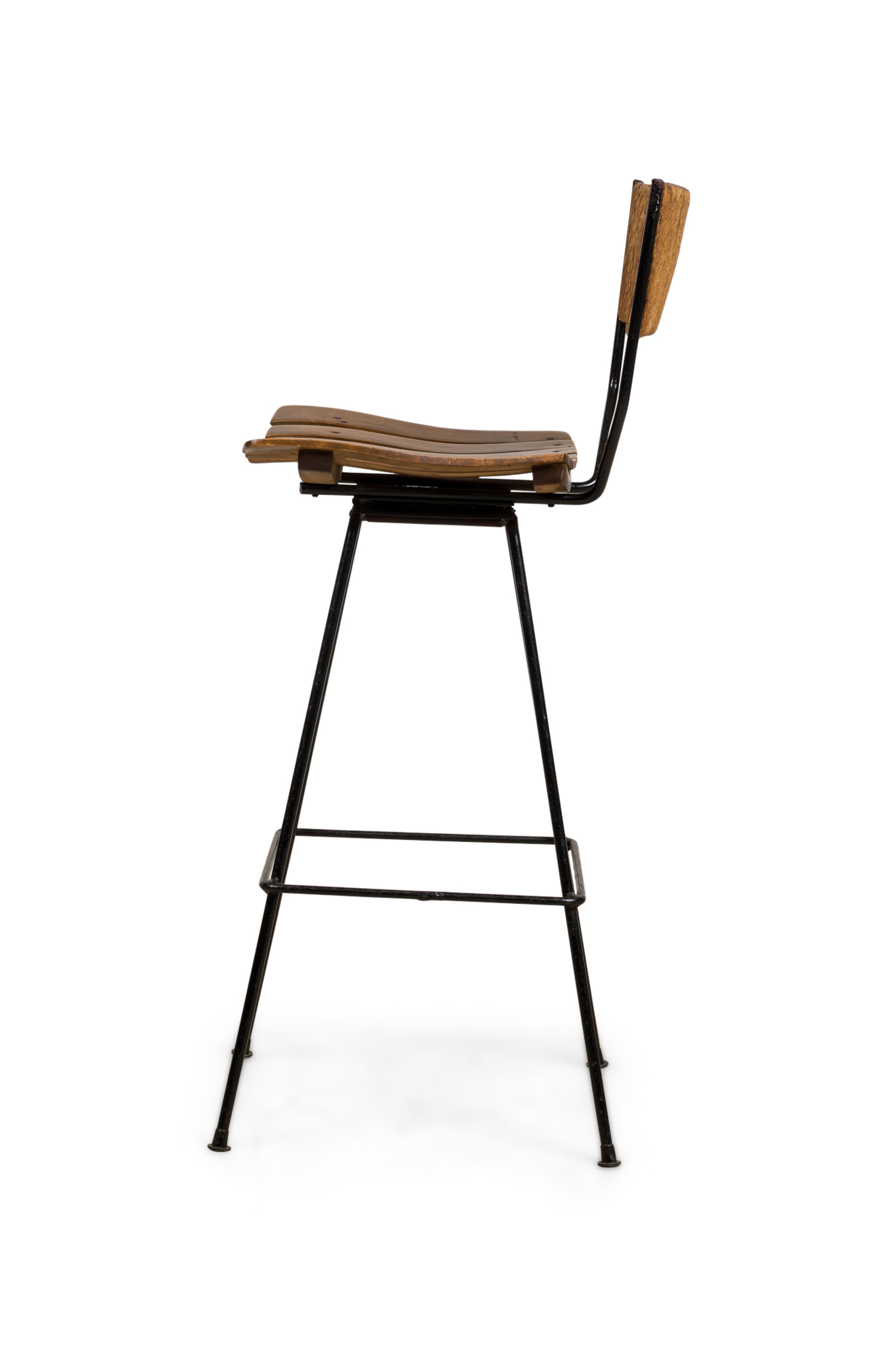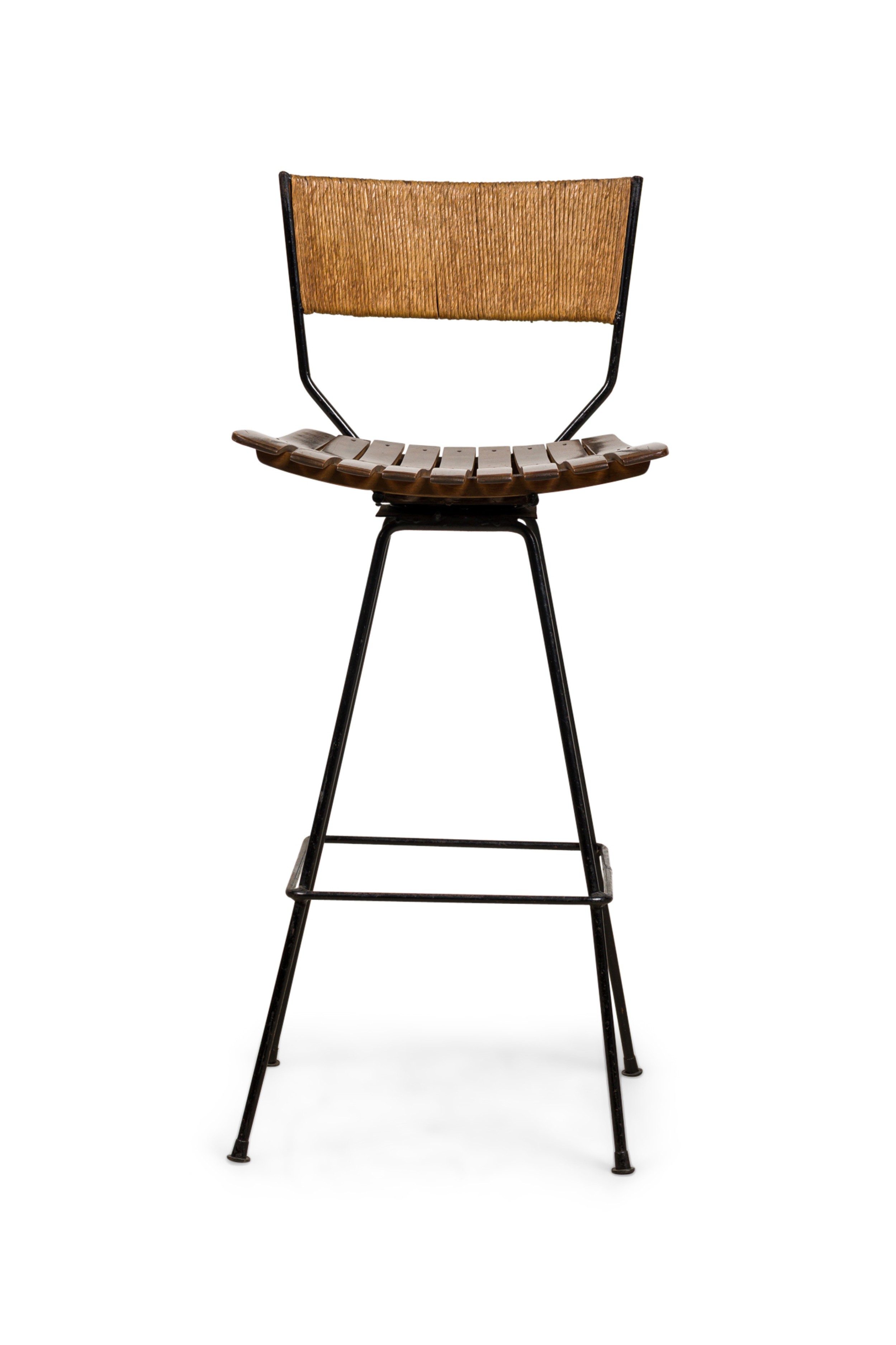 10 American Mid-Century slatted wooden swivel seat bar stools with woven rush backs and wrought iron frames. (PRICED EACH)