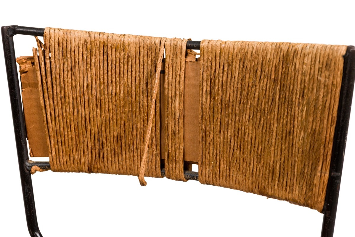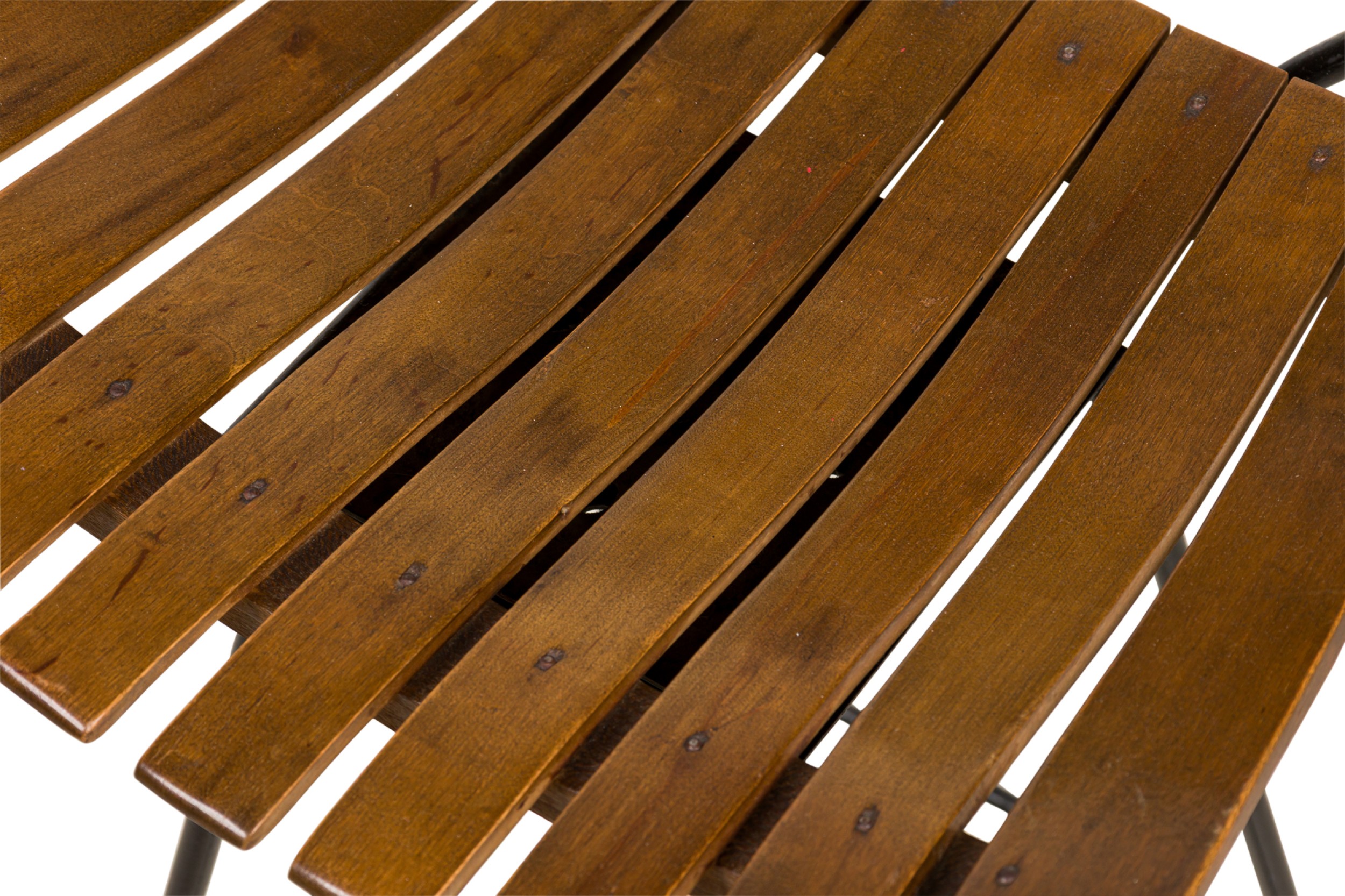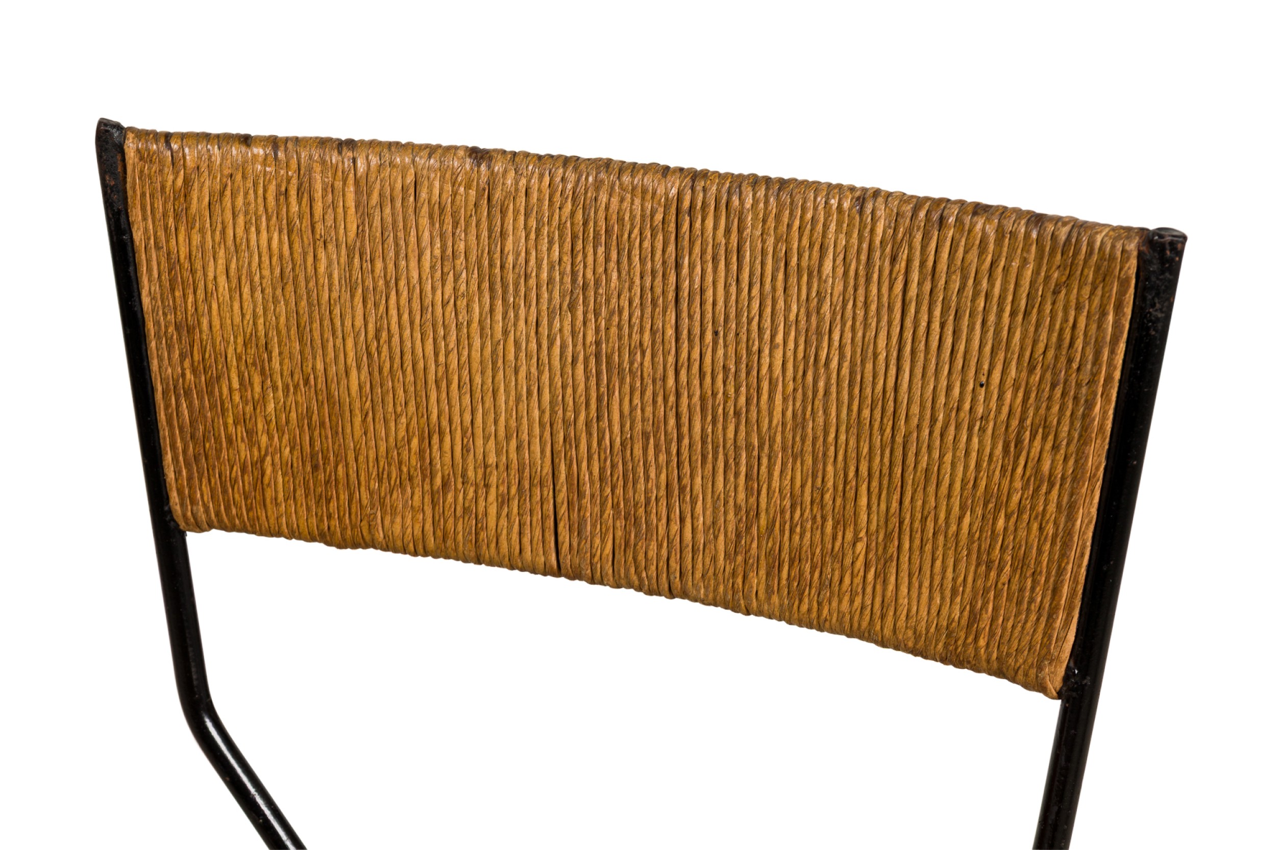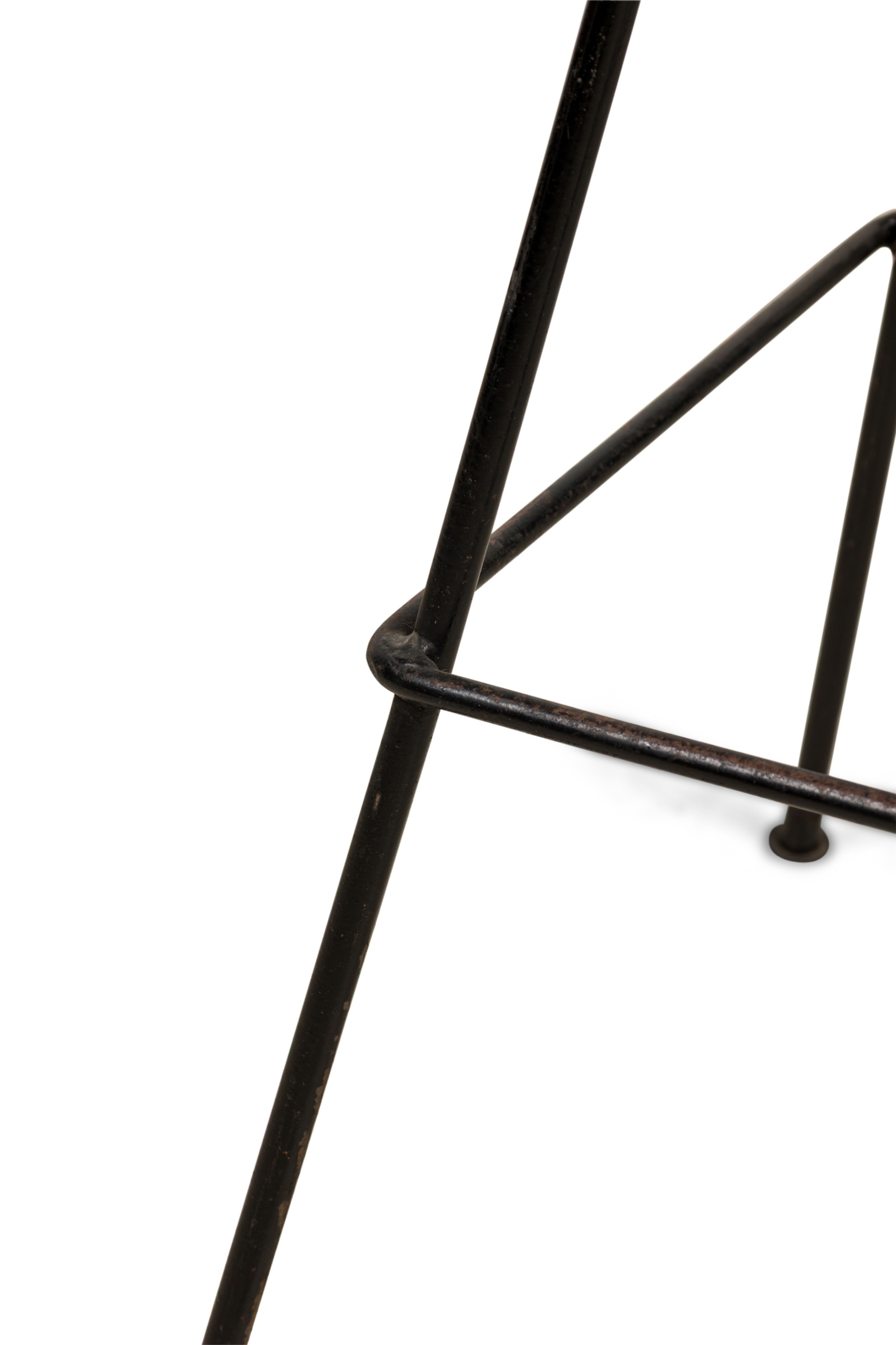 10 American Mid-Century slatted wooden swivel seat bar stools with woven rush backs and wrought iron frames. (PRICED EACH)