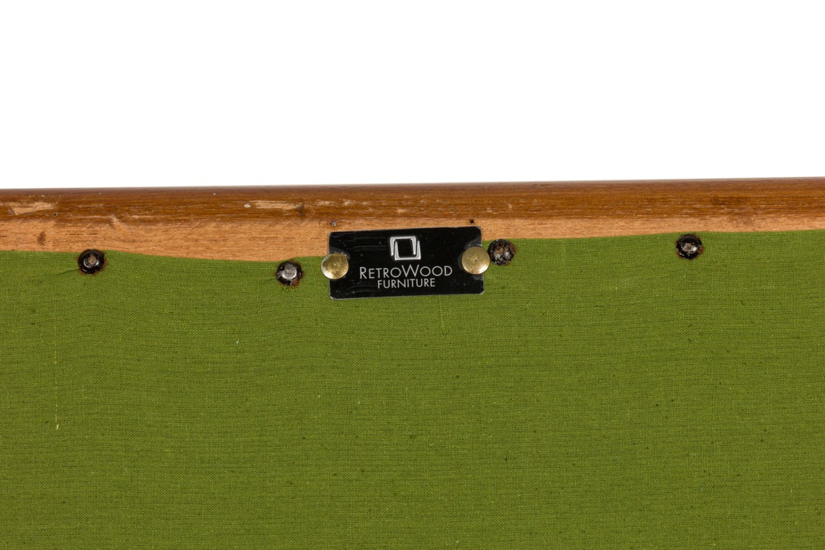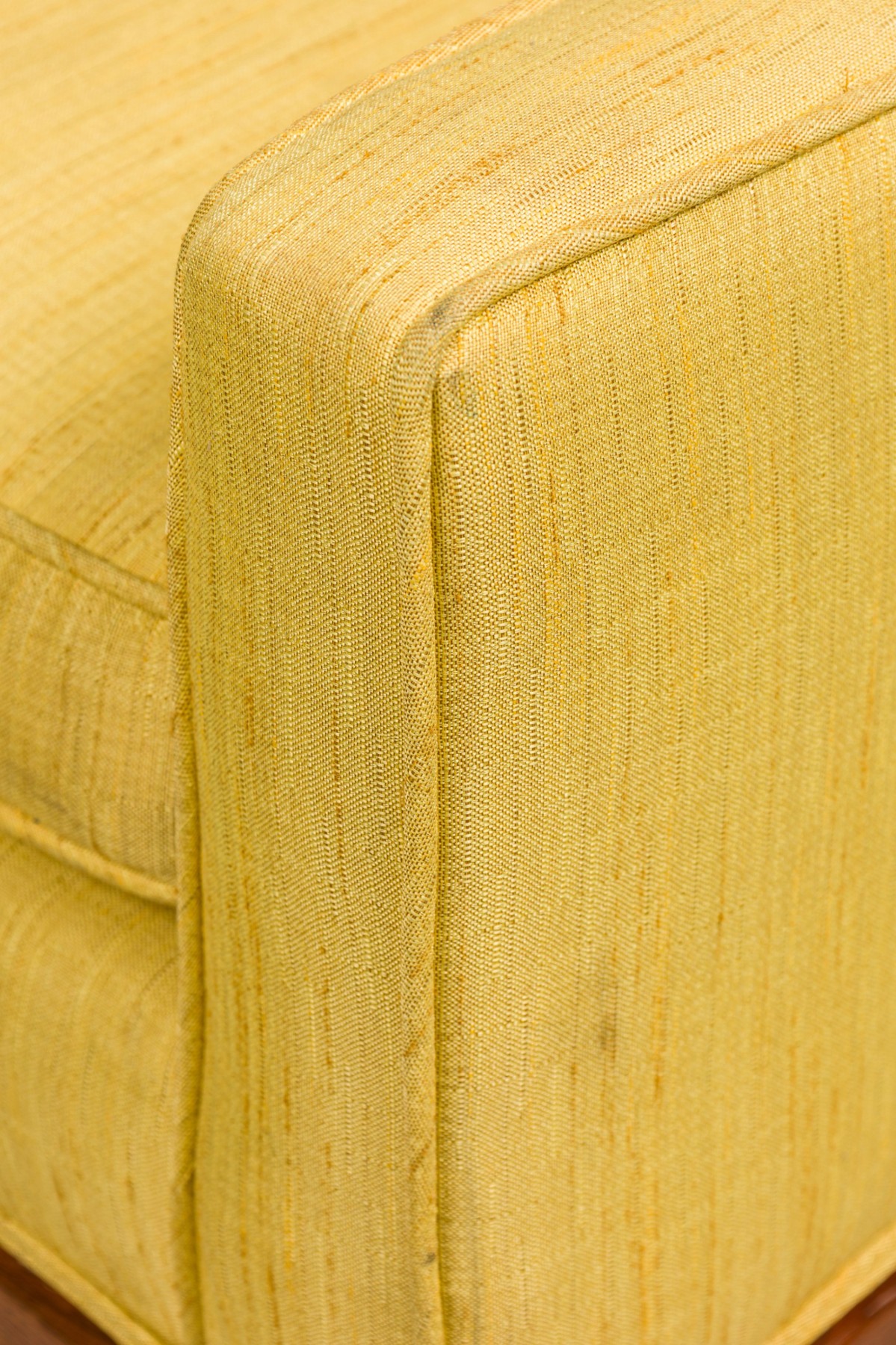 American Mid-Century square back yellow fabric upholstered armchairs with piping on the edges with a seat cushion, ending on tapered and splayed wooden legs. (5 side chairs 064288C; 2 sofas 064288A)(PRICED EACH)
