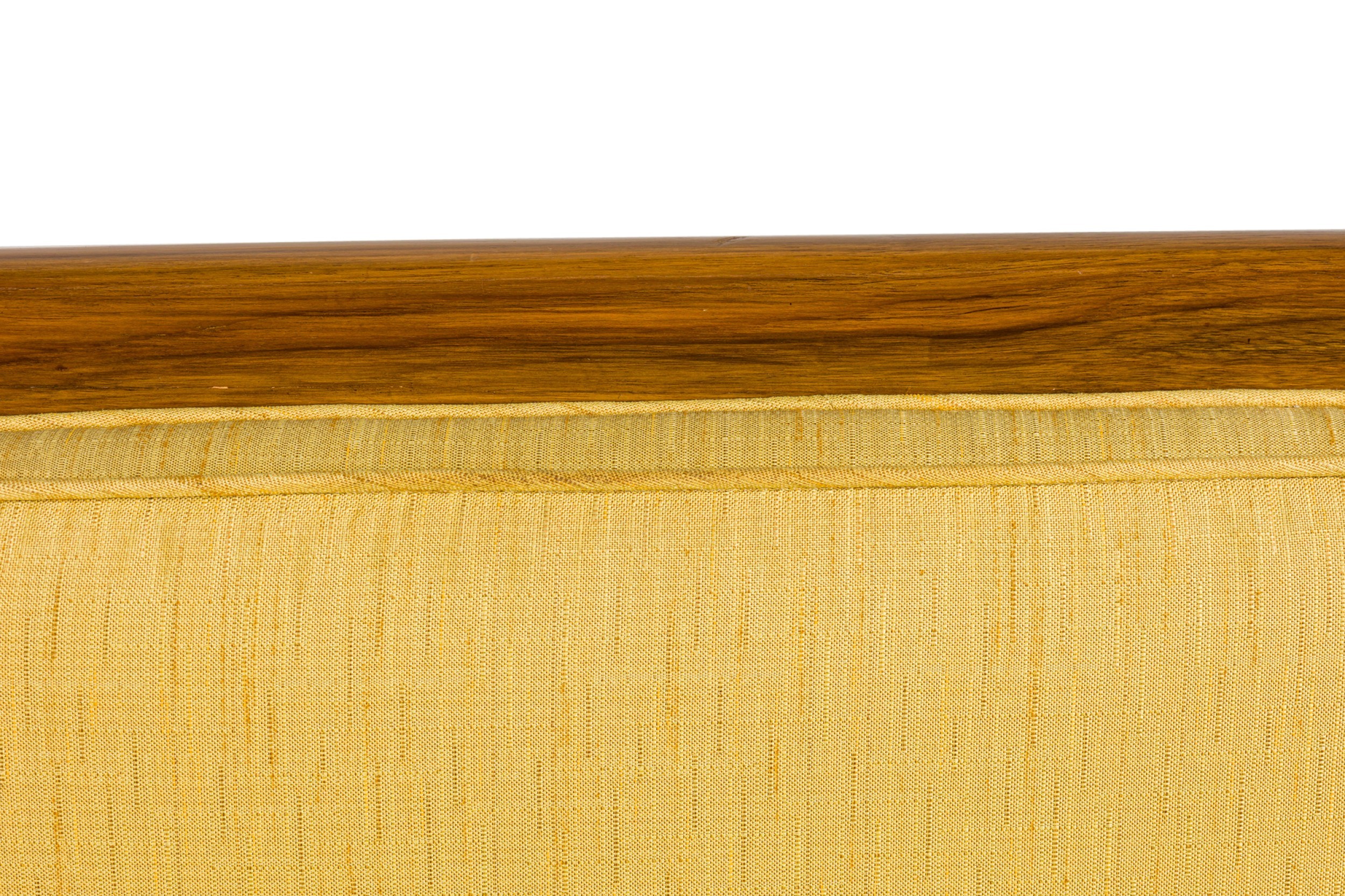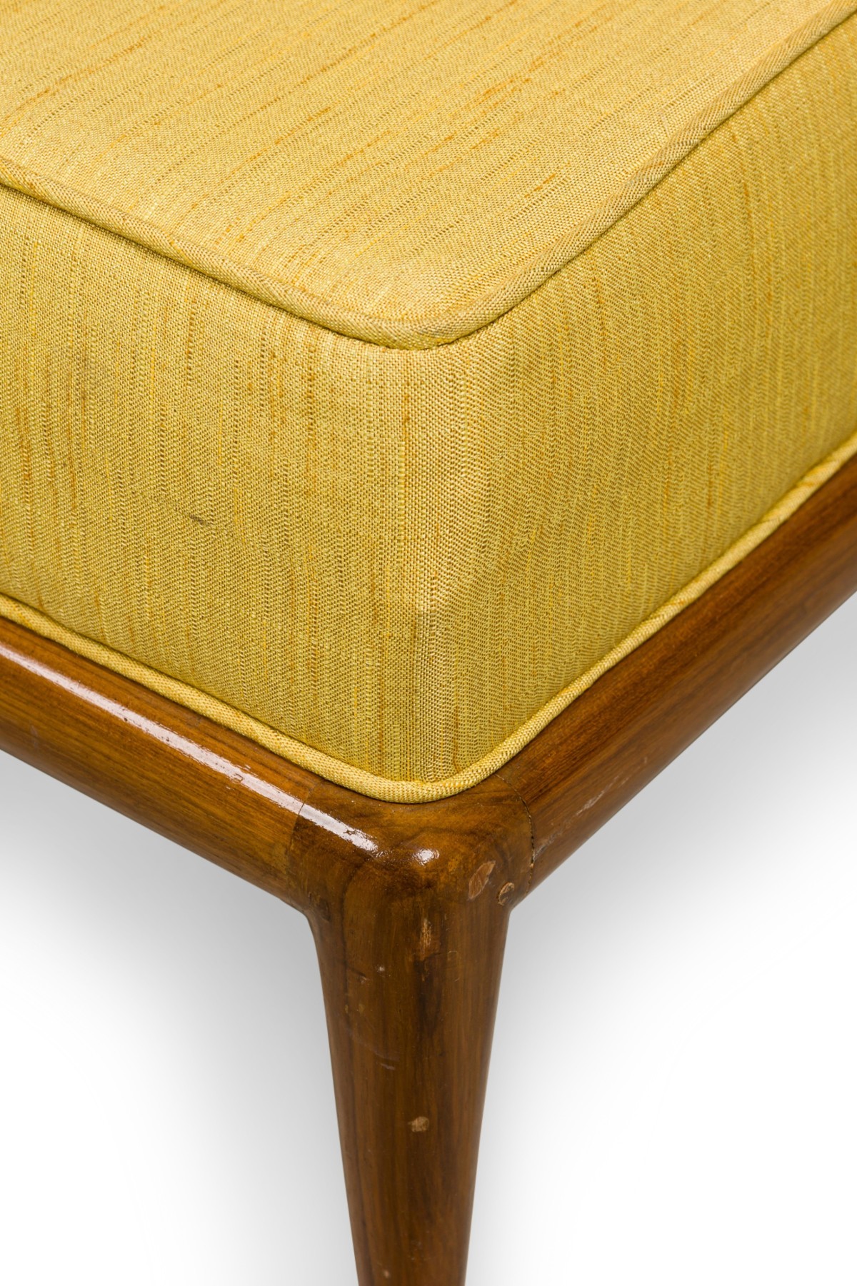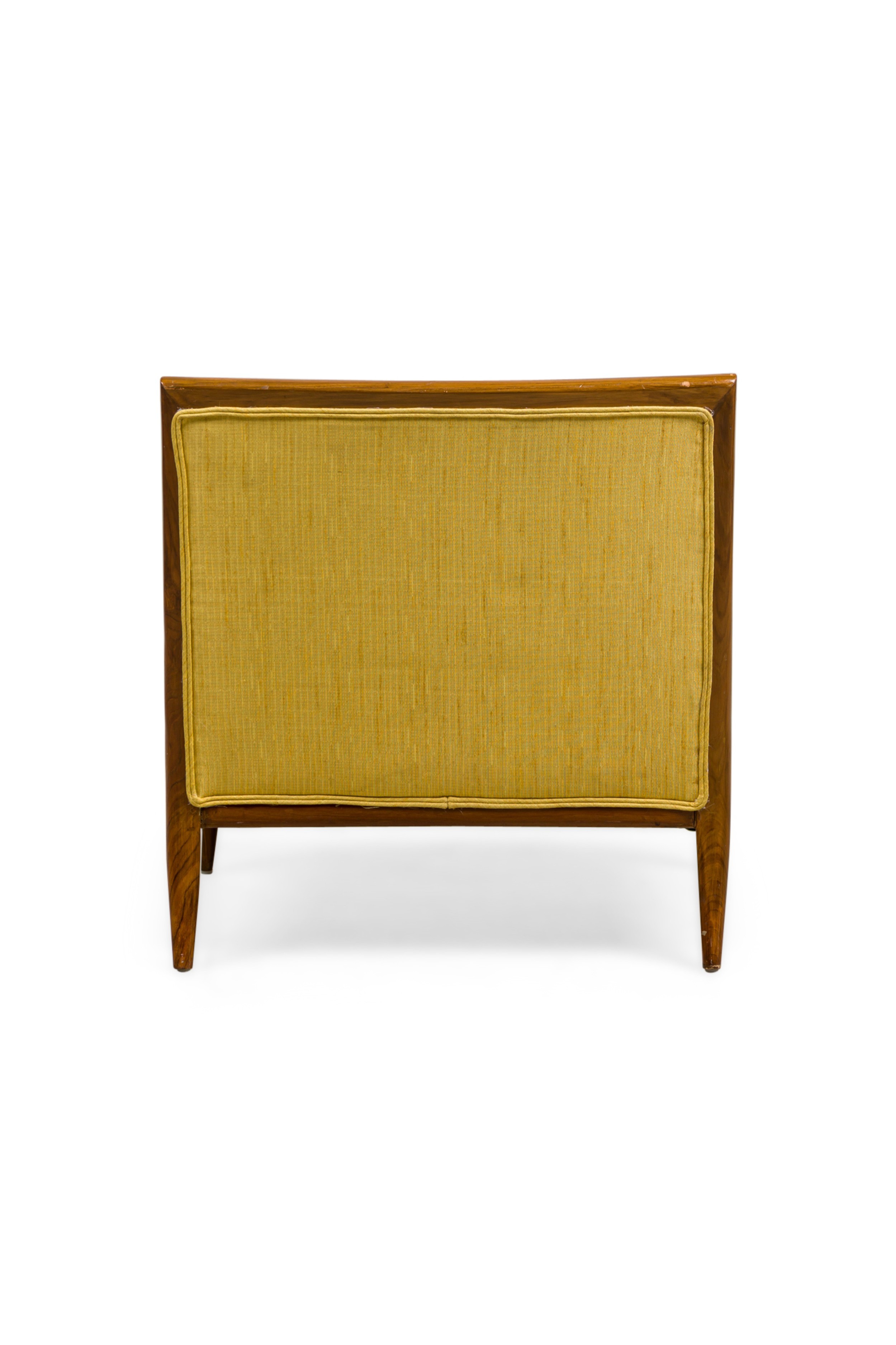 5 American Mid-Century square back yellow fabric upholstered lounge / side chairs with piping on the edges ending on tapered and splayed wooden legs. (matching: arm 064288B, 2 sofas 064288A)(PRICED EACH)