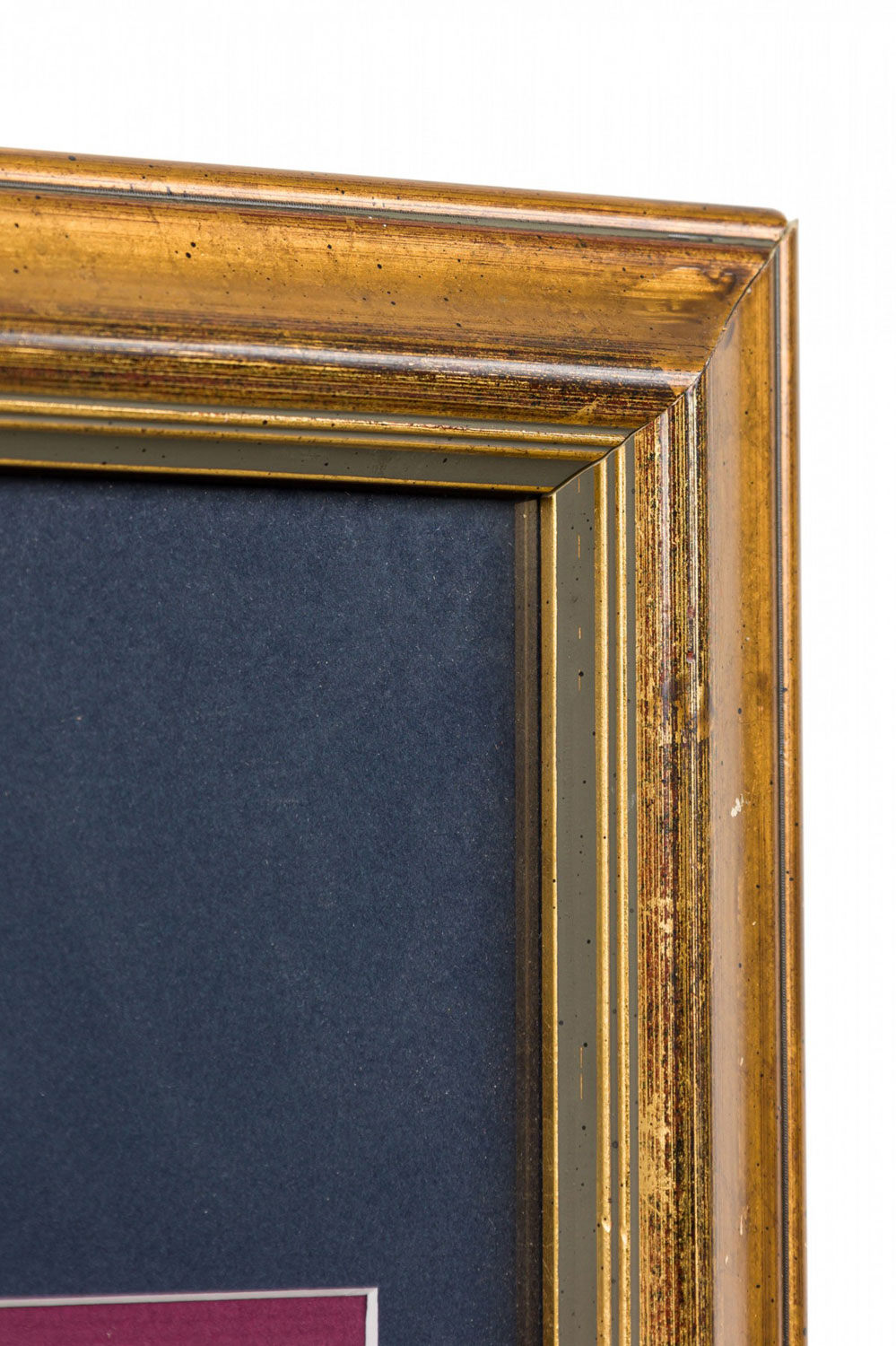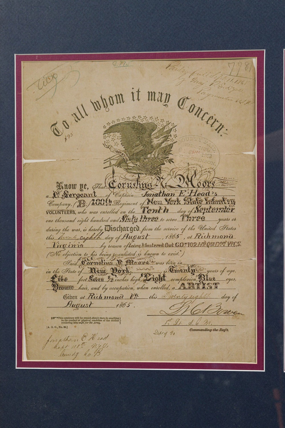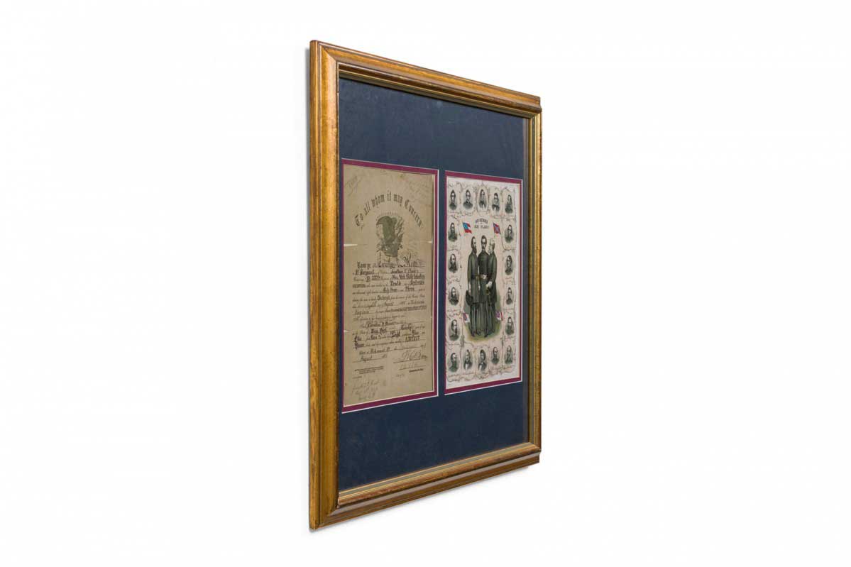 American 19th Century military discharge document matted next to a copy of a Civil War lithograph commemorating soldiers in a blue mat with a gold wooden frame.