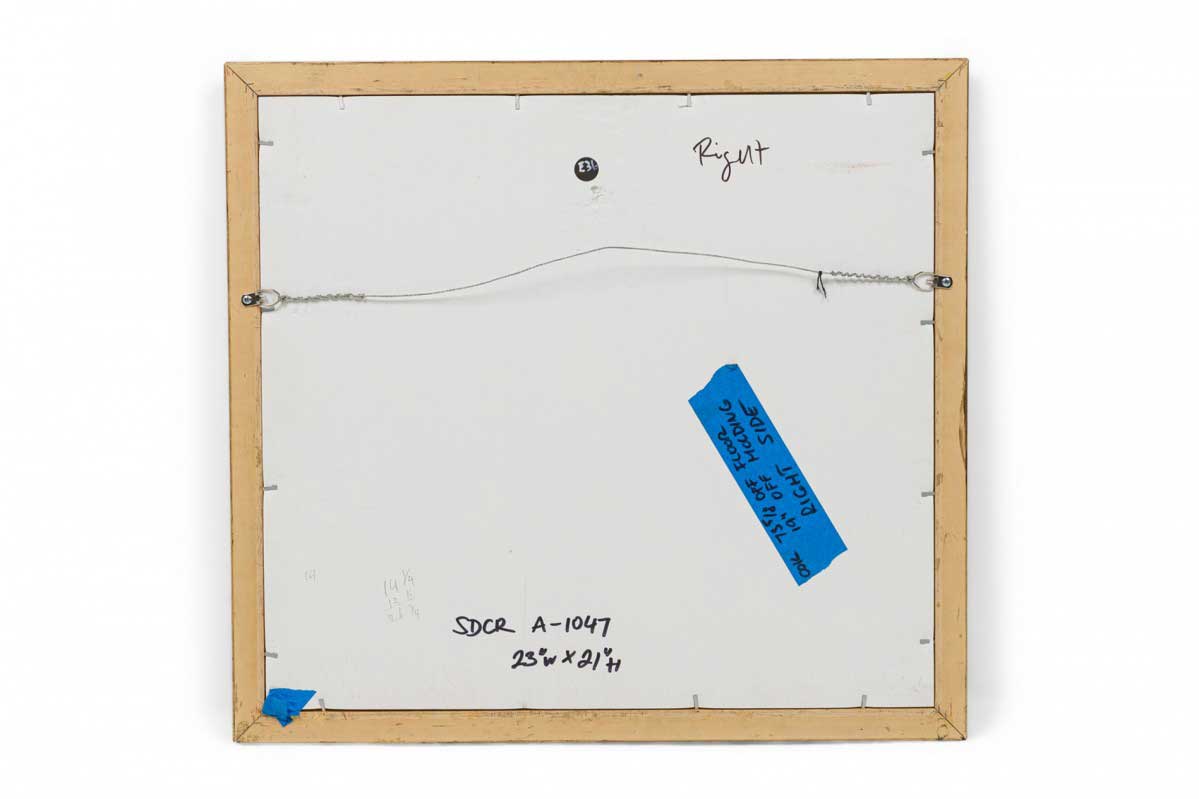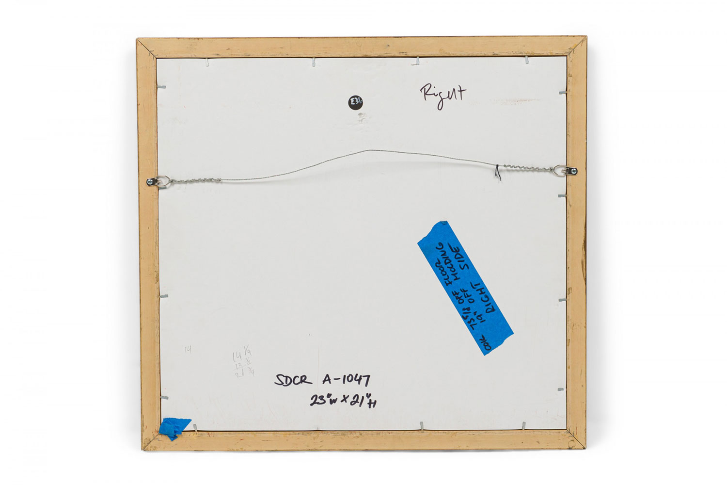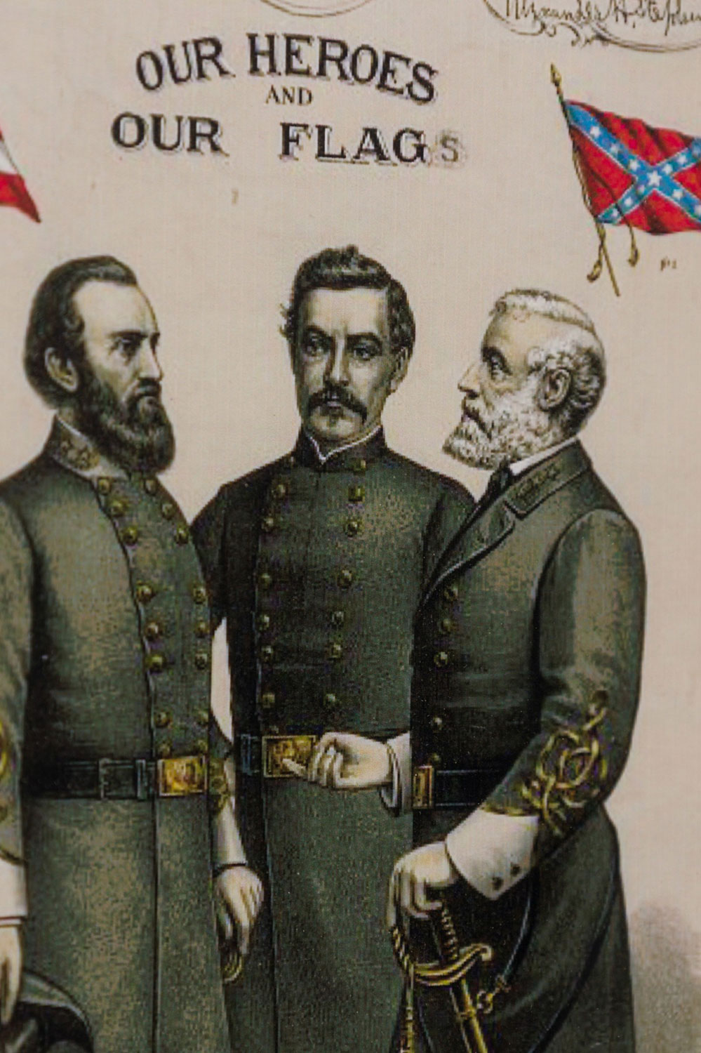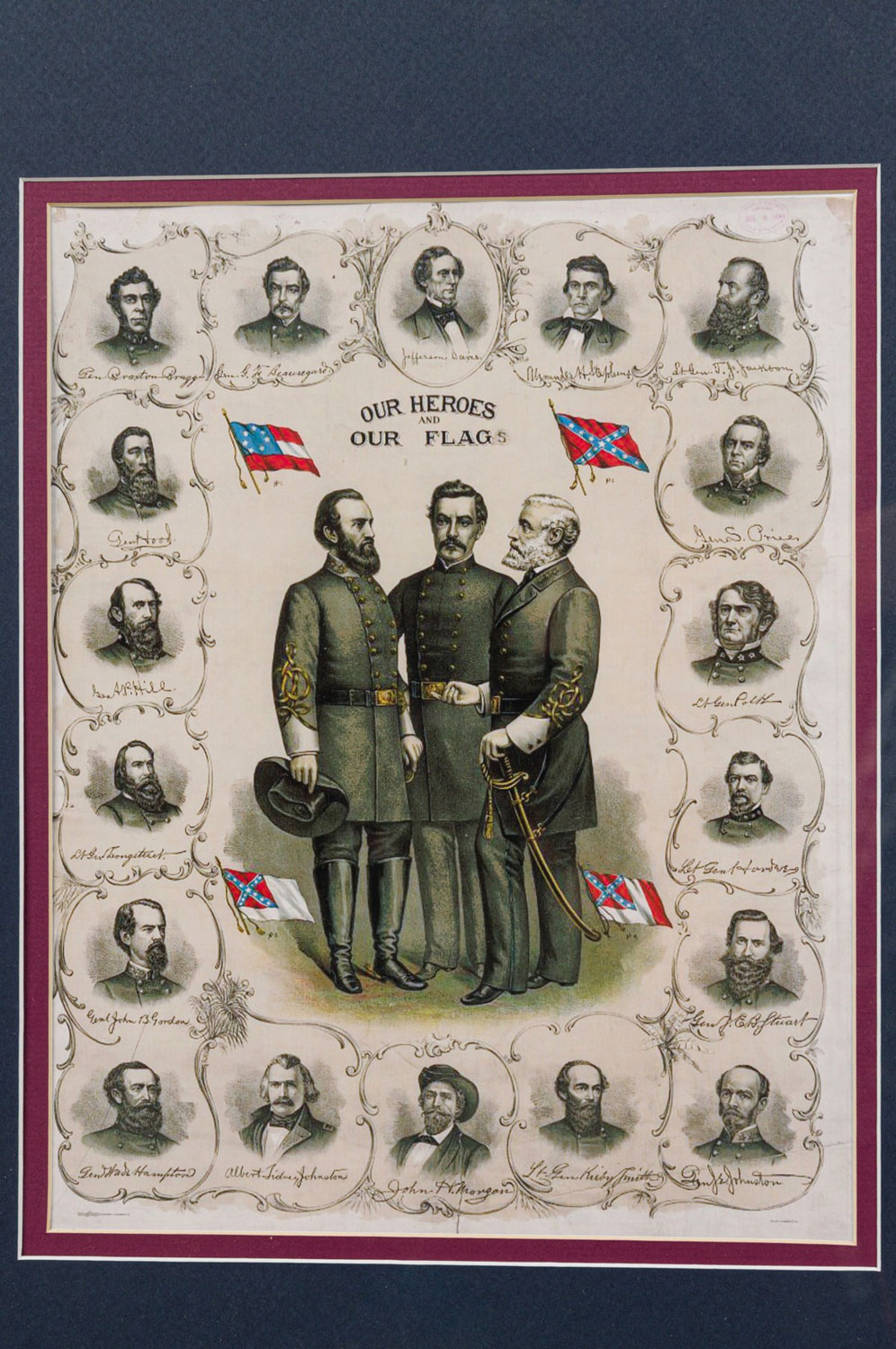 American 19th Century military discharge document matted next to a copy of a Civil War lithograph commemorating soldiers in a blue mat with a gold wooden frame.