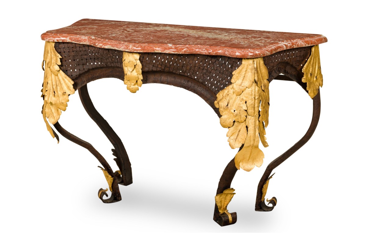 2 French Art Deco console tables with wrought iron frames featuring basket woven aprons resting on cabriole wrought iron legs, accented with gilt iron leaves and central medallions and topped with shaped blush marble tops. (PRICED EACH)