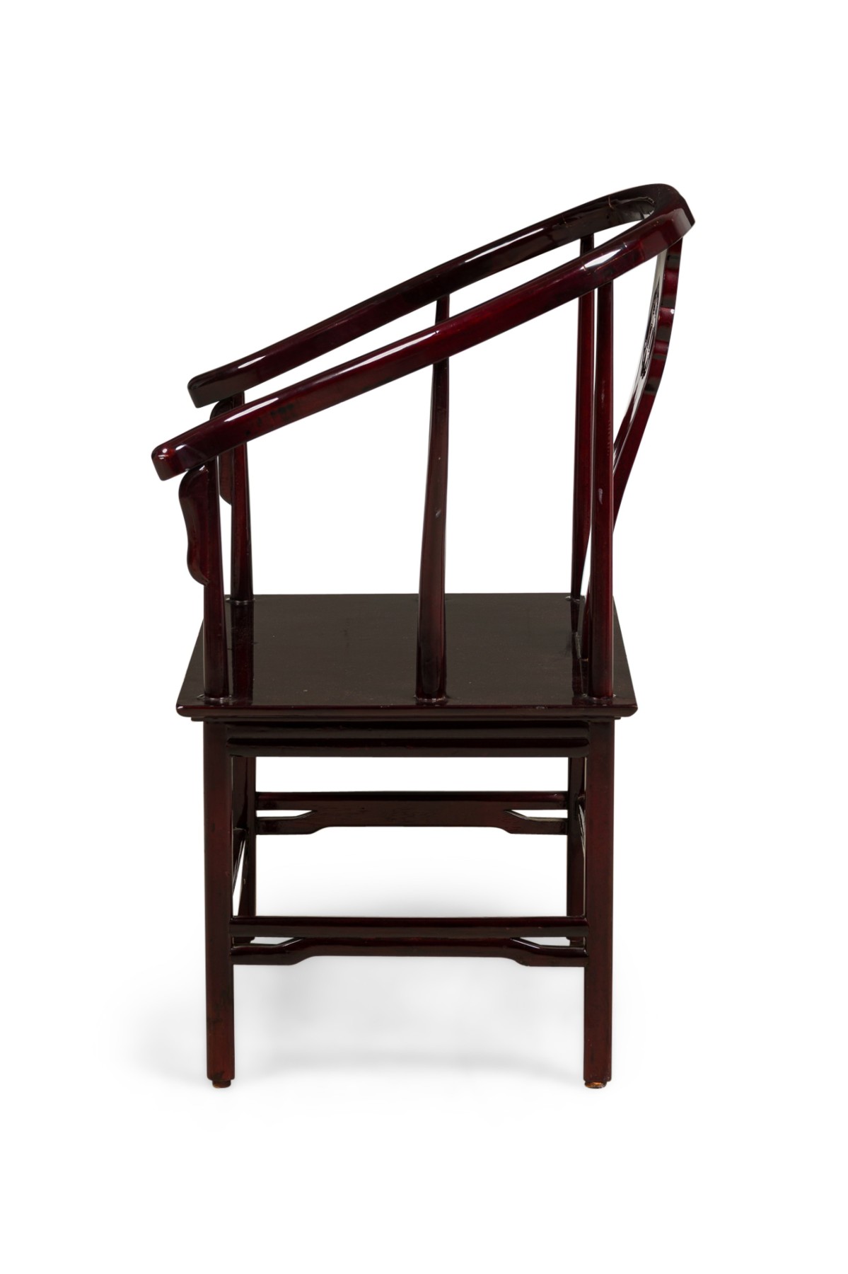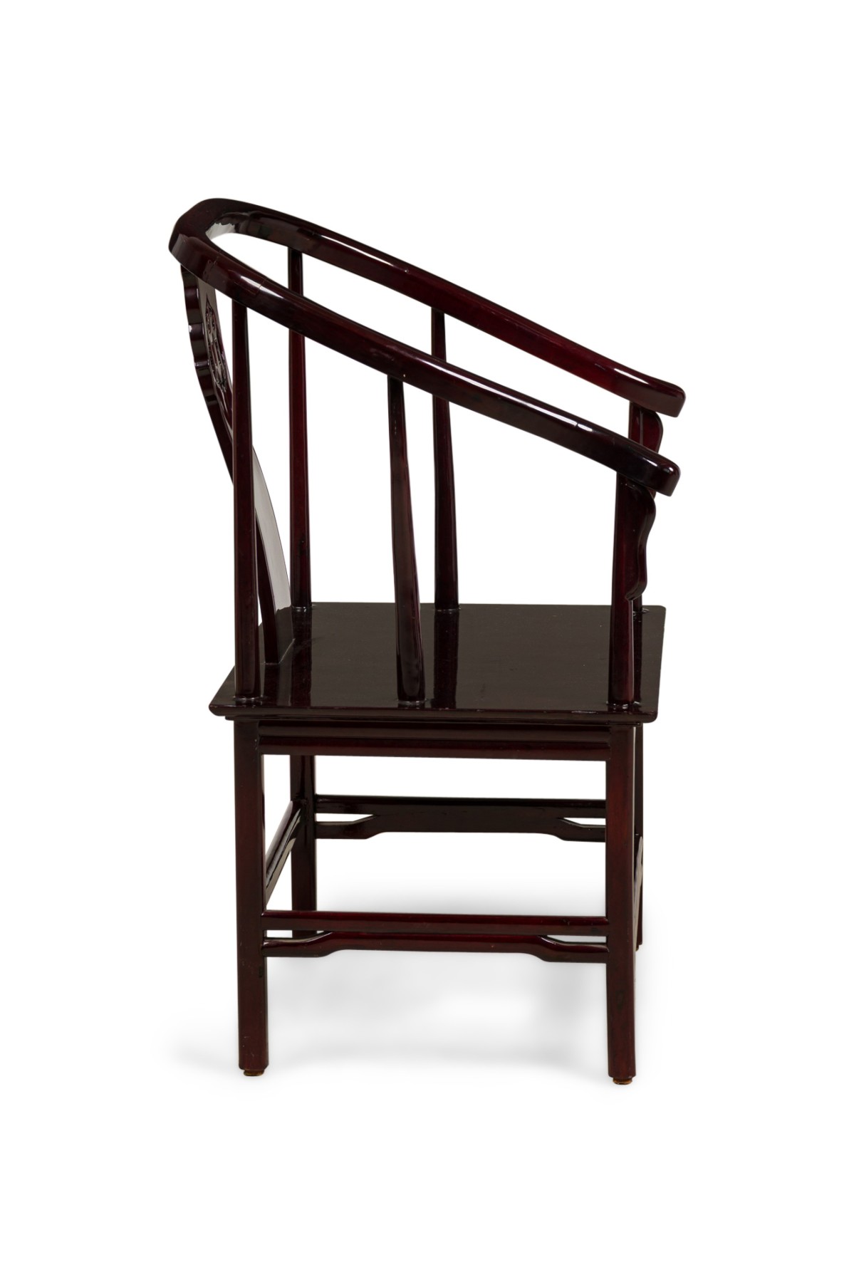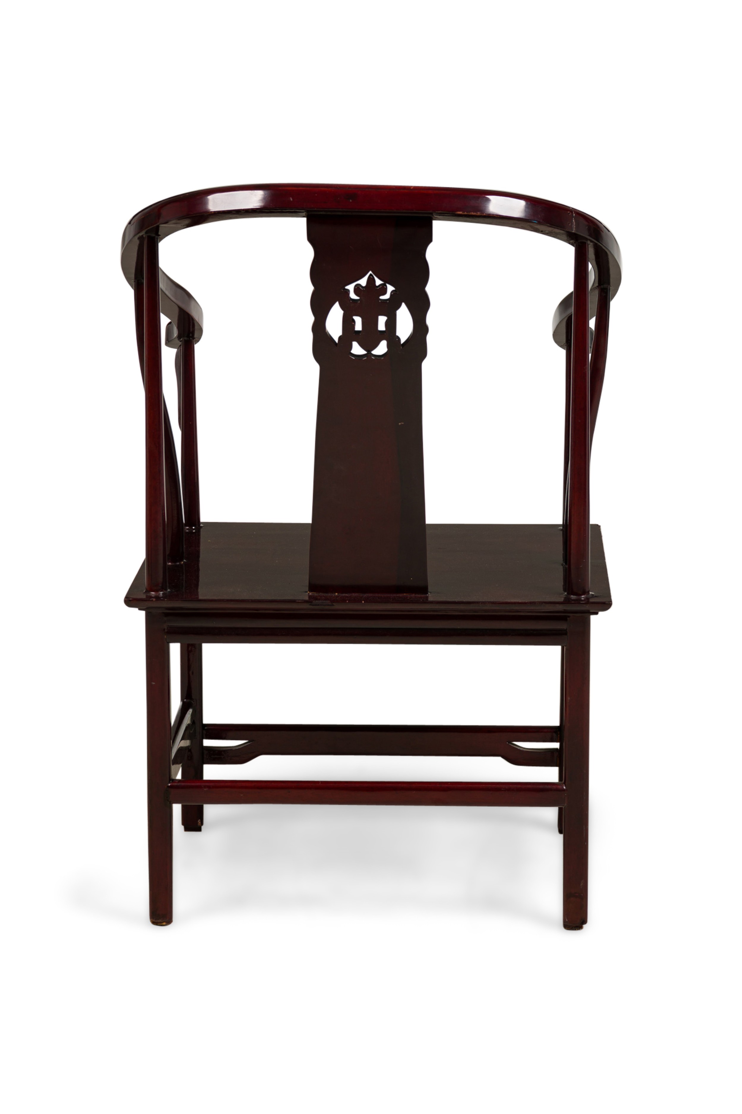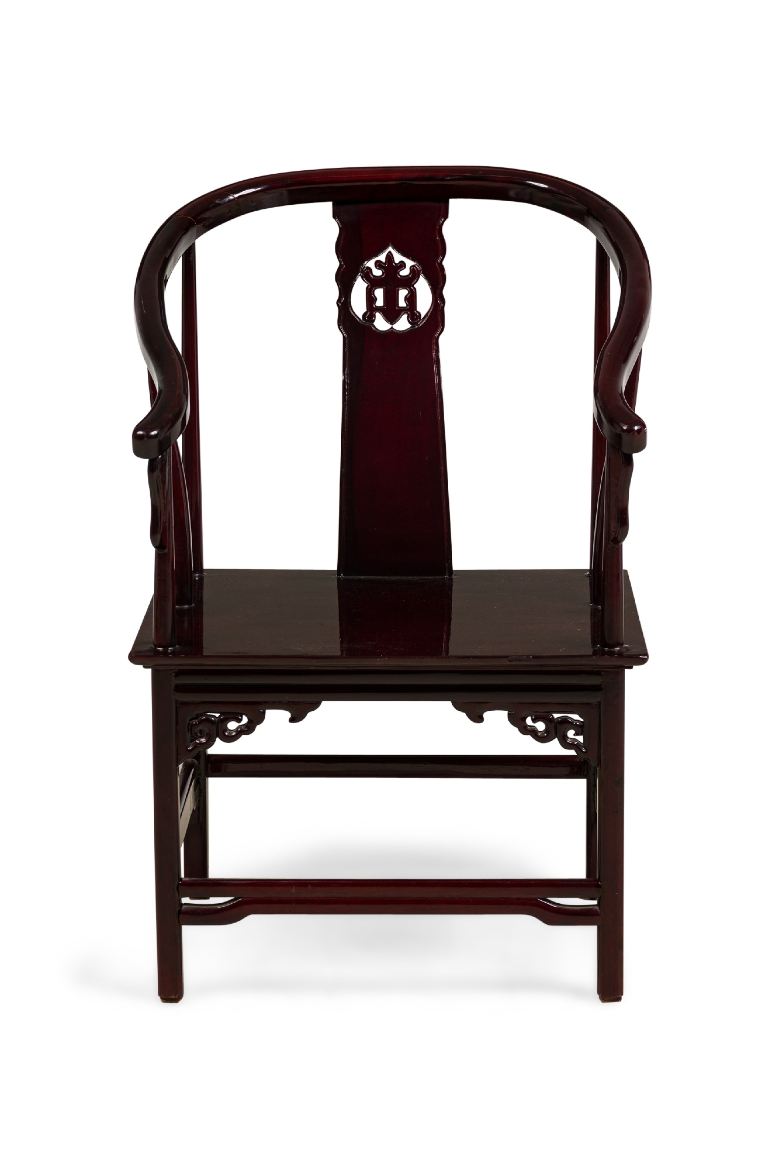 Asian Chinese Ming style (c. 1970's) armchair in rosewood with a horseshoe shaped back center slat panel with a stretche