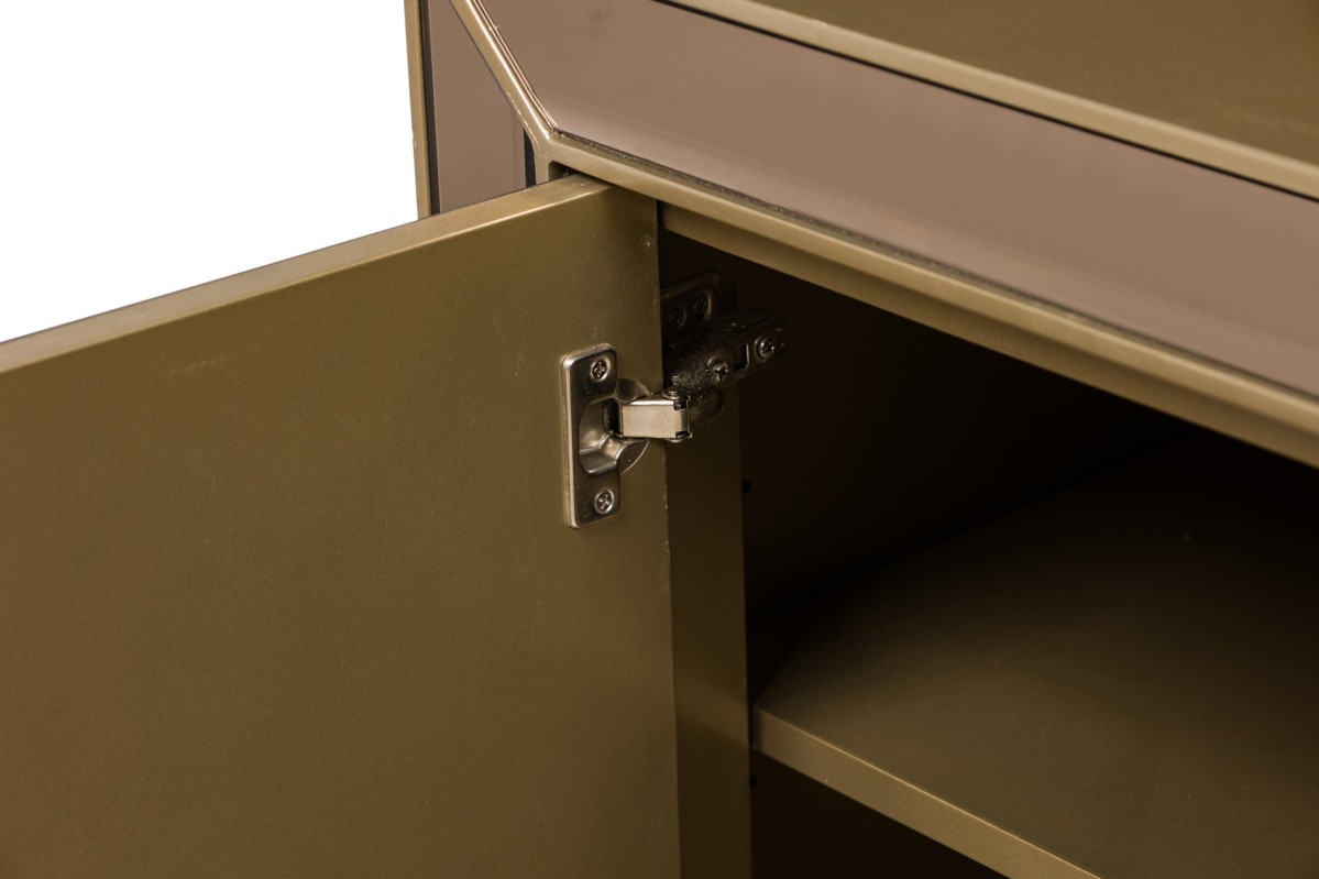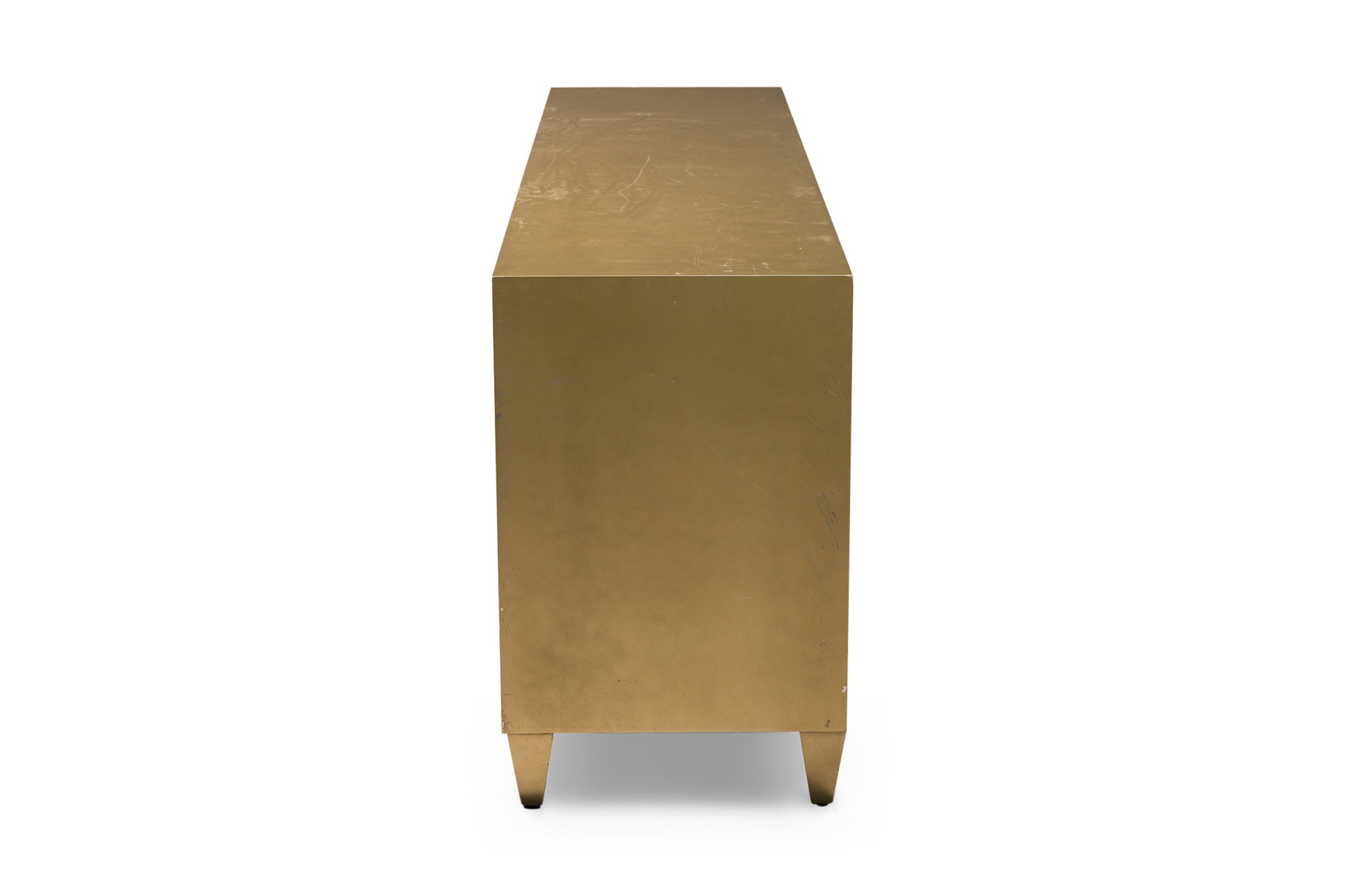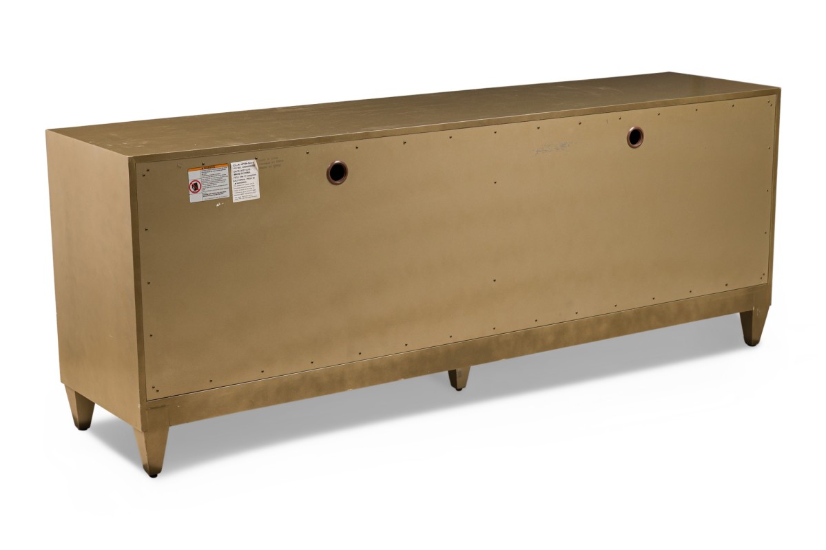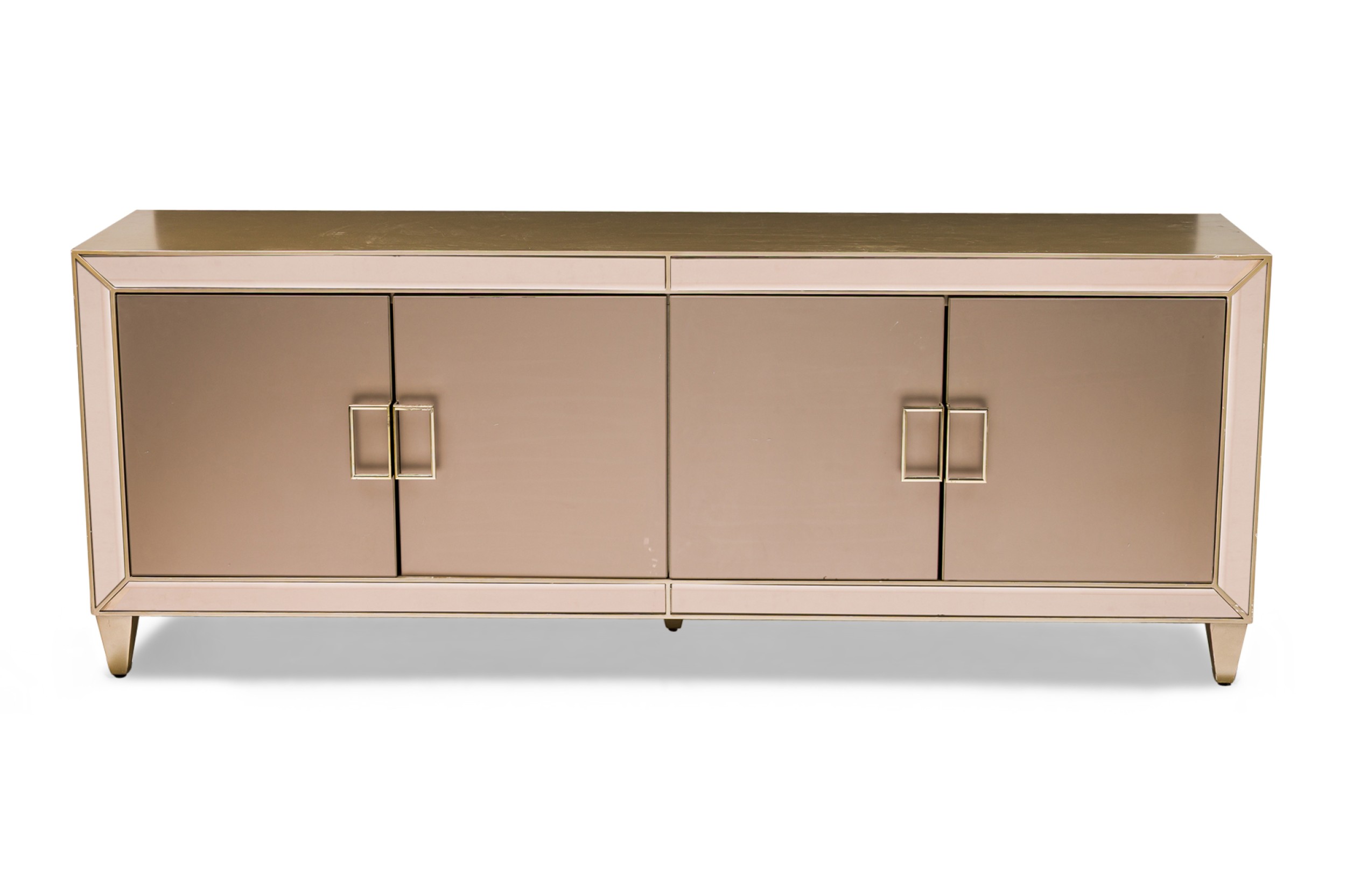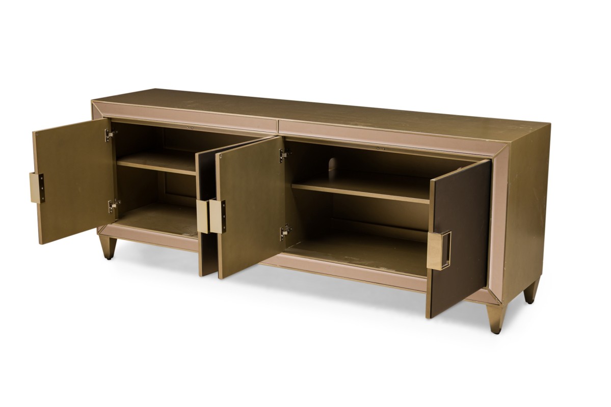 Caracole Contemporary American Media Mogul sideboard with metal body defined by mirrored edges bearing an art-decoesque rectangular gold metal pulls ending on four feet