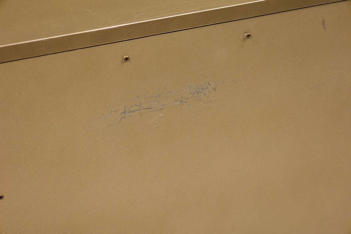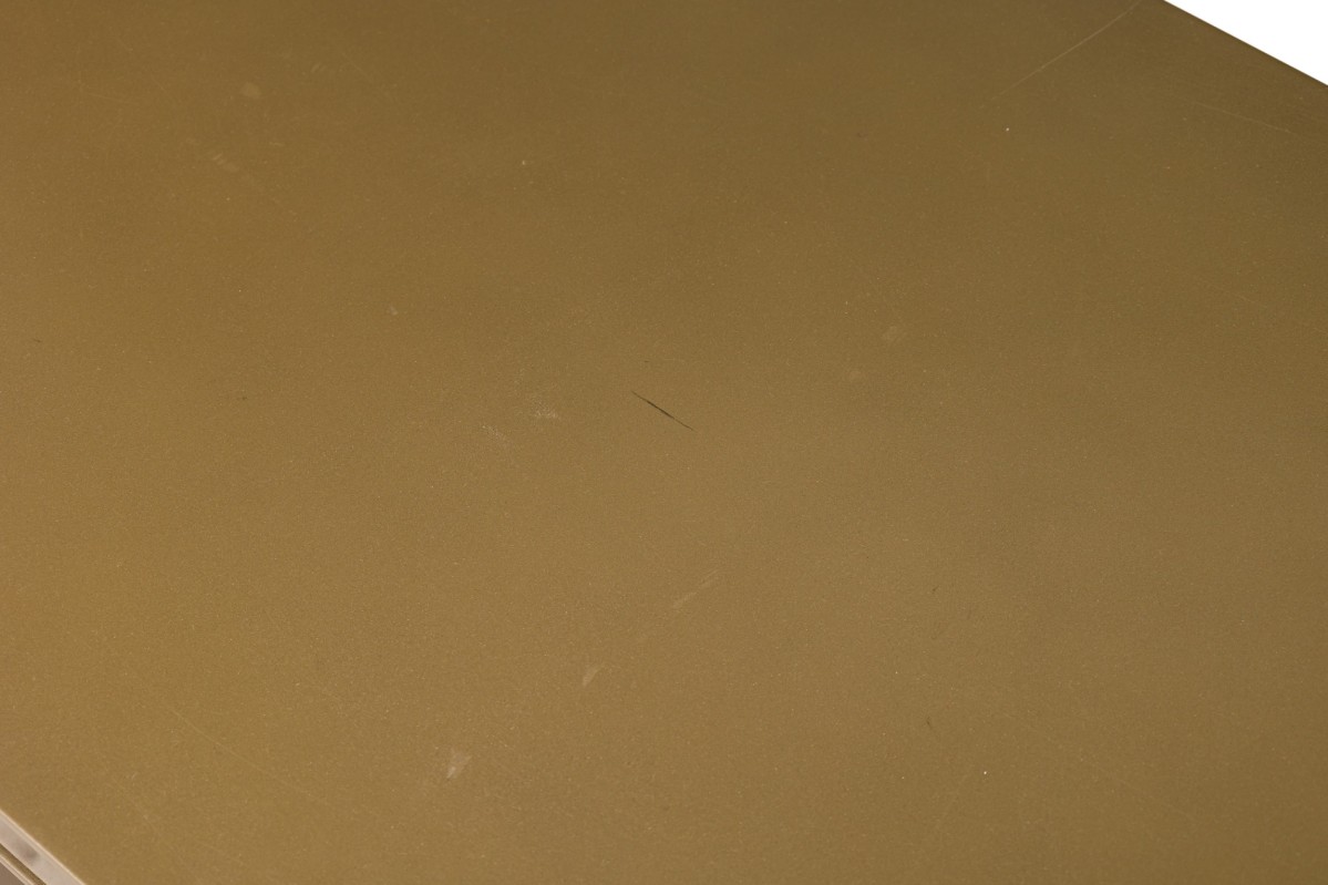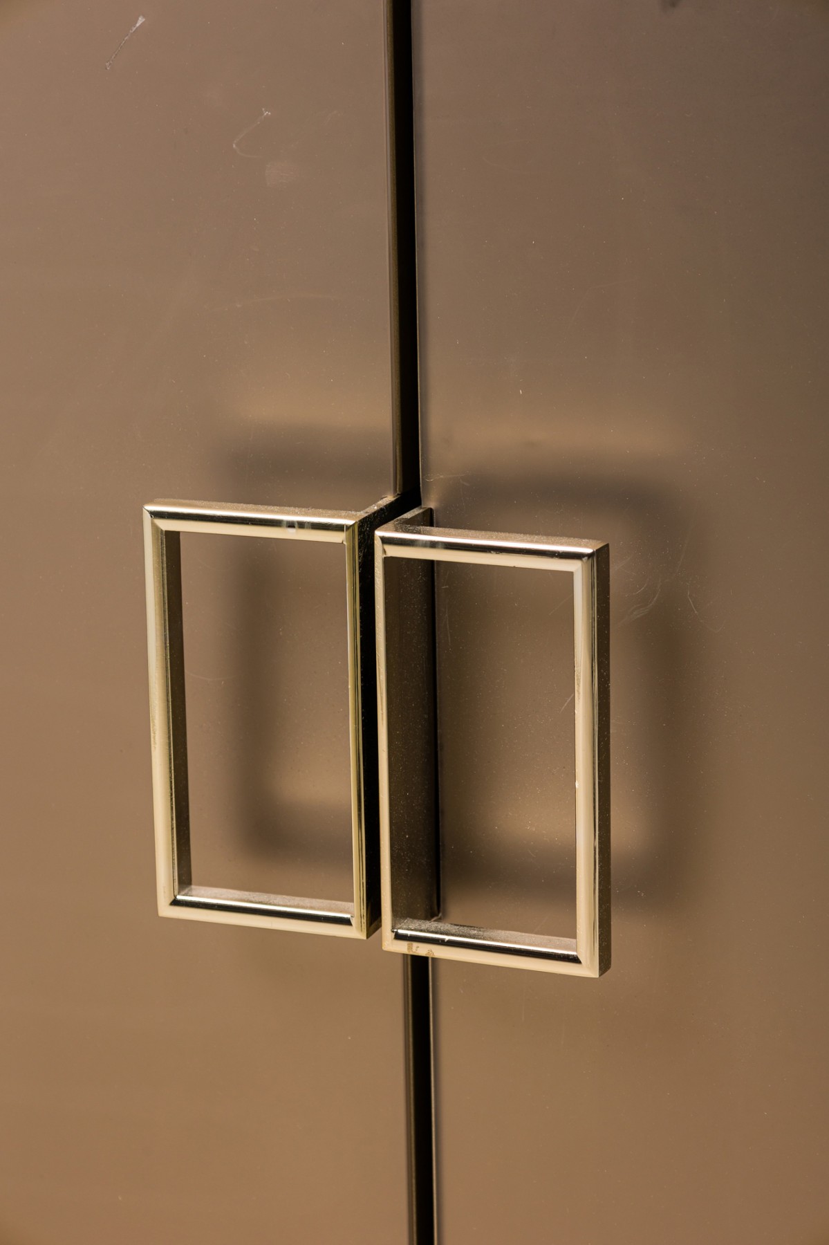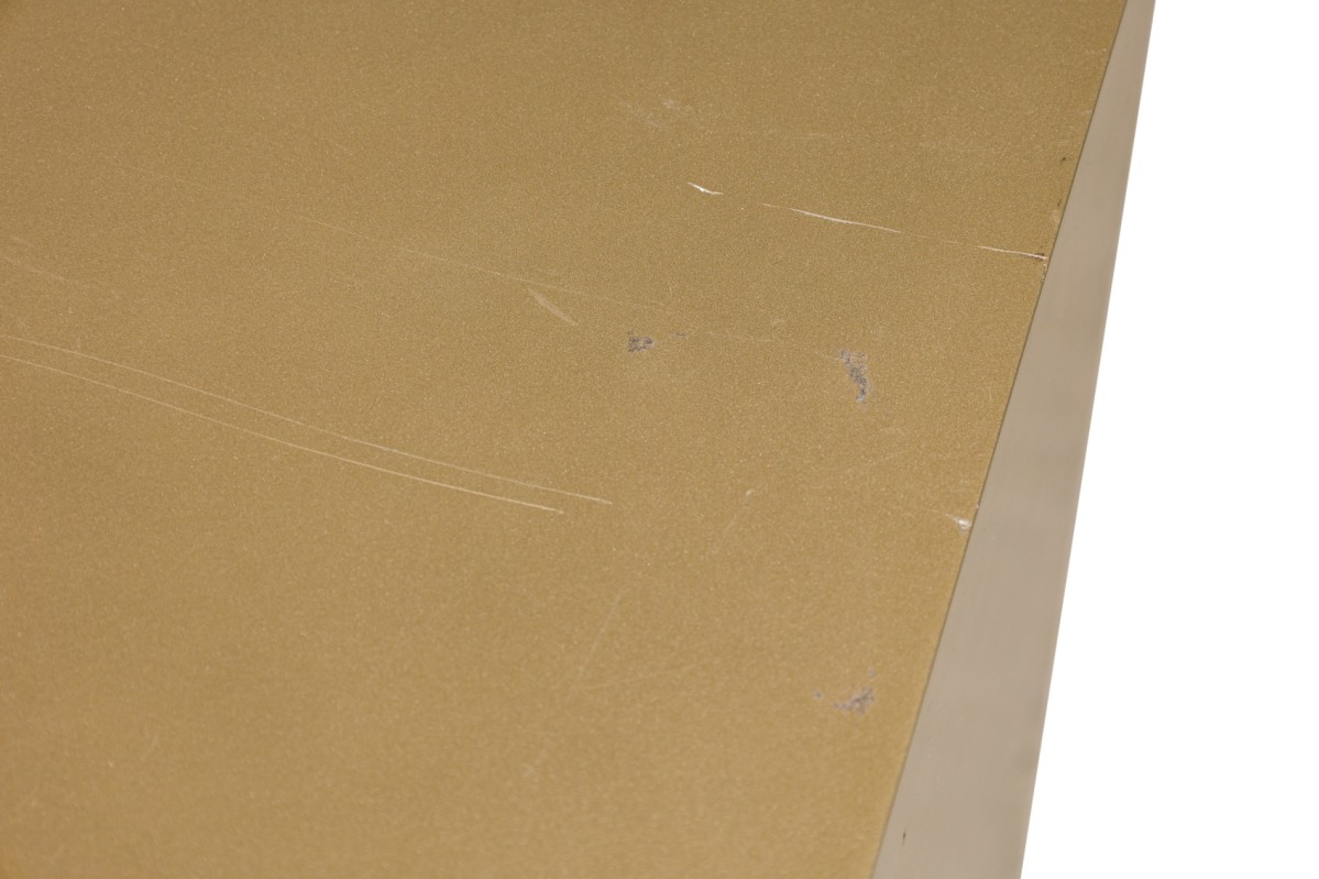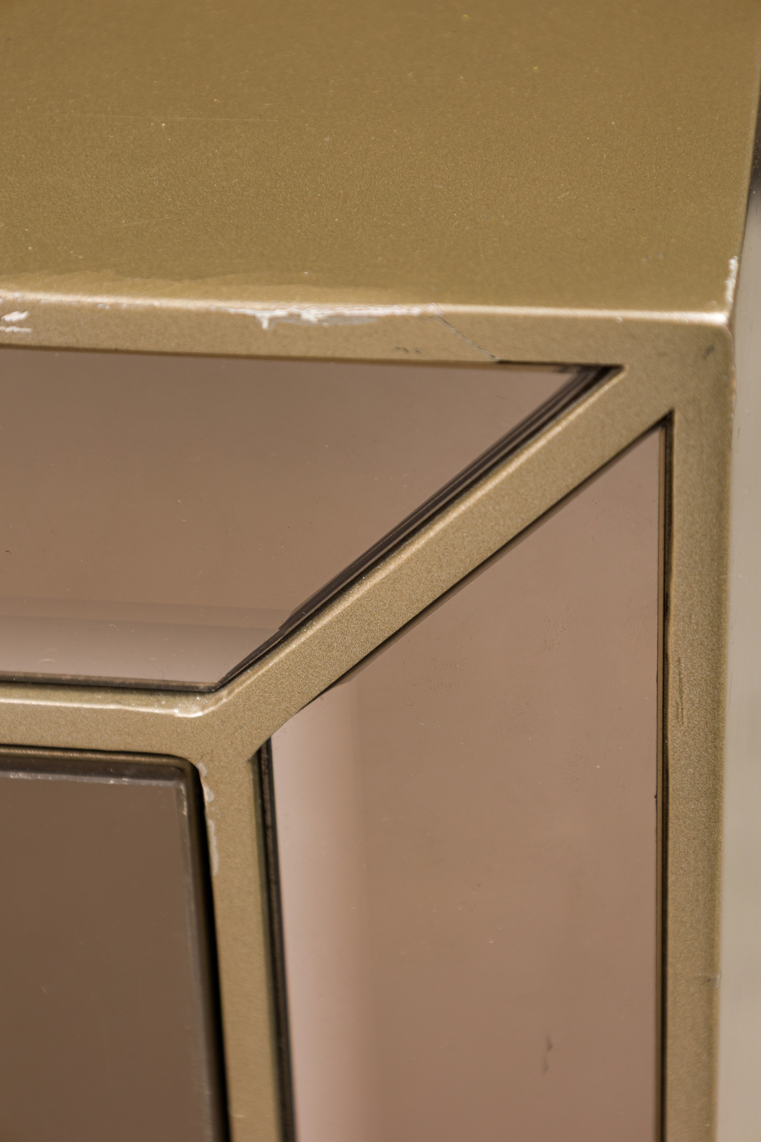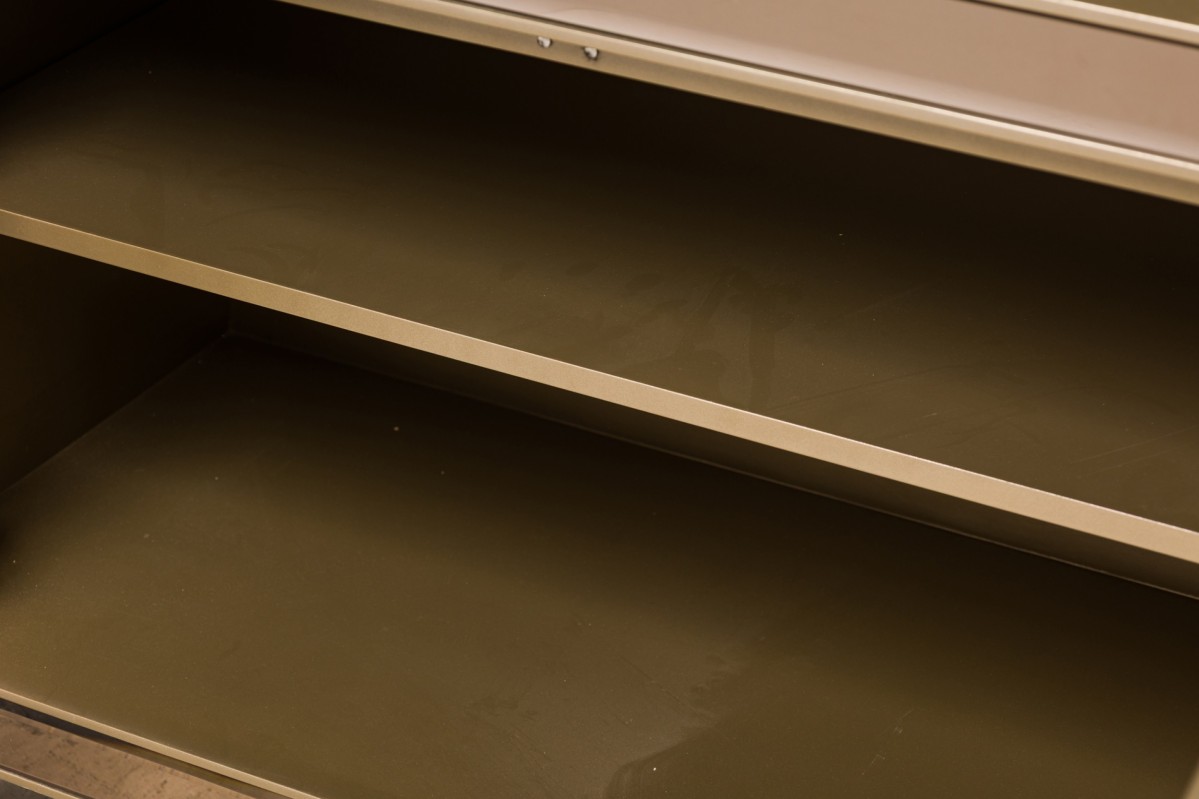 Caracole Contemporary American Media Mogul sideboard with metal body defined by mirrored edges bearing an art-decoesque rectangular gold metal pulls ending on four feet