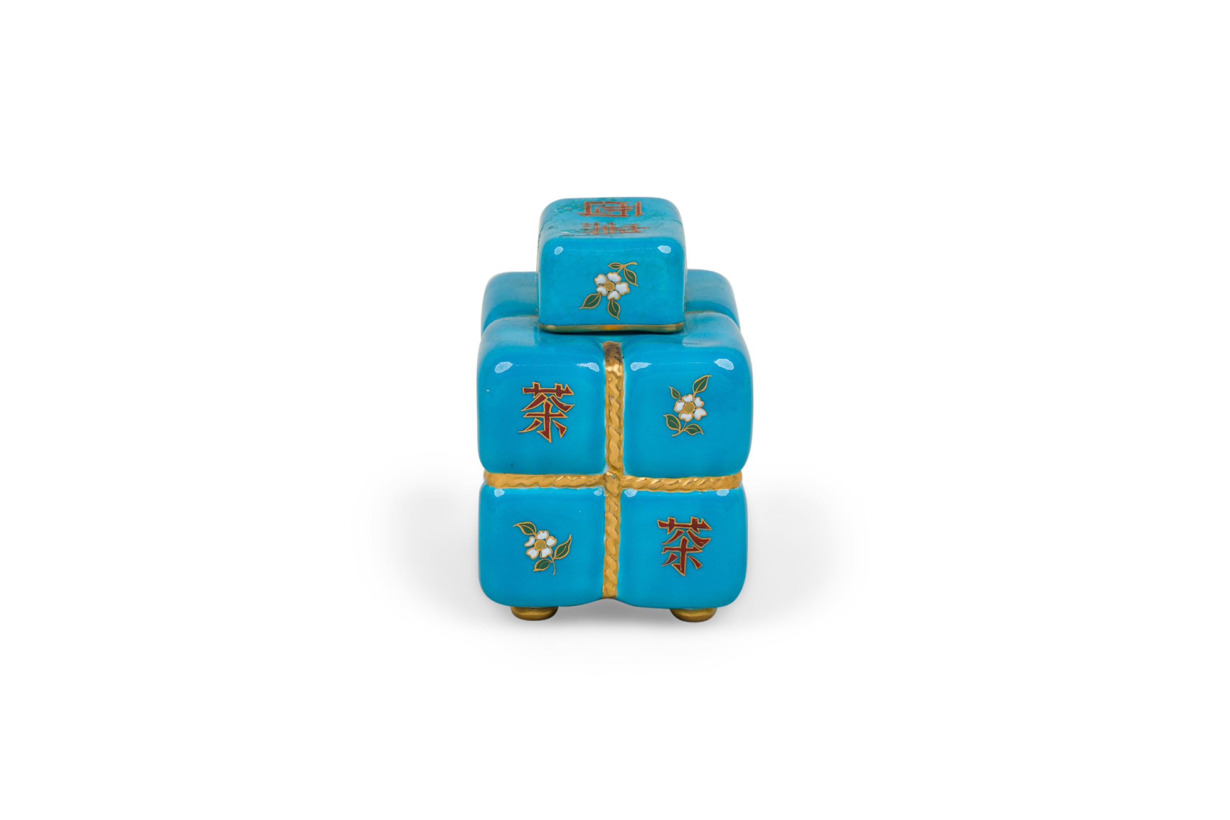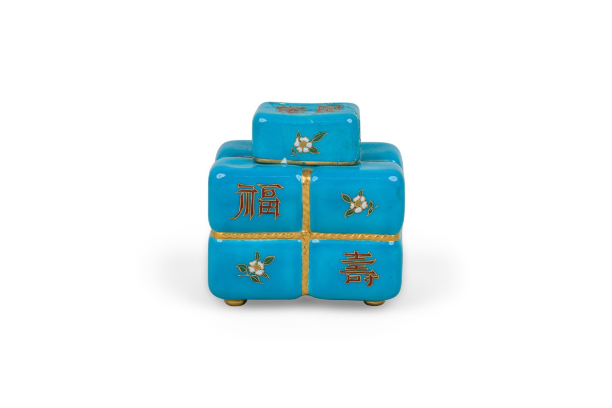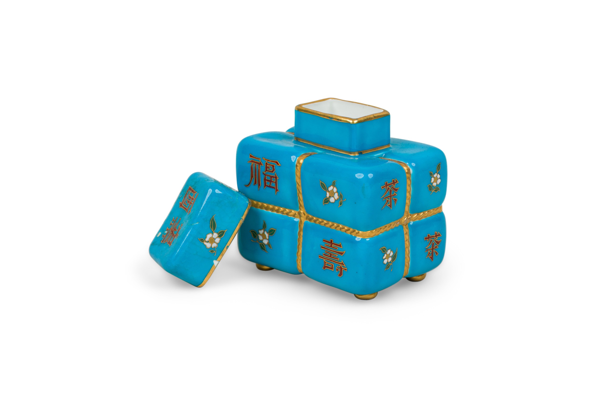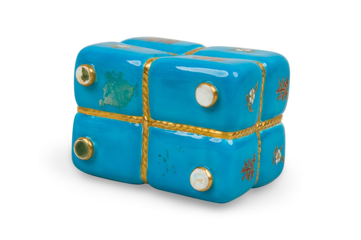 Chinese small blue cubical shaped porcelain urn with a lid and gilt rope detail having iconography imprinted with a floral design