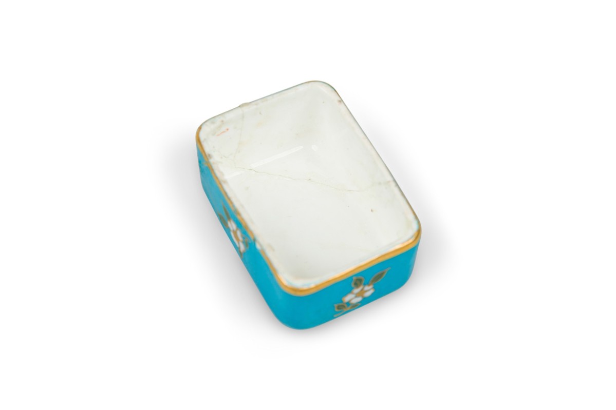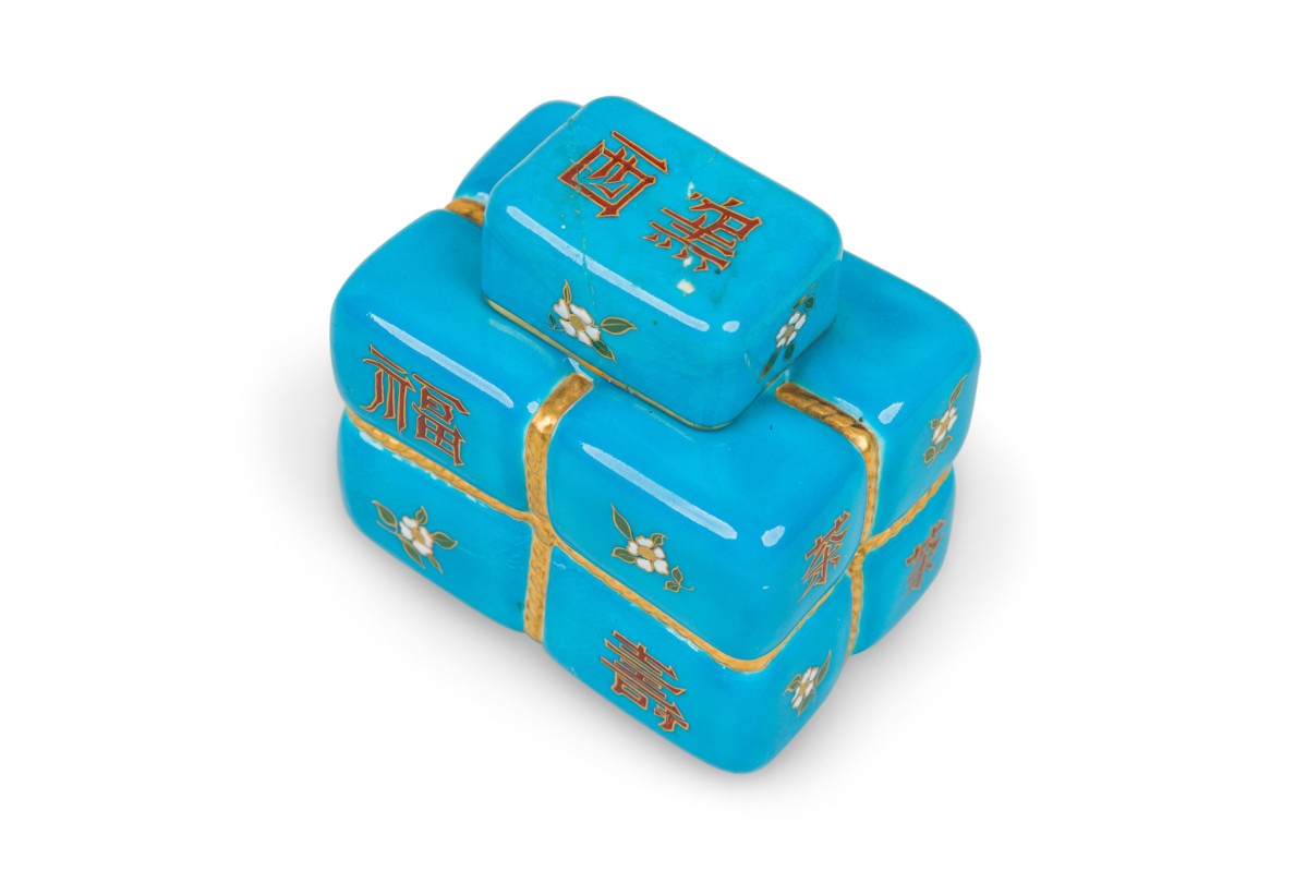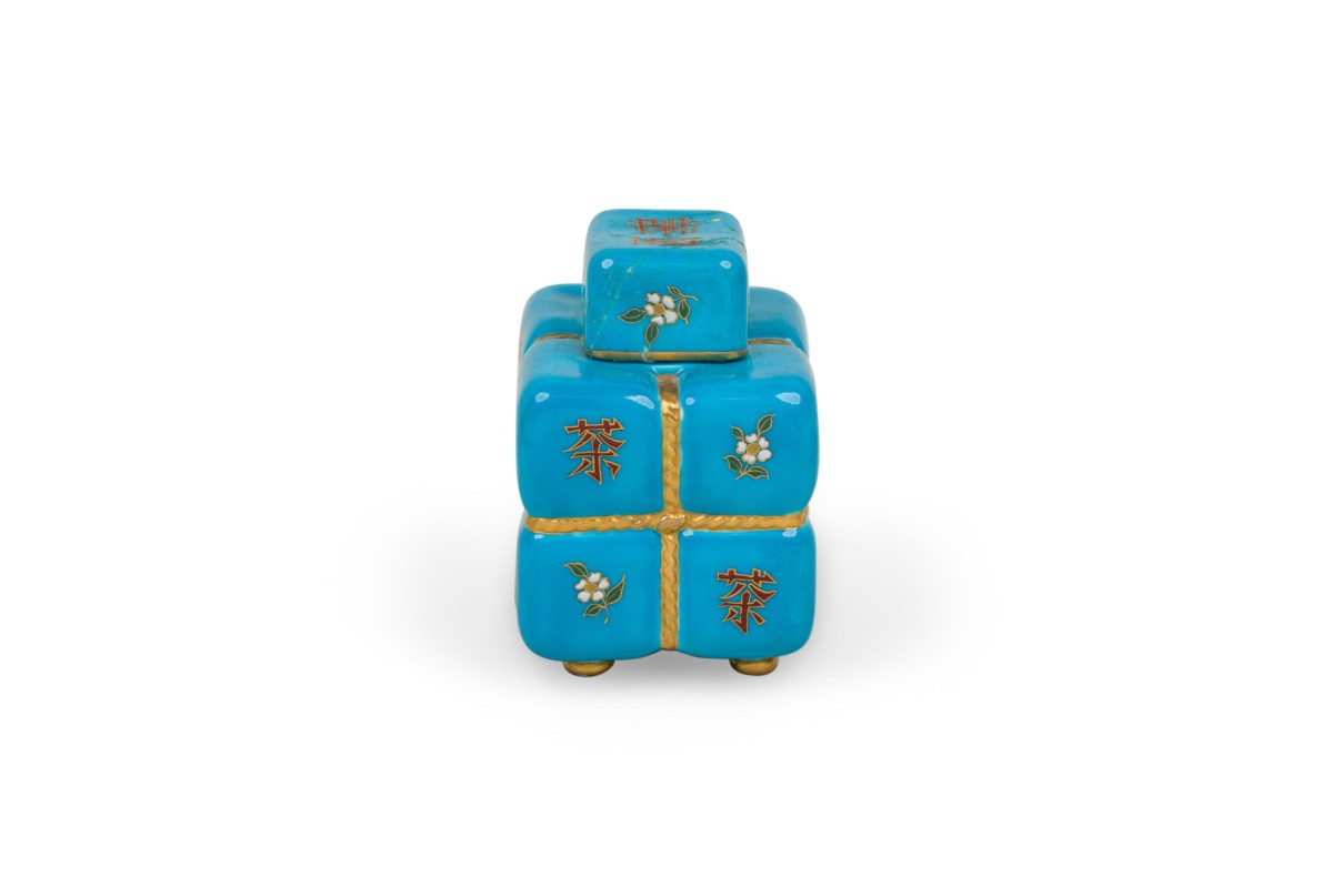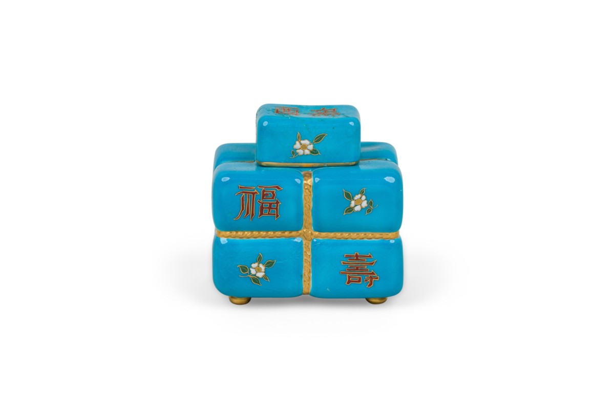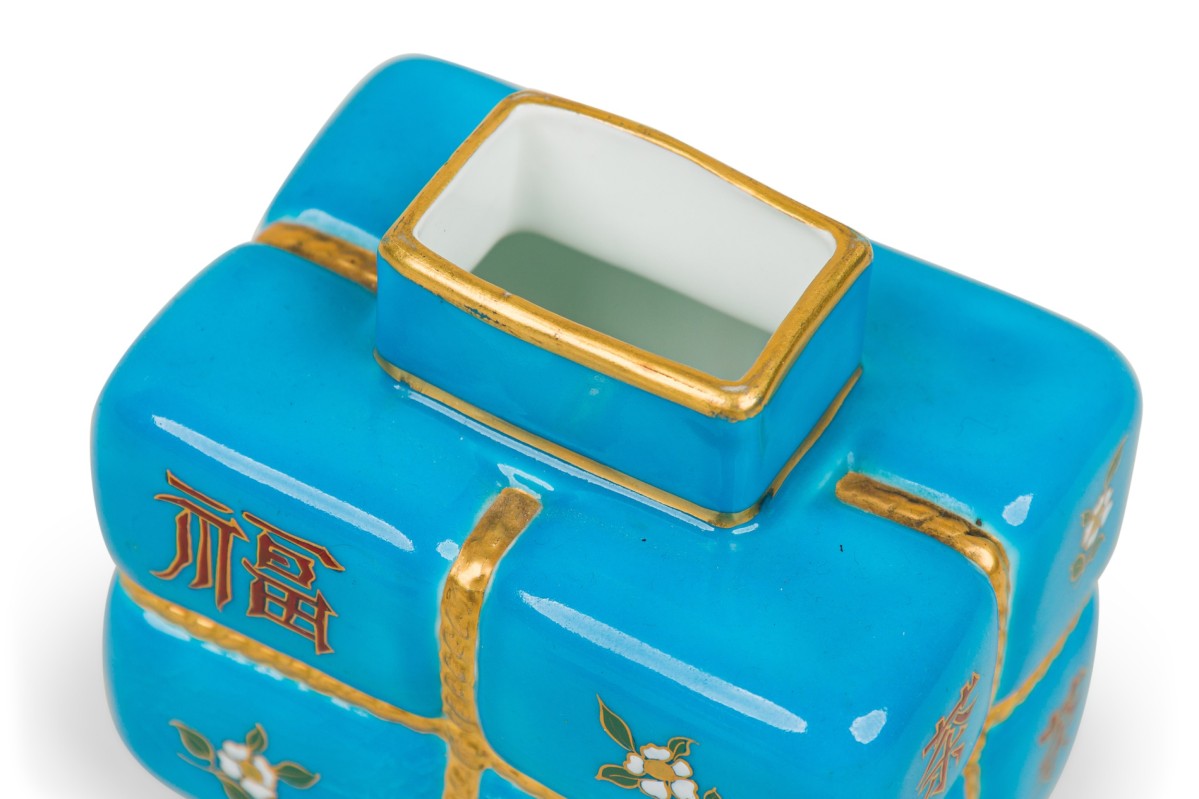Chinese small blue cubical shaped porcelain urn with a lid and gilt rope detail having iconography imprinted with a floral design