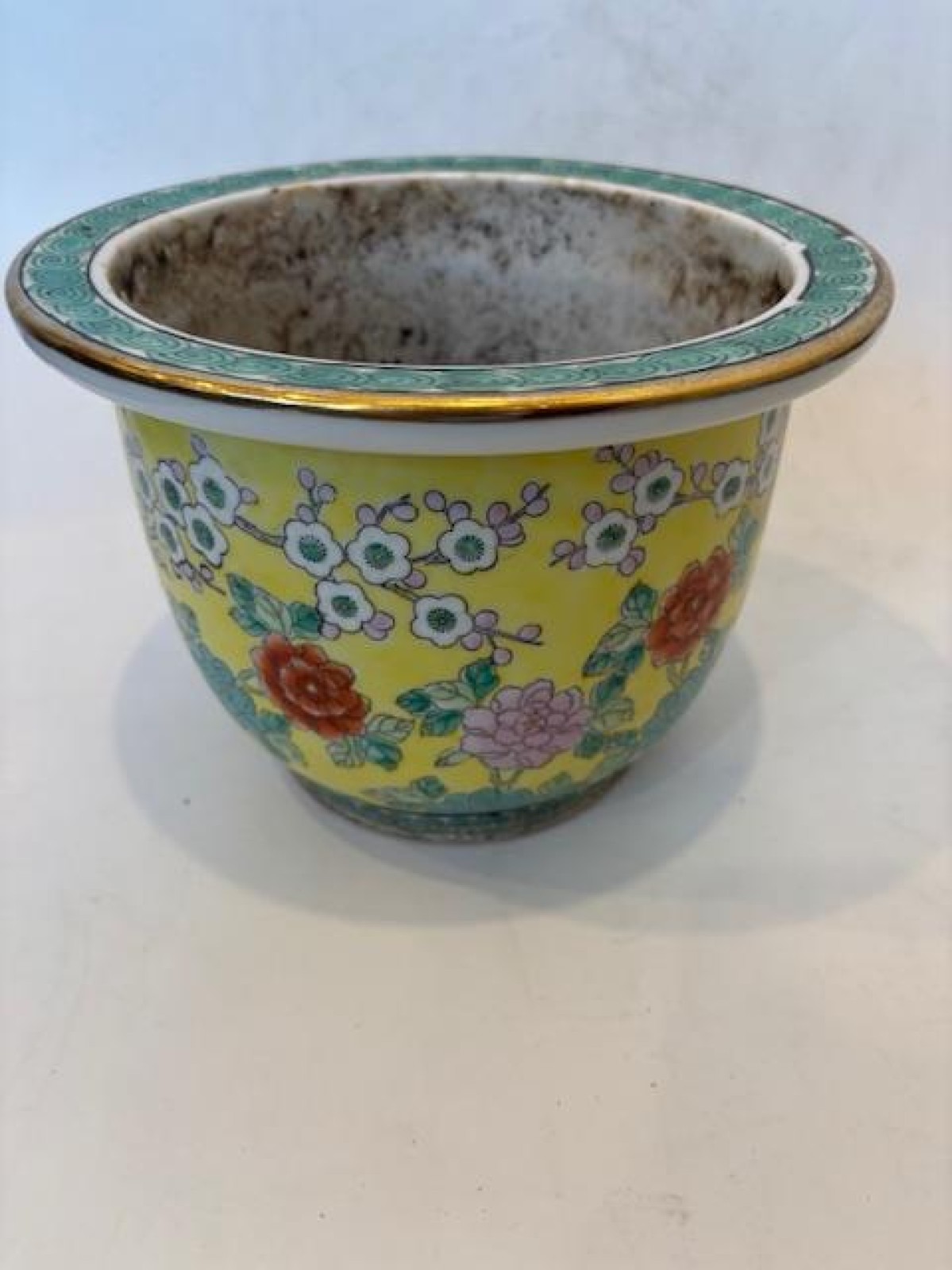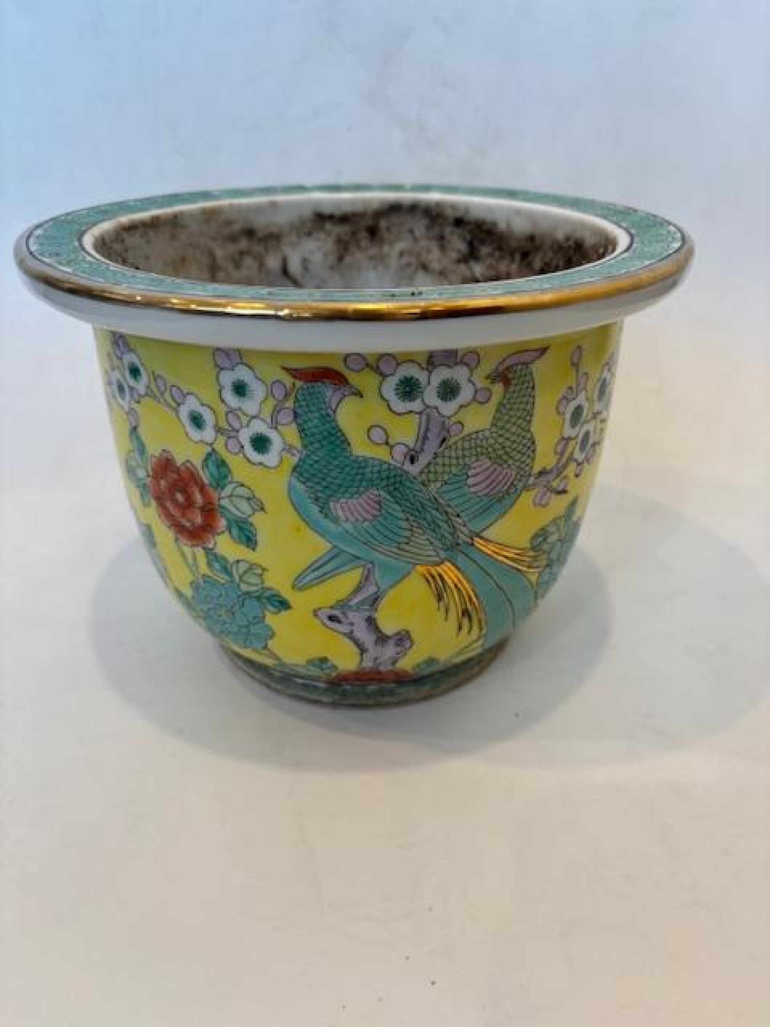 Asian Chinese style (mid-20th Century) yellow floral and bird decorated round cashpot