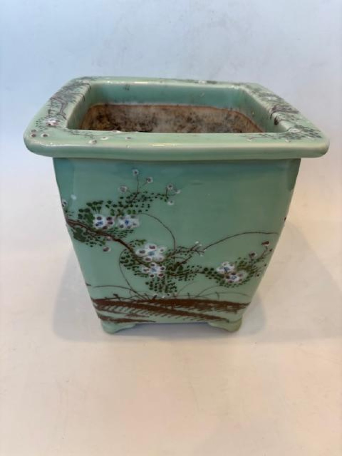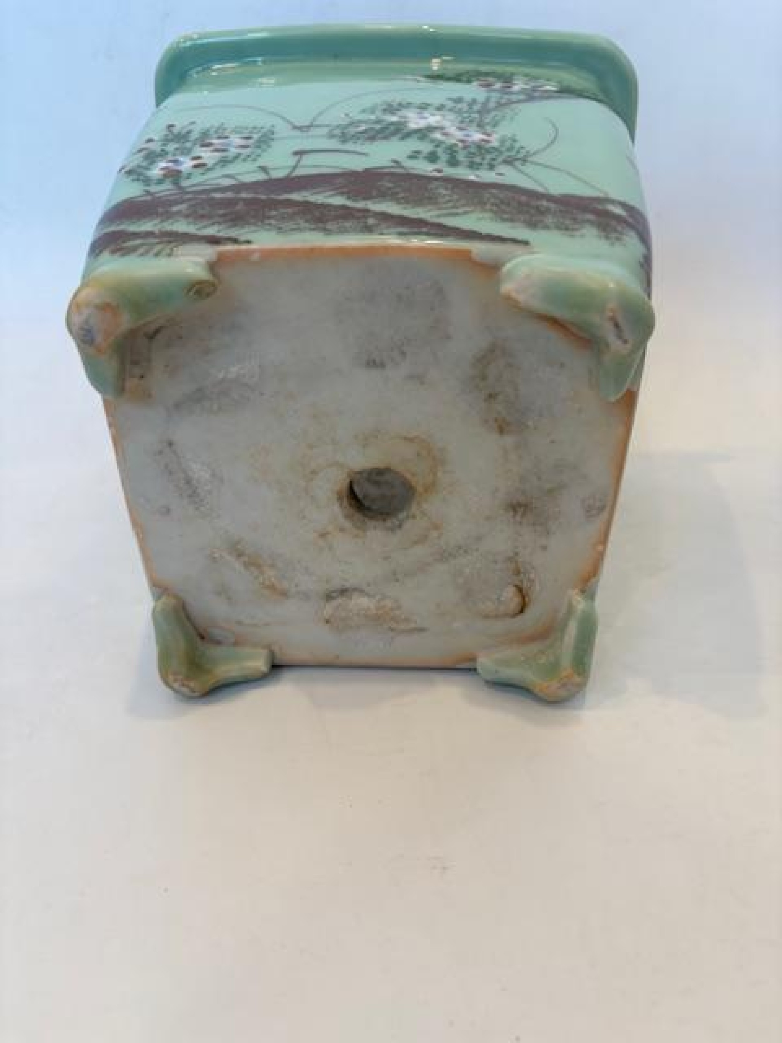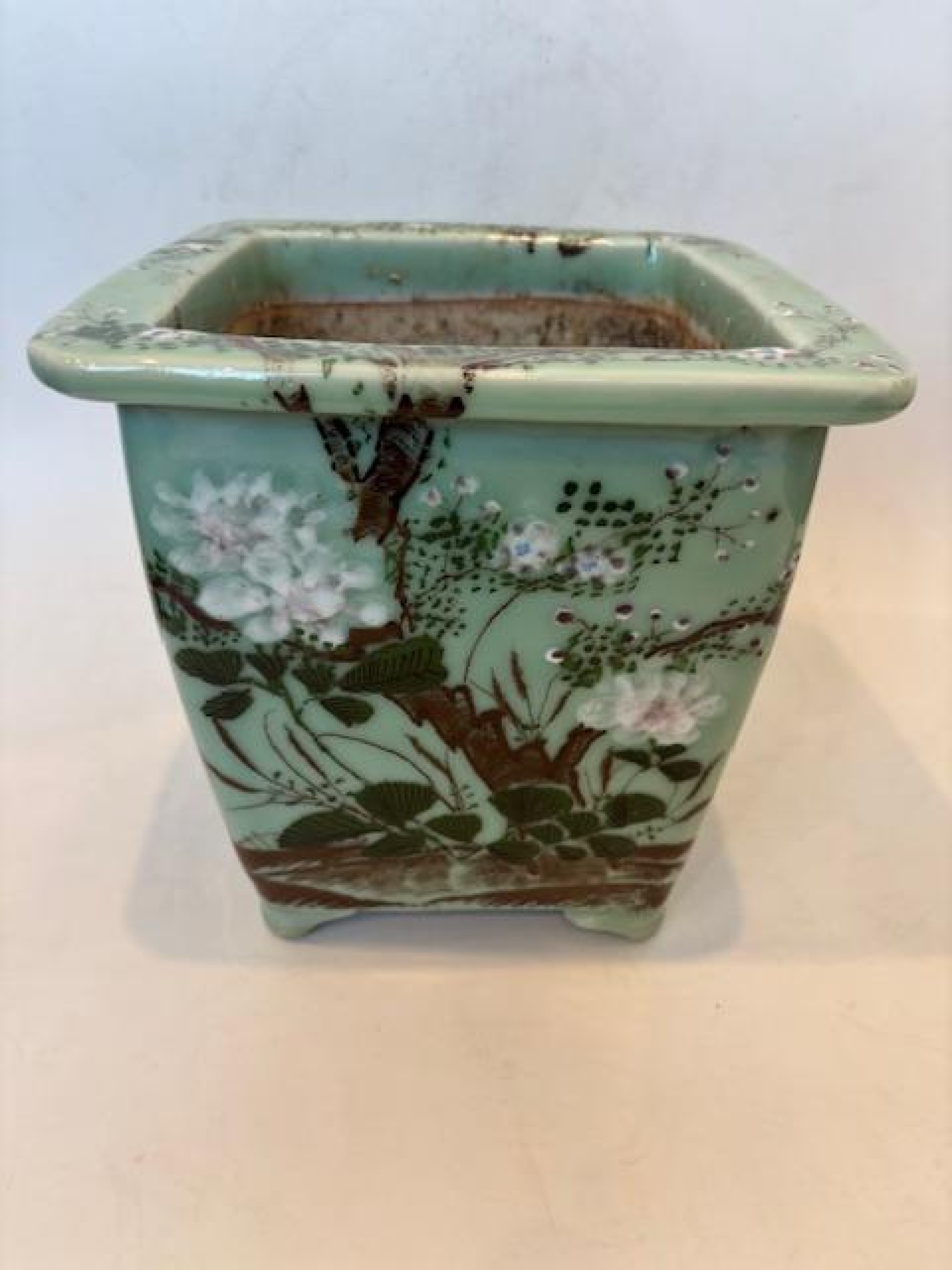 Asian Chinese style (mid-20th Century) celadon square shaped jardiniere with a floral design raised on 4 low feet