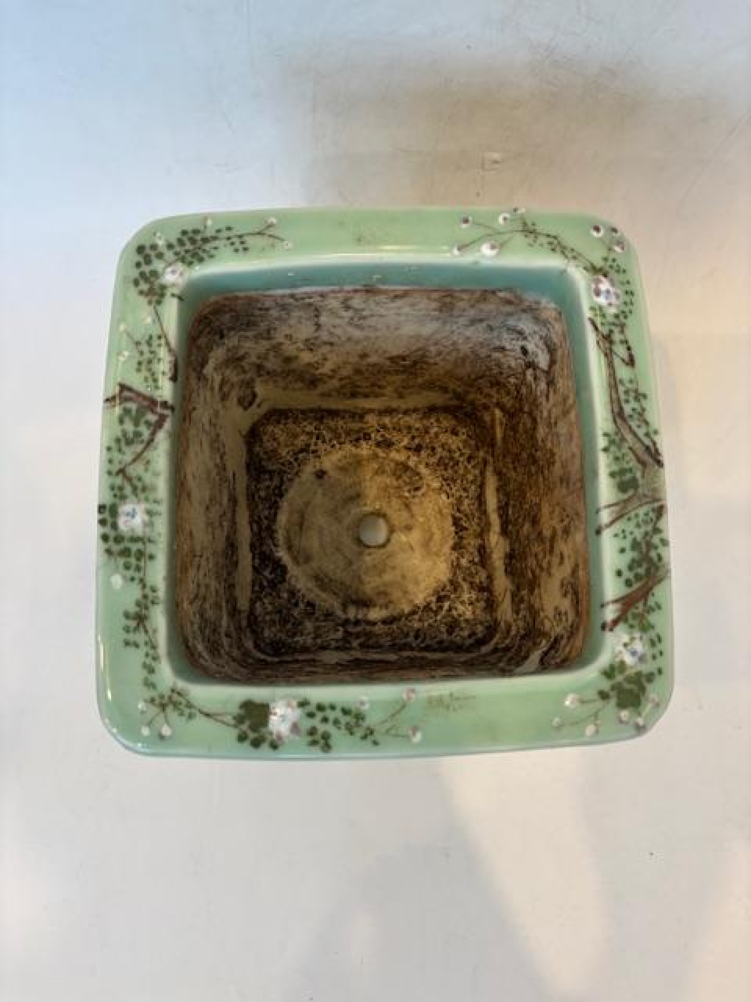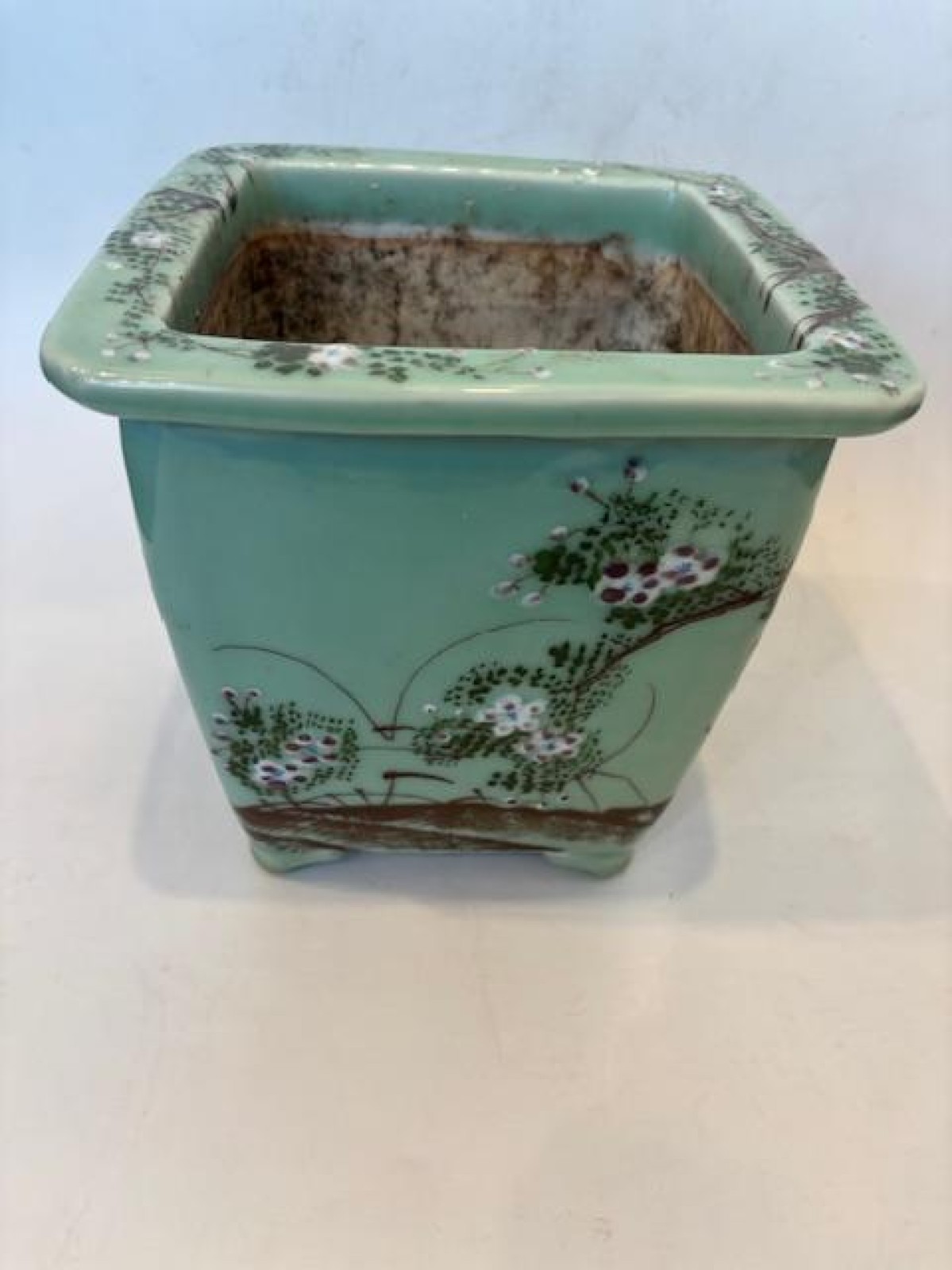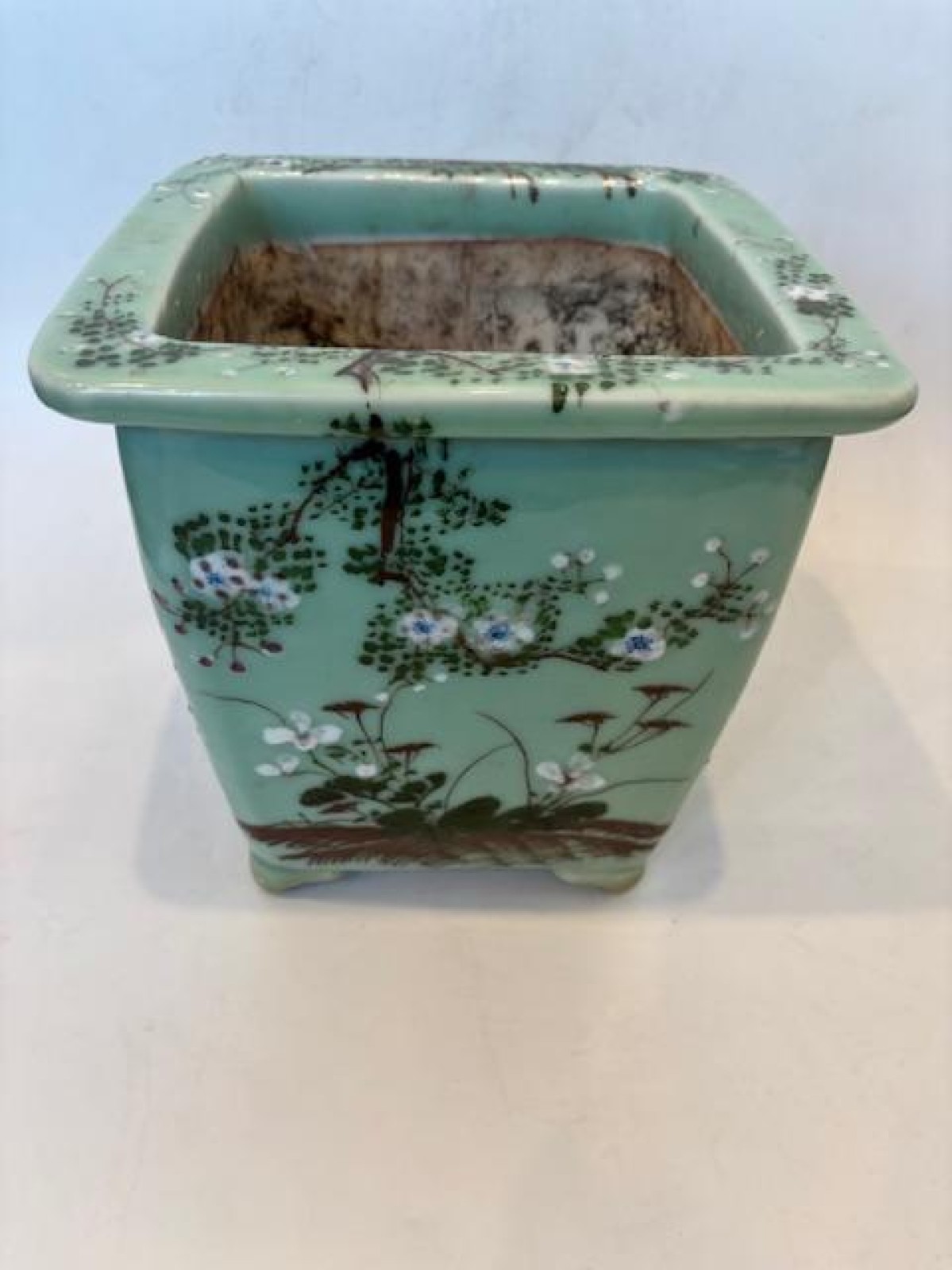Asian Chinese style (mid-20th Century) celadon square shaped jardiniere with a floral design raised on 4 low feet