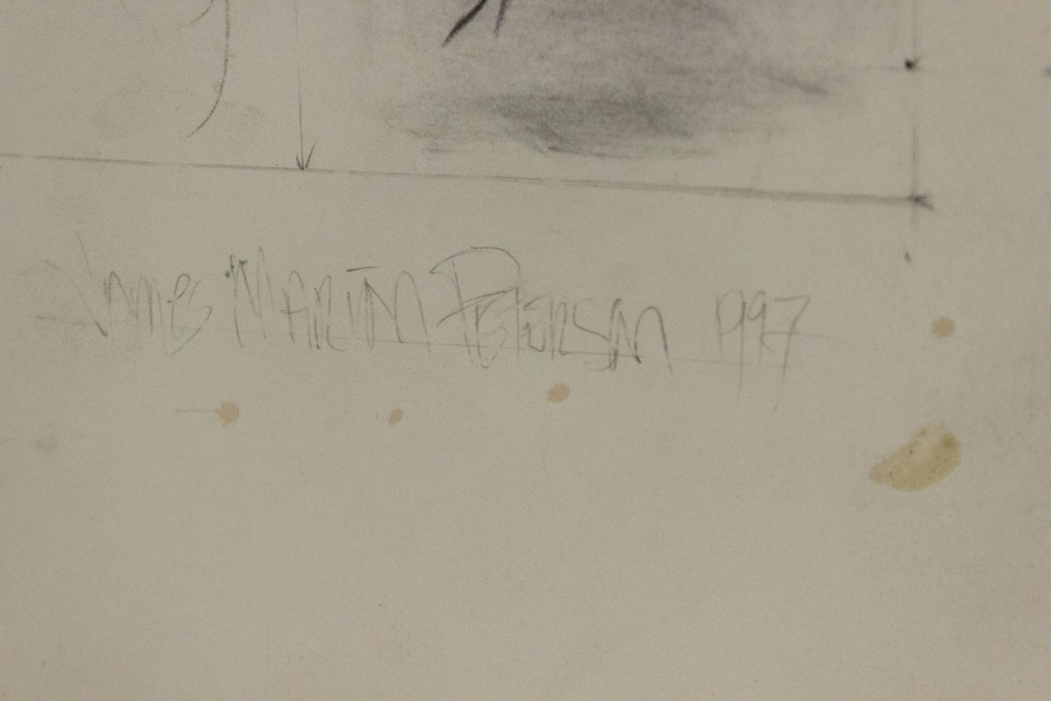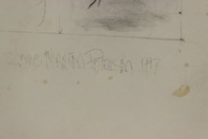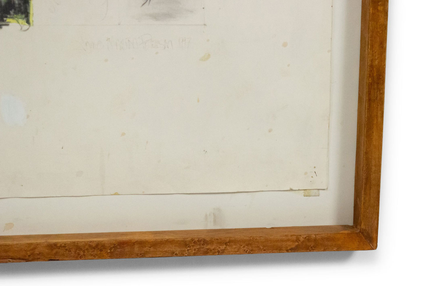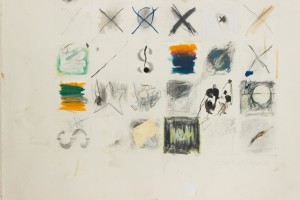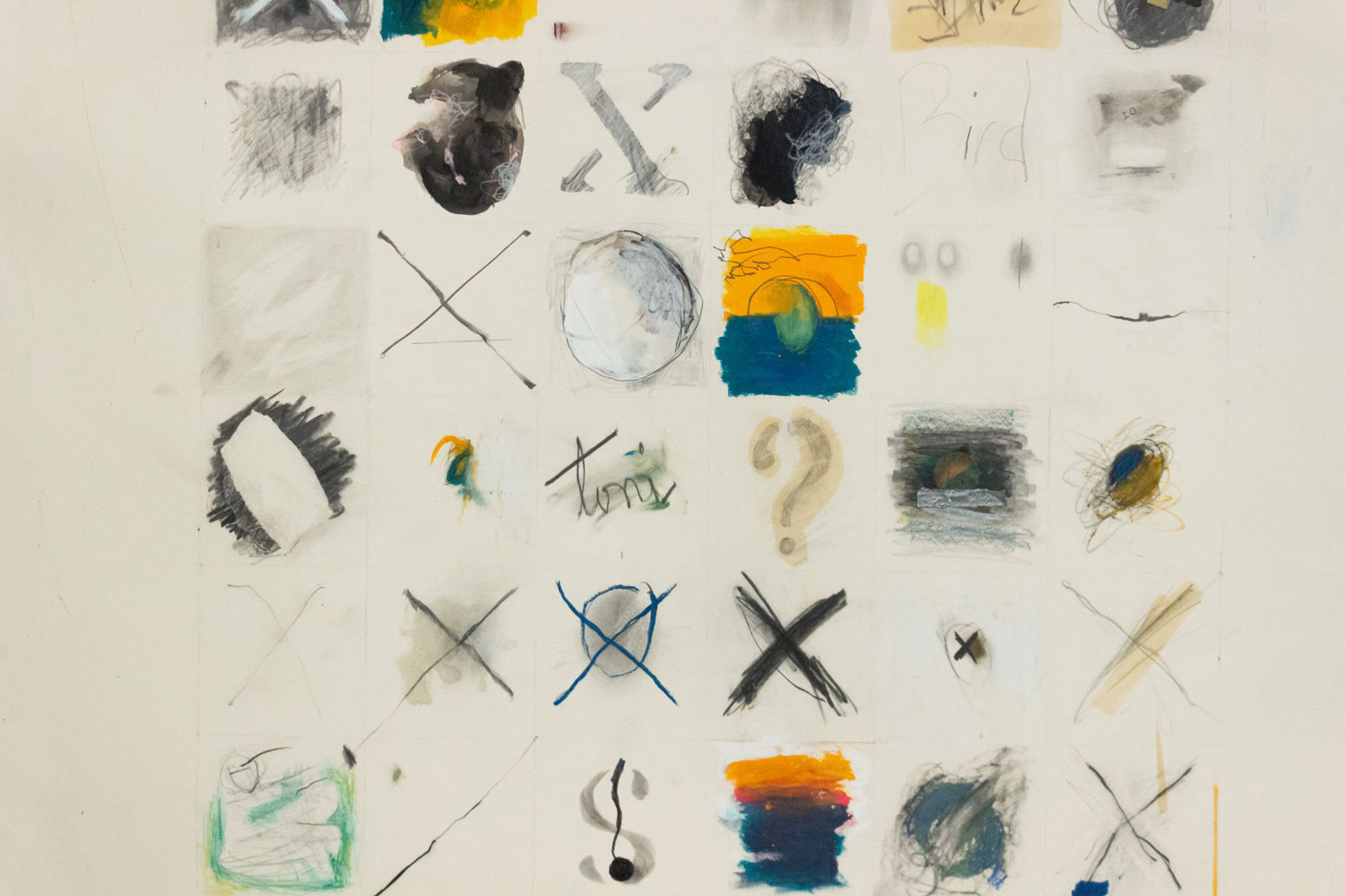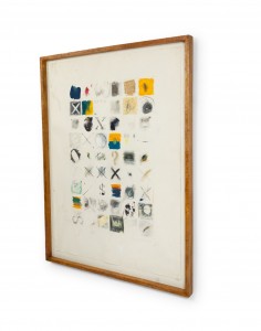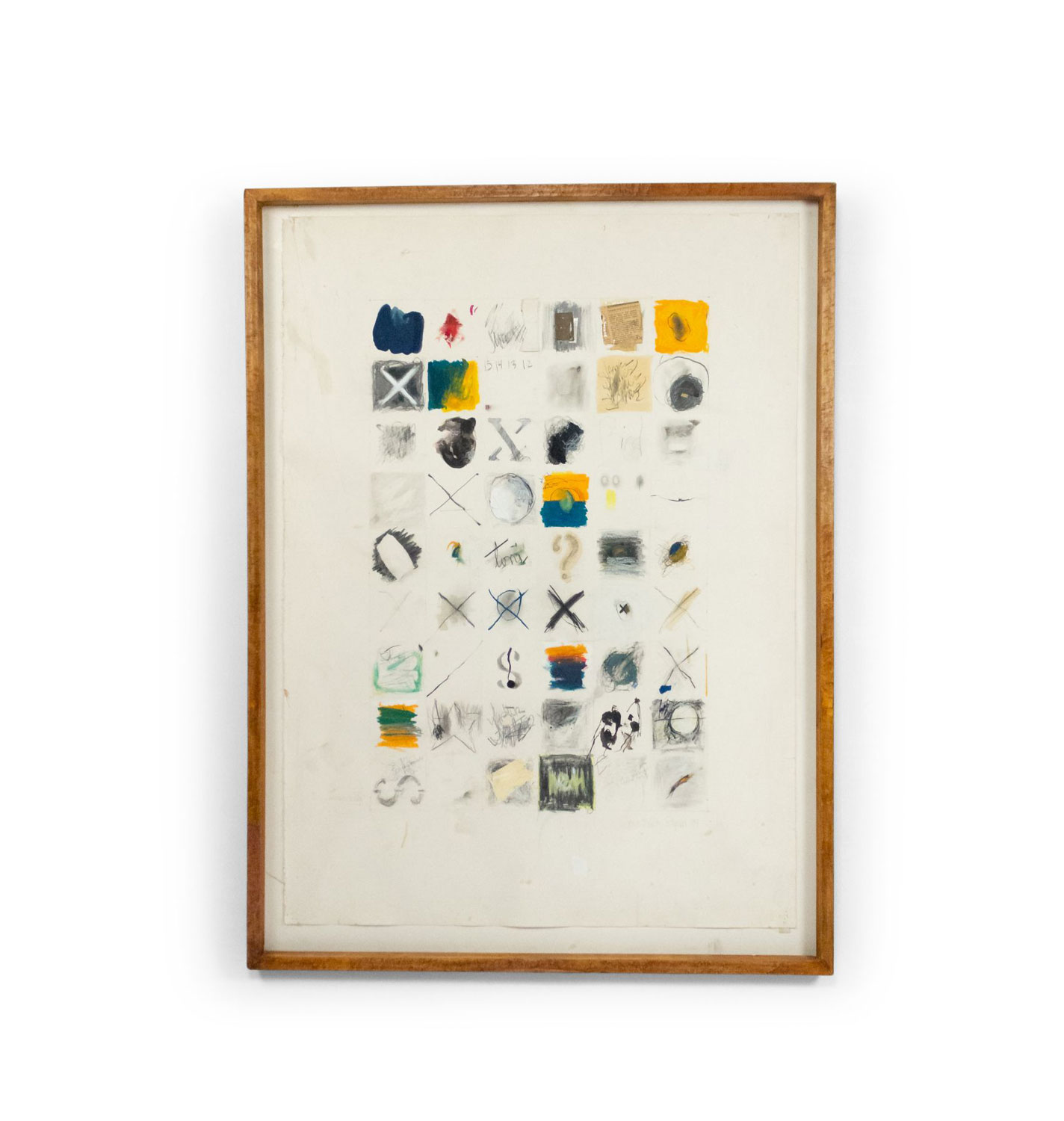 Copy of an unglazed mixed media abstract painting of stenciled letters in oil and collage on paper.