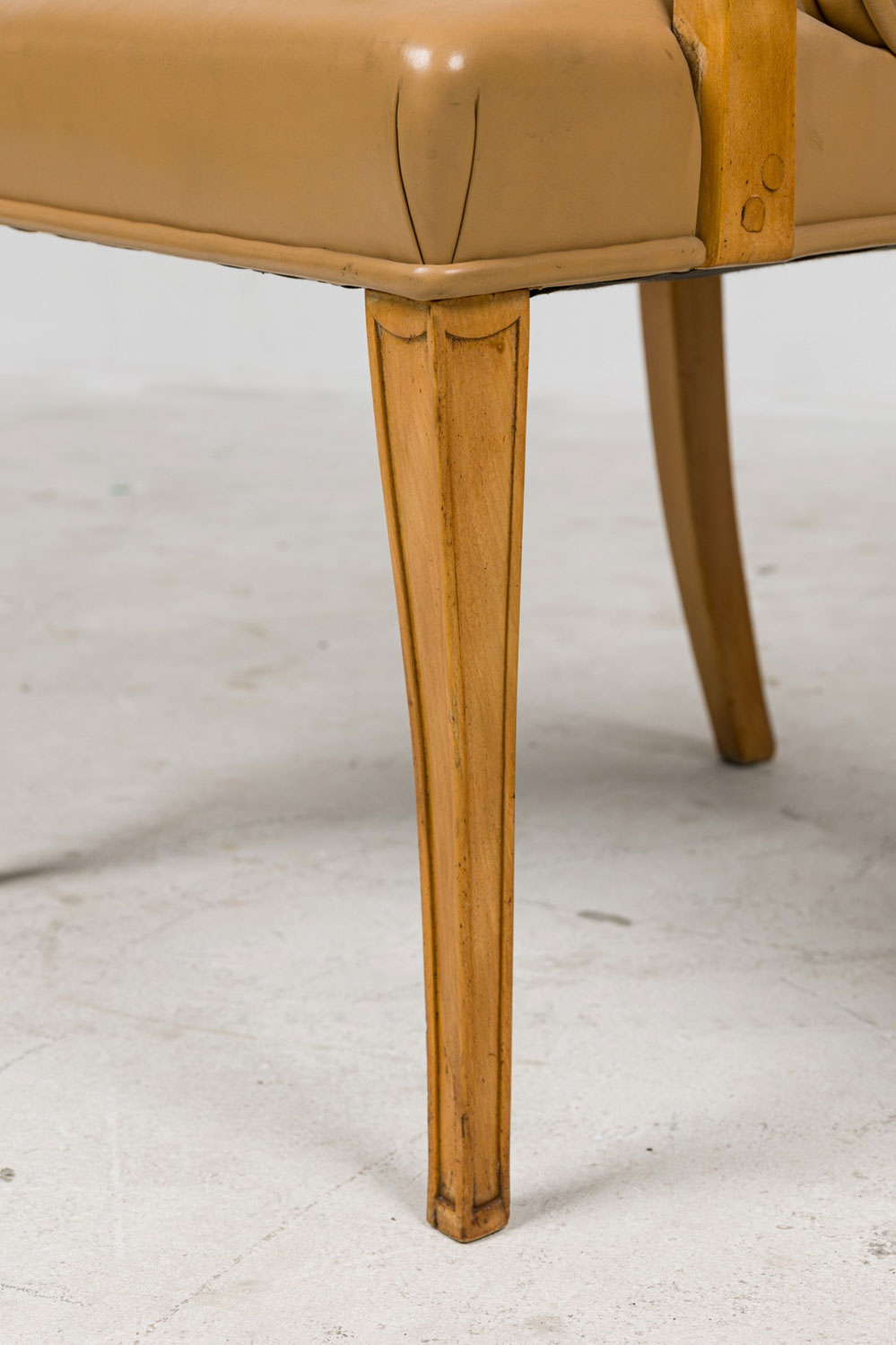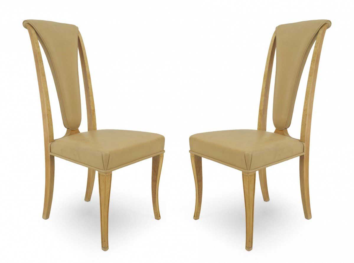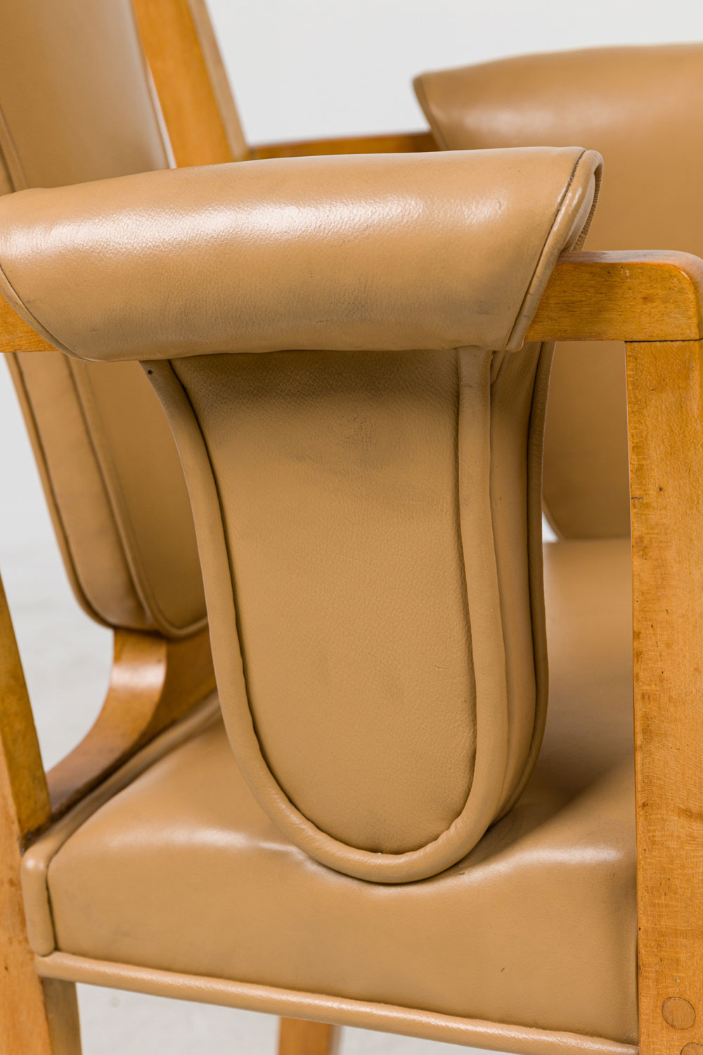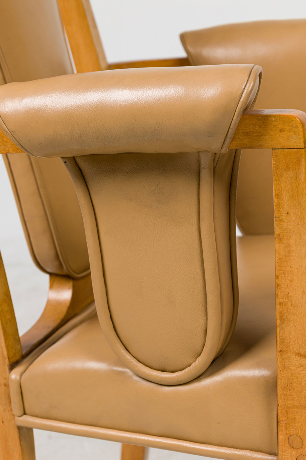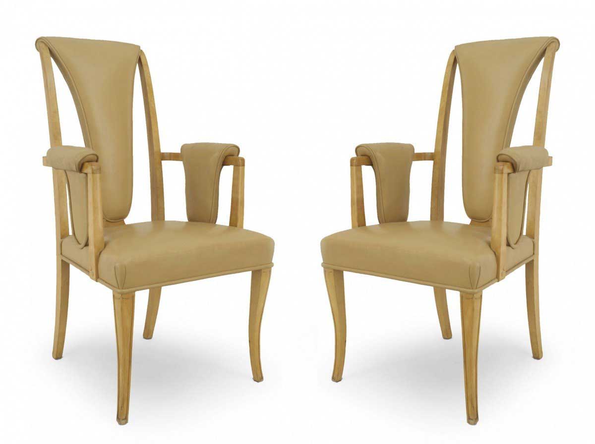 Set of 8 English Art Deco maple high back dining chairs with beige leather upholstery (2 arms:22½"w x 26"d x 42"h/6 side)