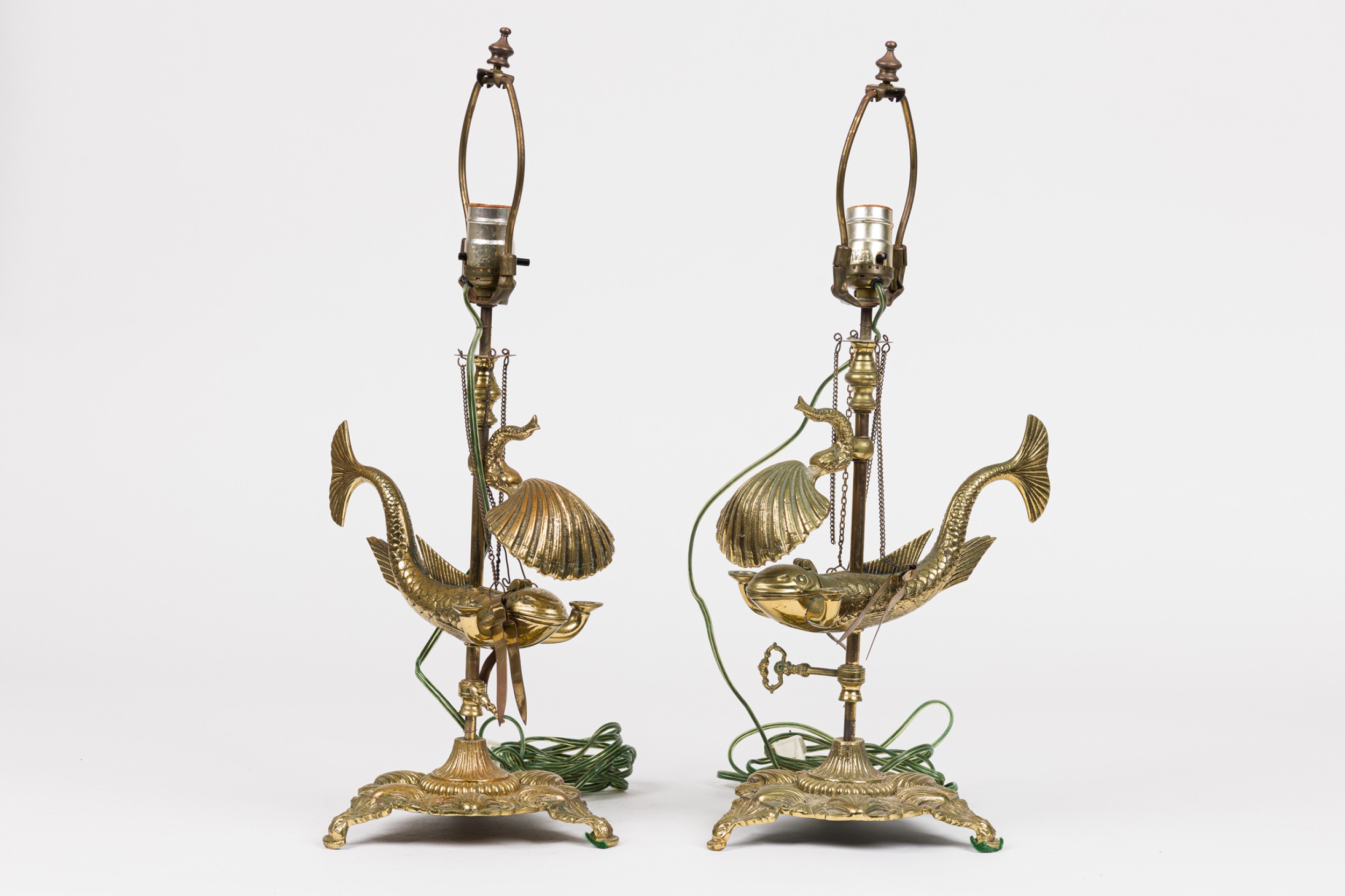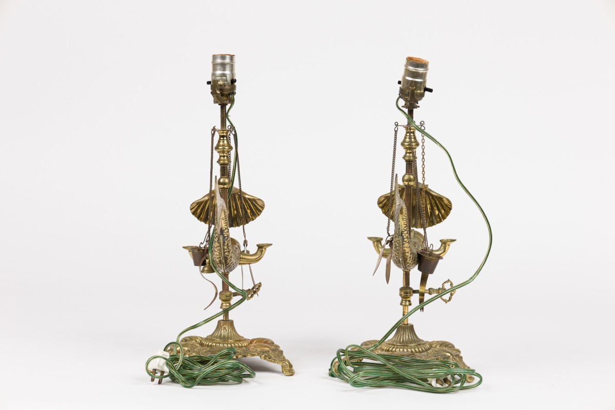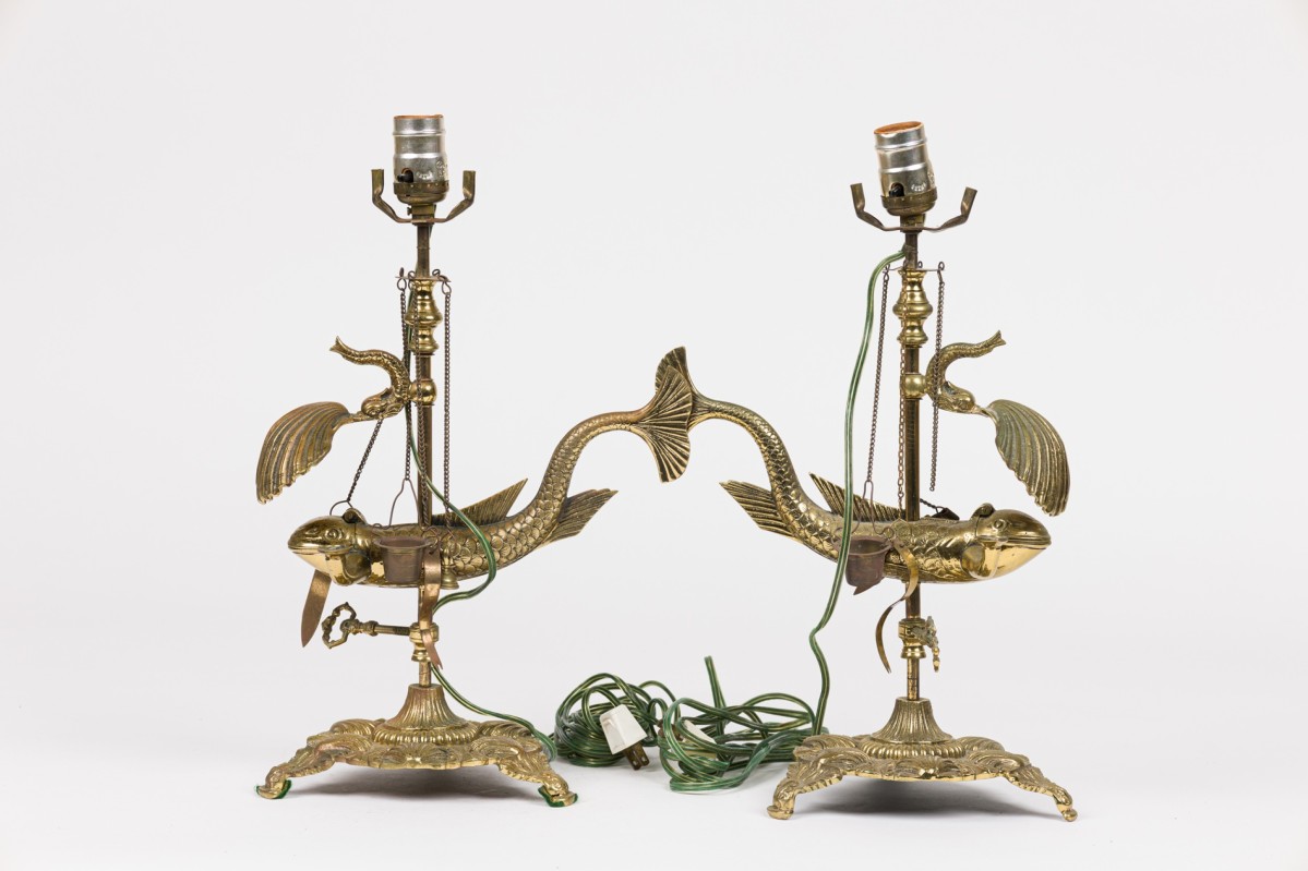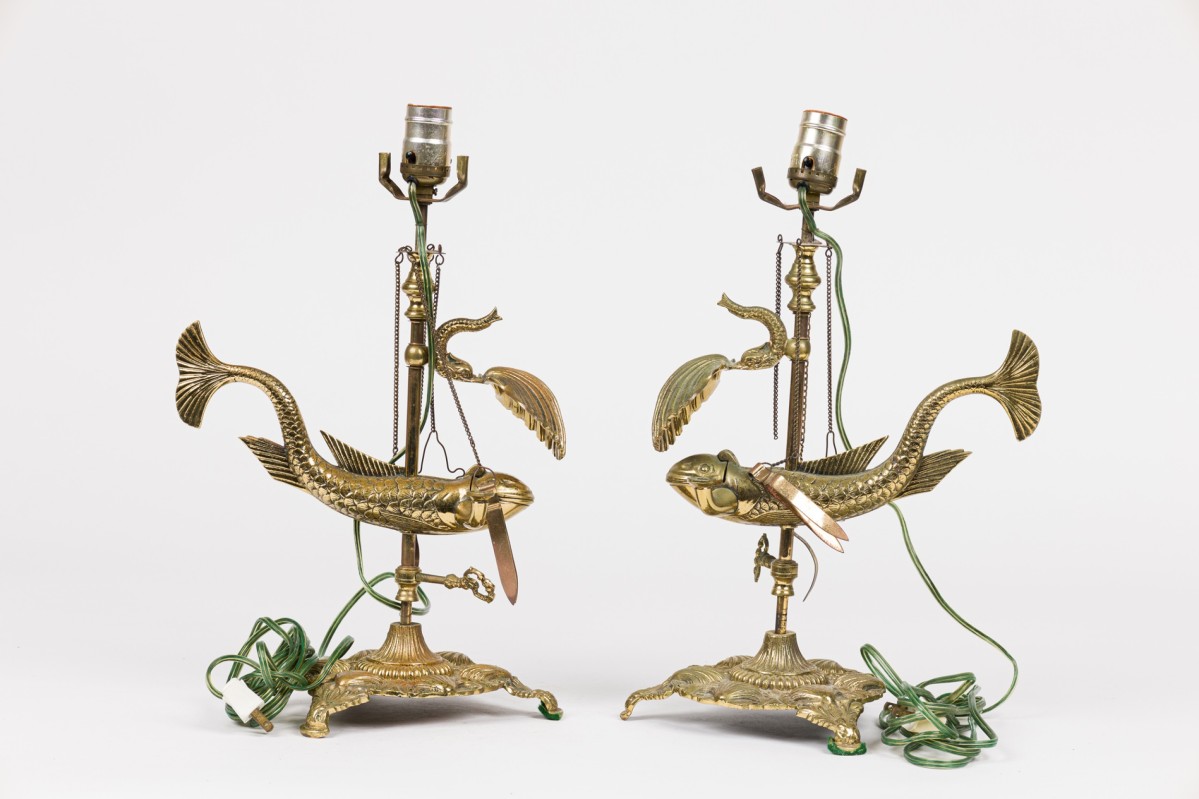 2 PAIR of French Victorian style gilded bronze fish table lamps