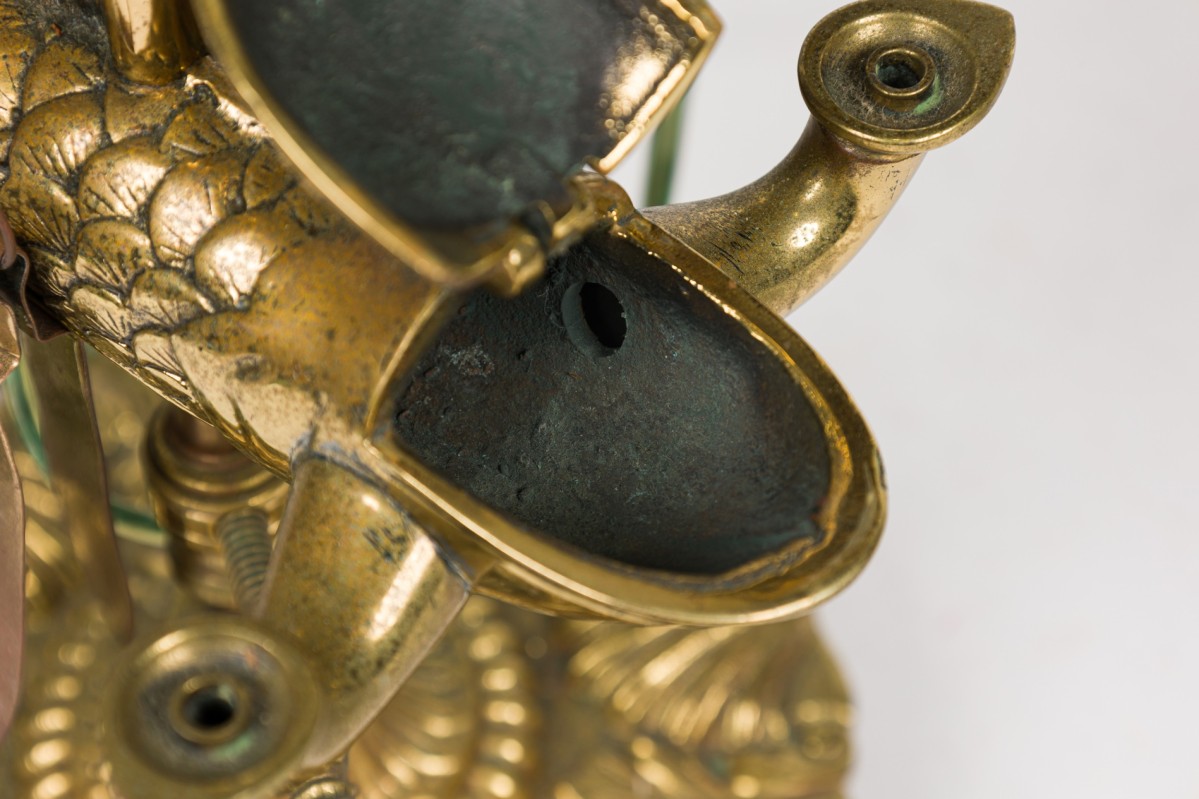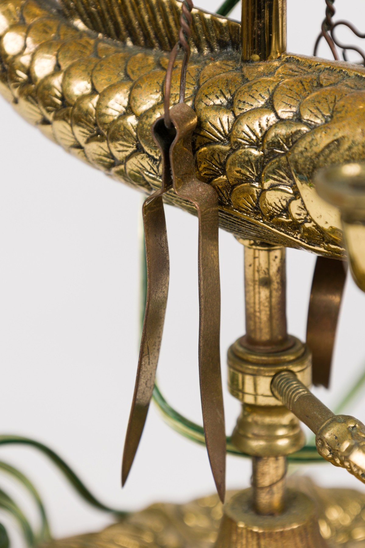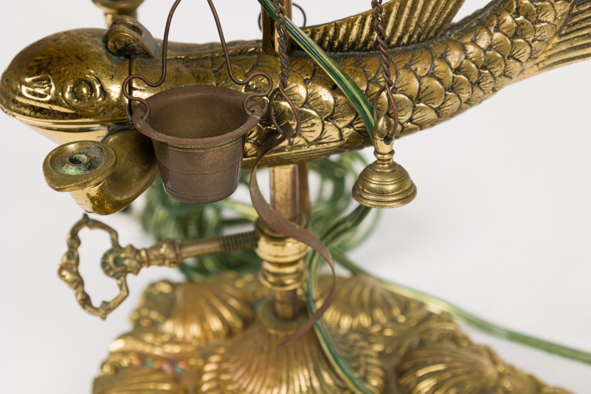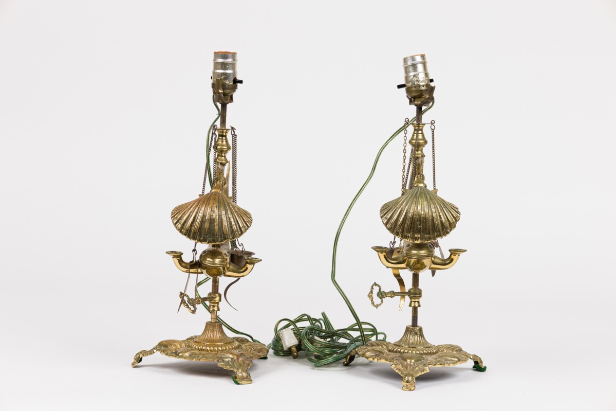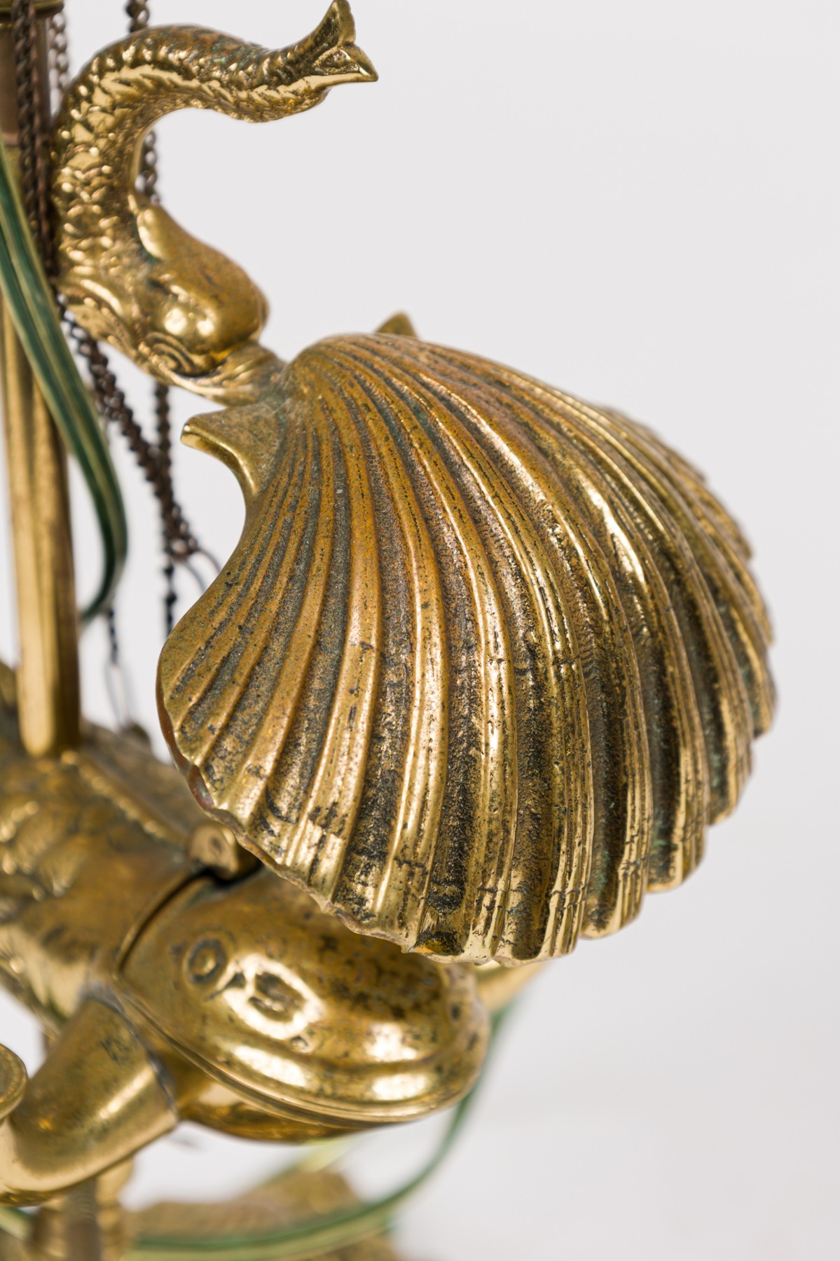 2 French Victorian style gilded bronze fish table lamps with a scallop shell ornamentation ending in three ornate feet emebllished with acanthus leaves and scallop shells (PRICED EACH)