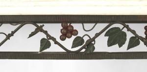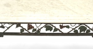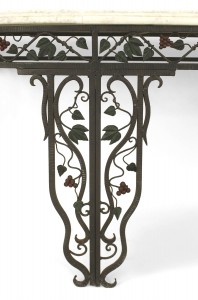 2 French Art Moderne (1940s) wrought iron "D" shaped console tables with floral filigree apron and legs with green leaves and red grapes supporting a white marble top (PRICED EACH)