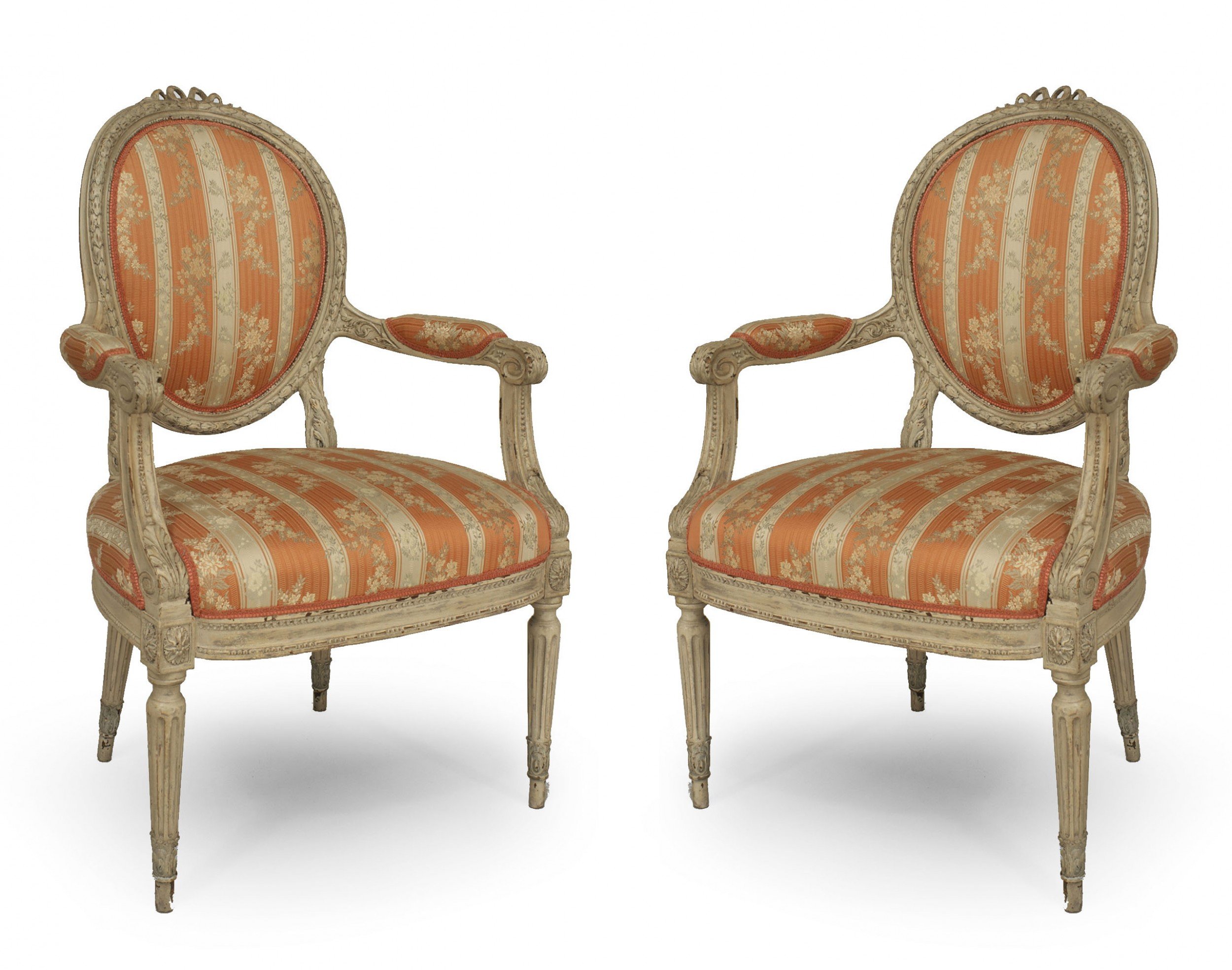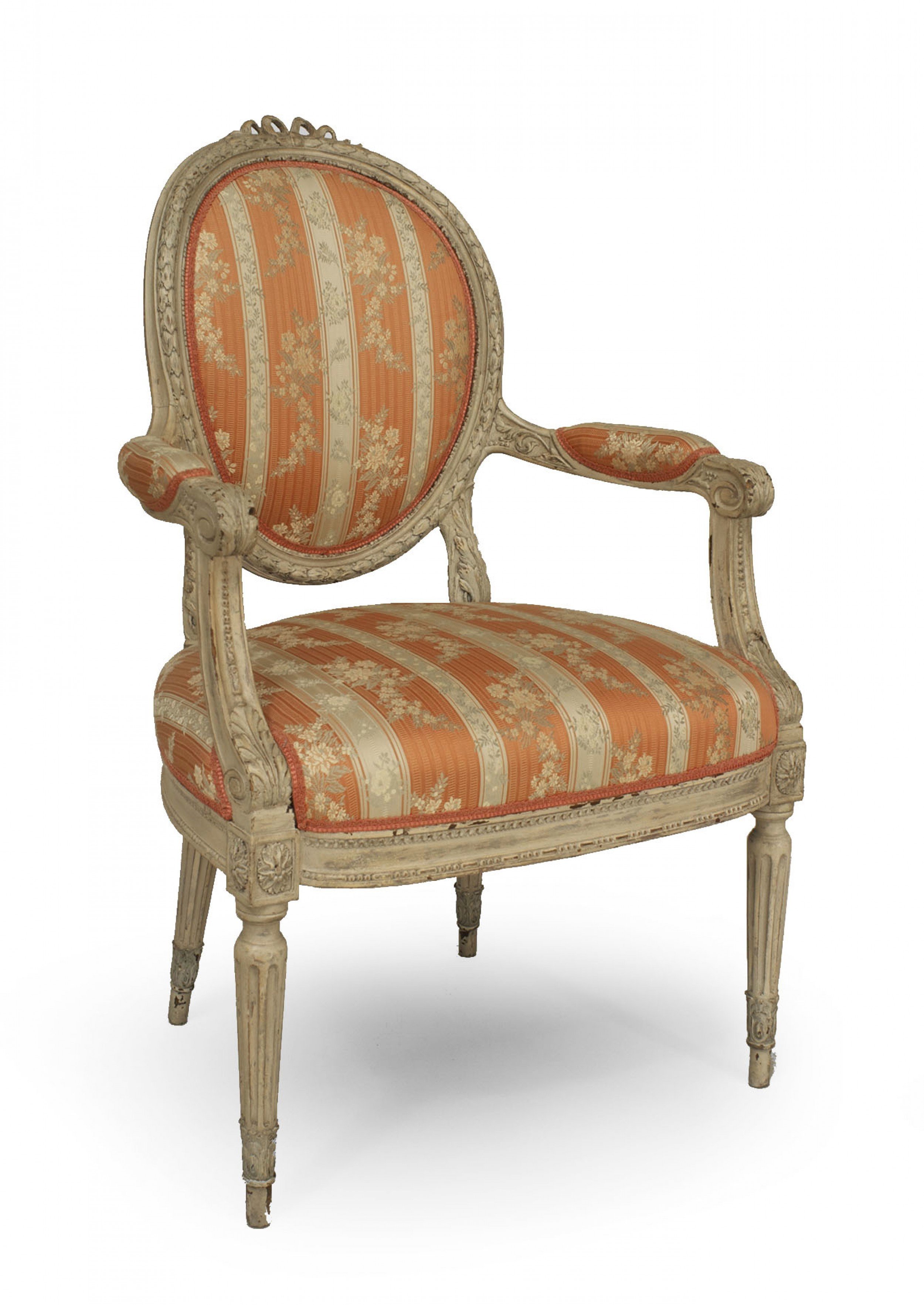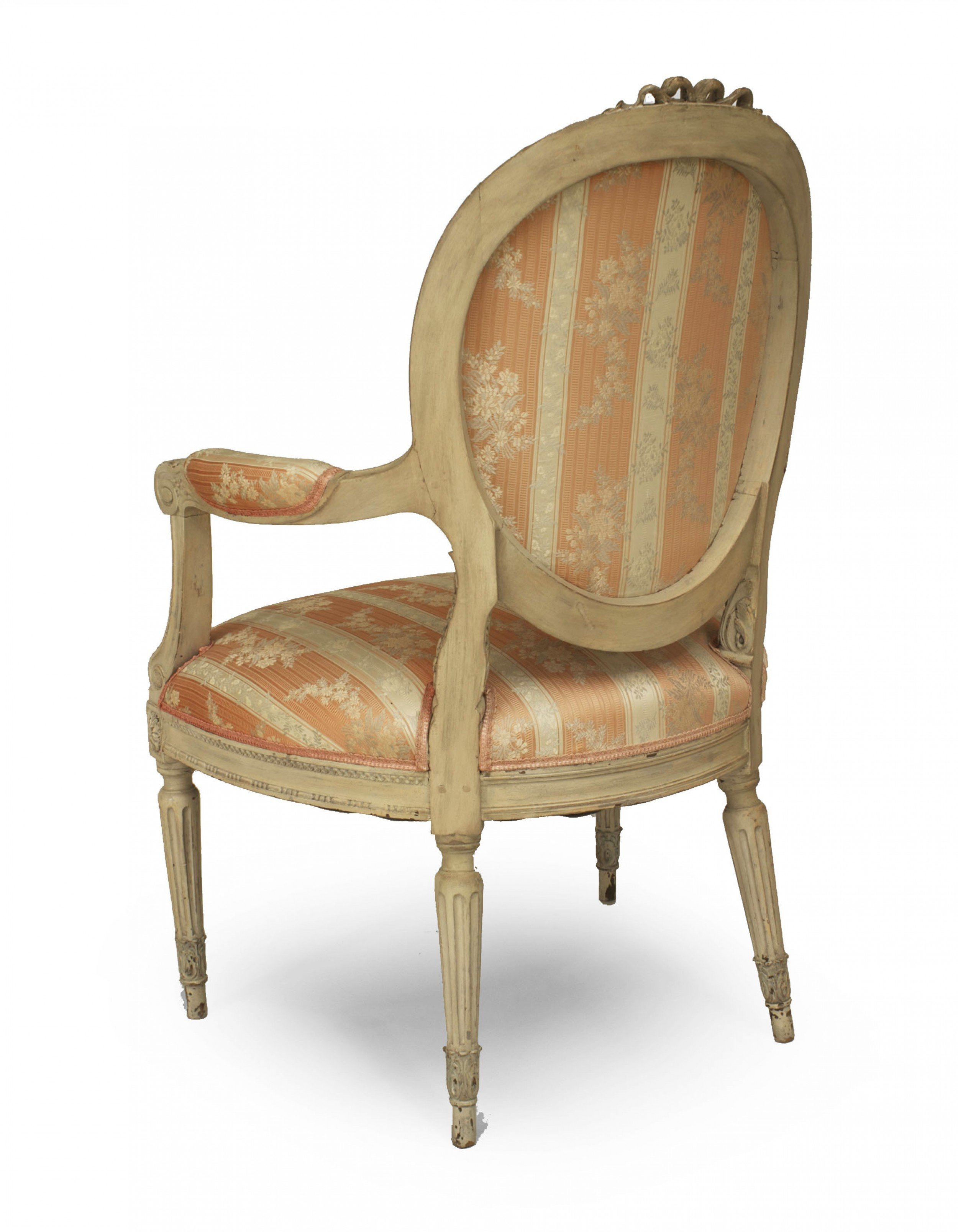 2 French Louis XVI style (19th Cent) white painted dining arm chairs with a carved bow knot top & oval back upholstered in pink & cream damask. (Matching 6 side chairs: ALT001B) (PRICED EACH)