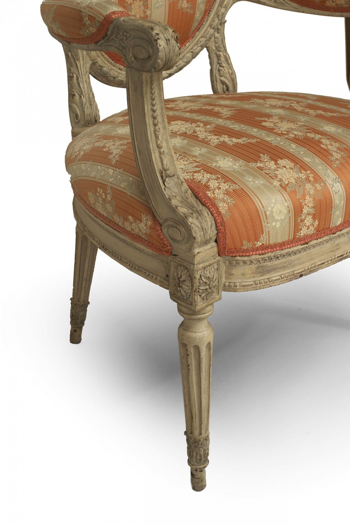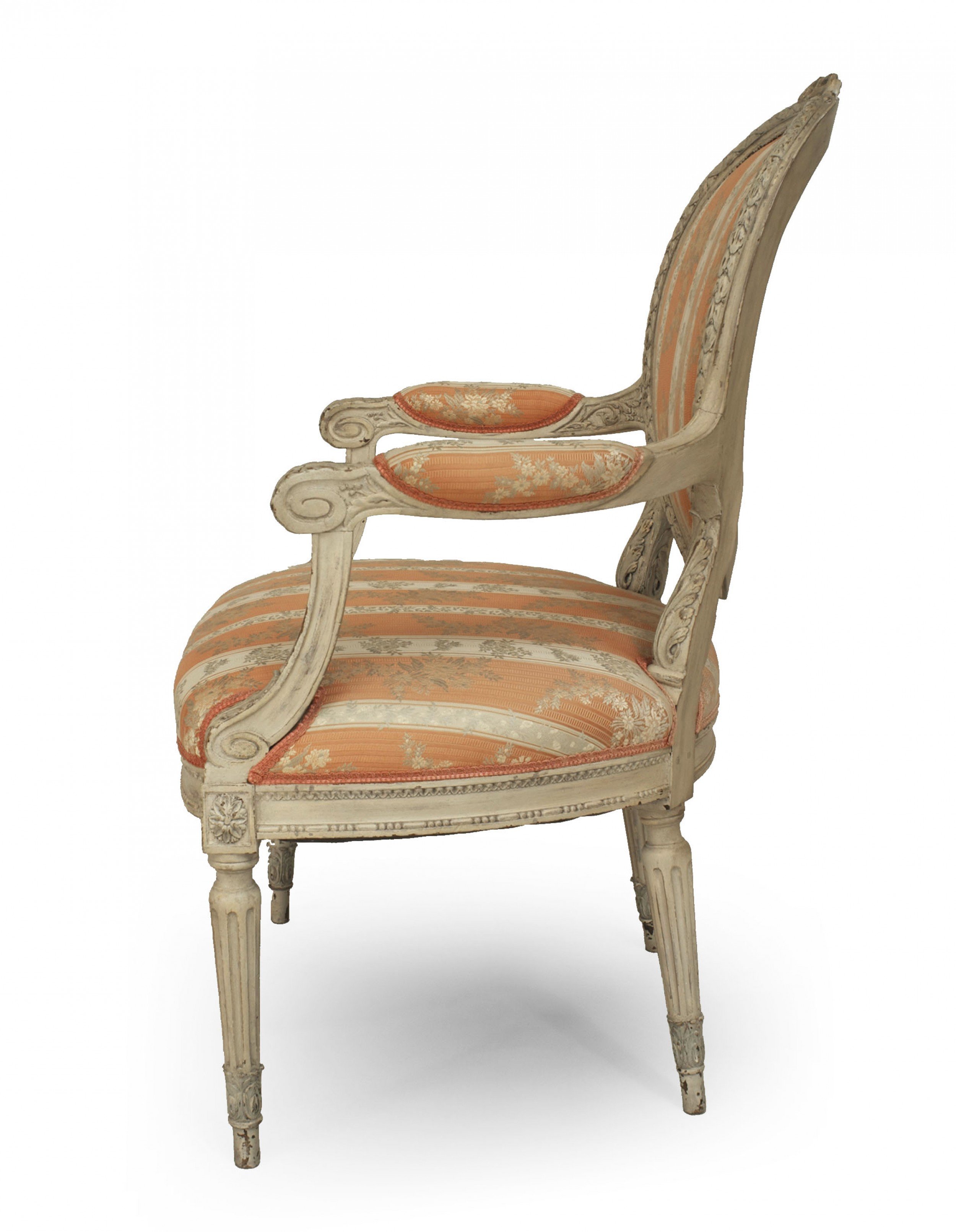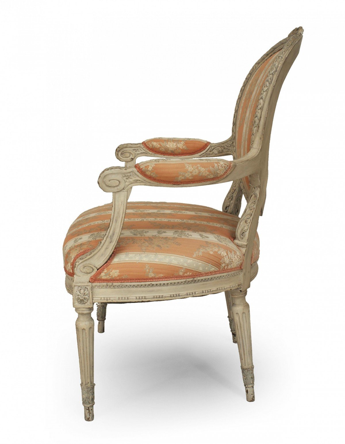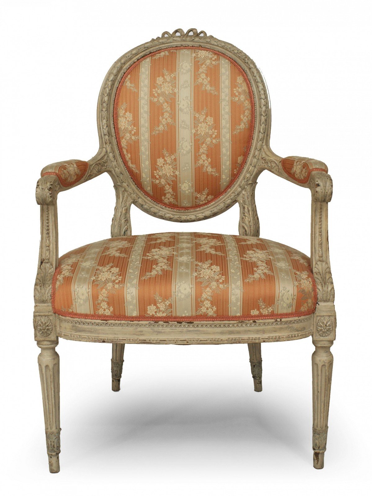 2 French Louis XVI style (19th Cent) white painted dining arm chairs with a carved bow knot top & oval back upholstered in pink & cream damask. (Matching 6 side chairs: ALT001B) (PRICED EACH)