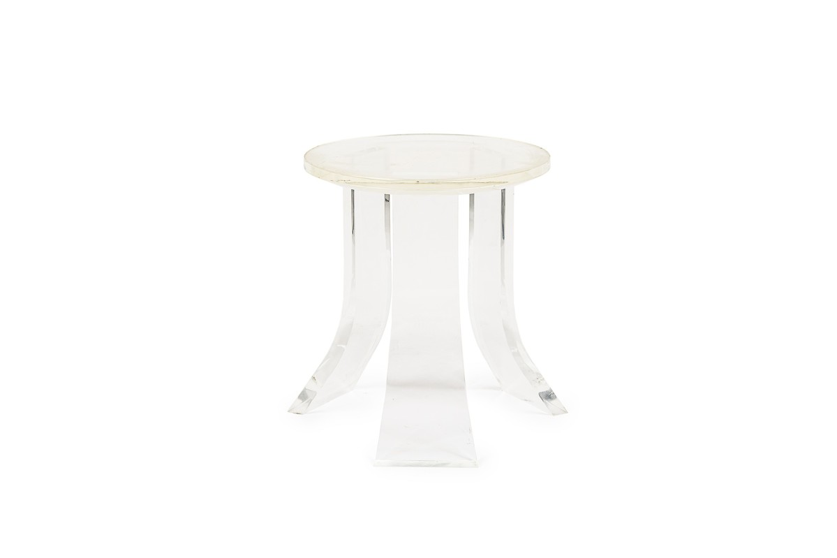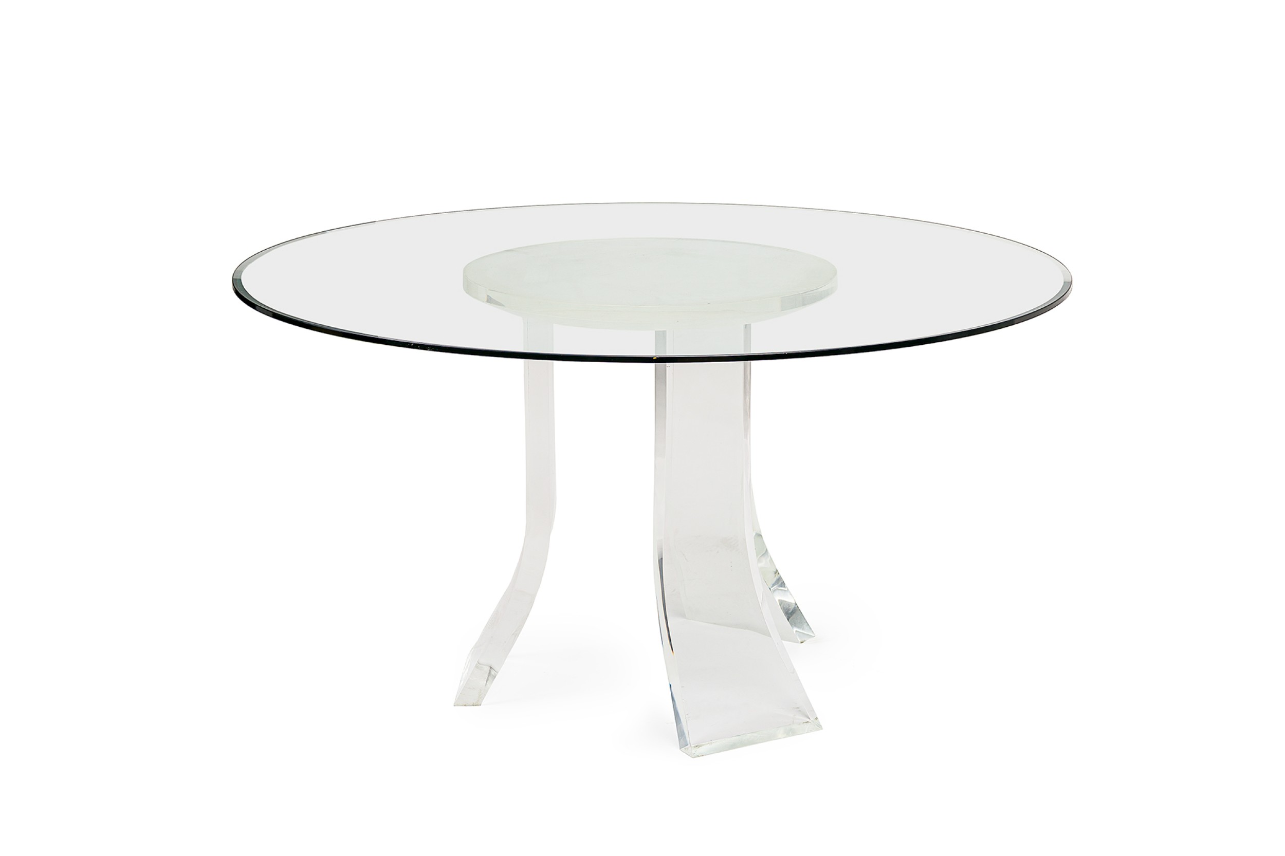 Contemporary American dining / conference table base constructed from a circular piece of clear lucite with three wide flared legs.