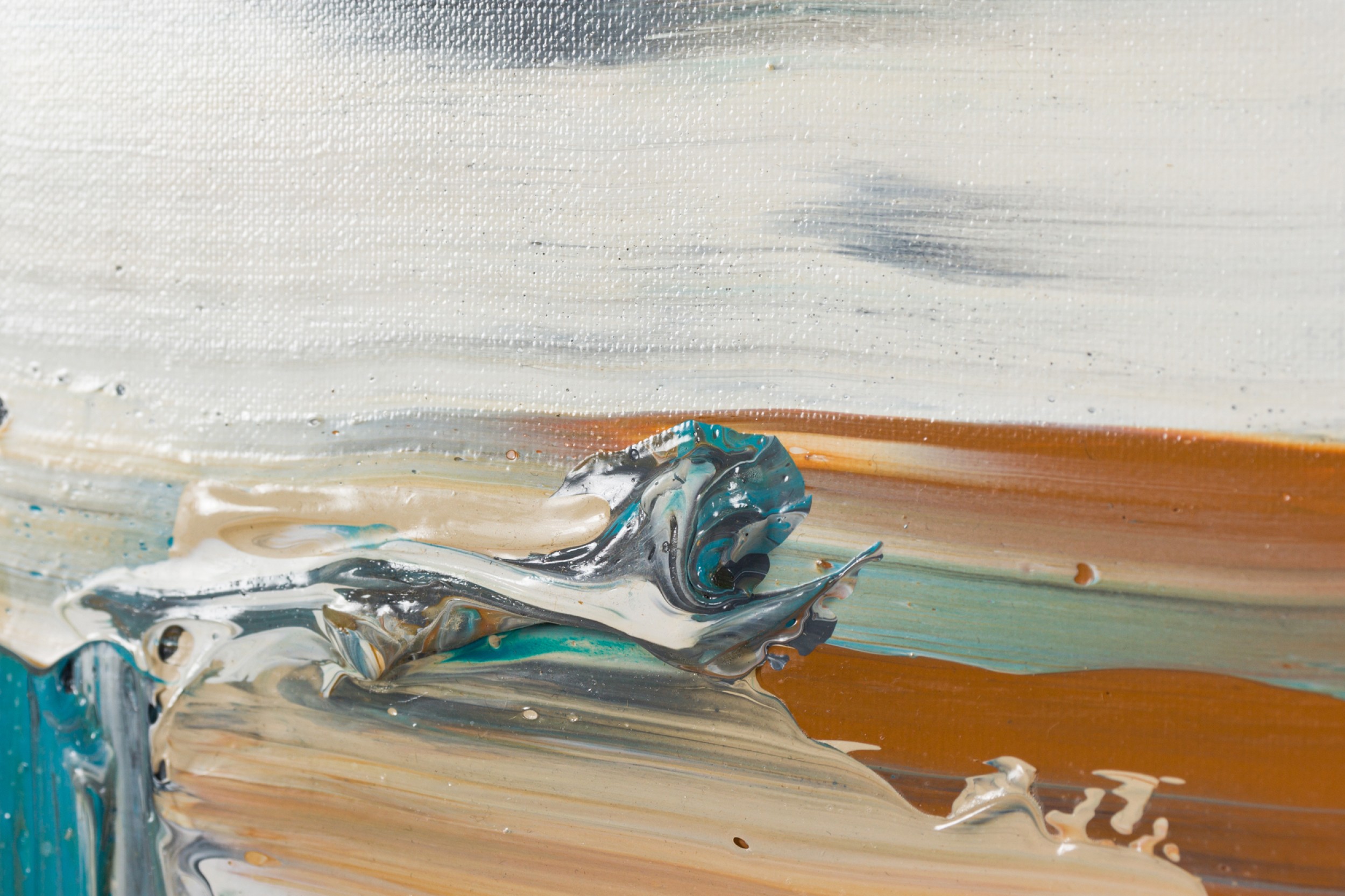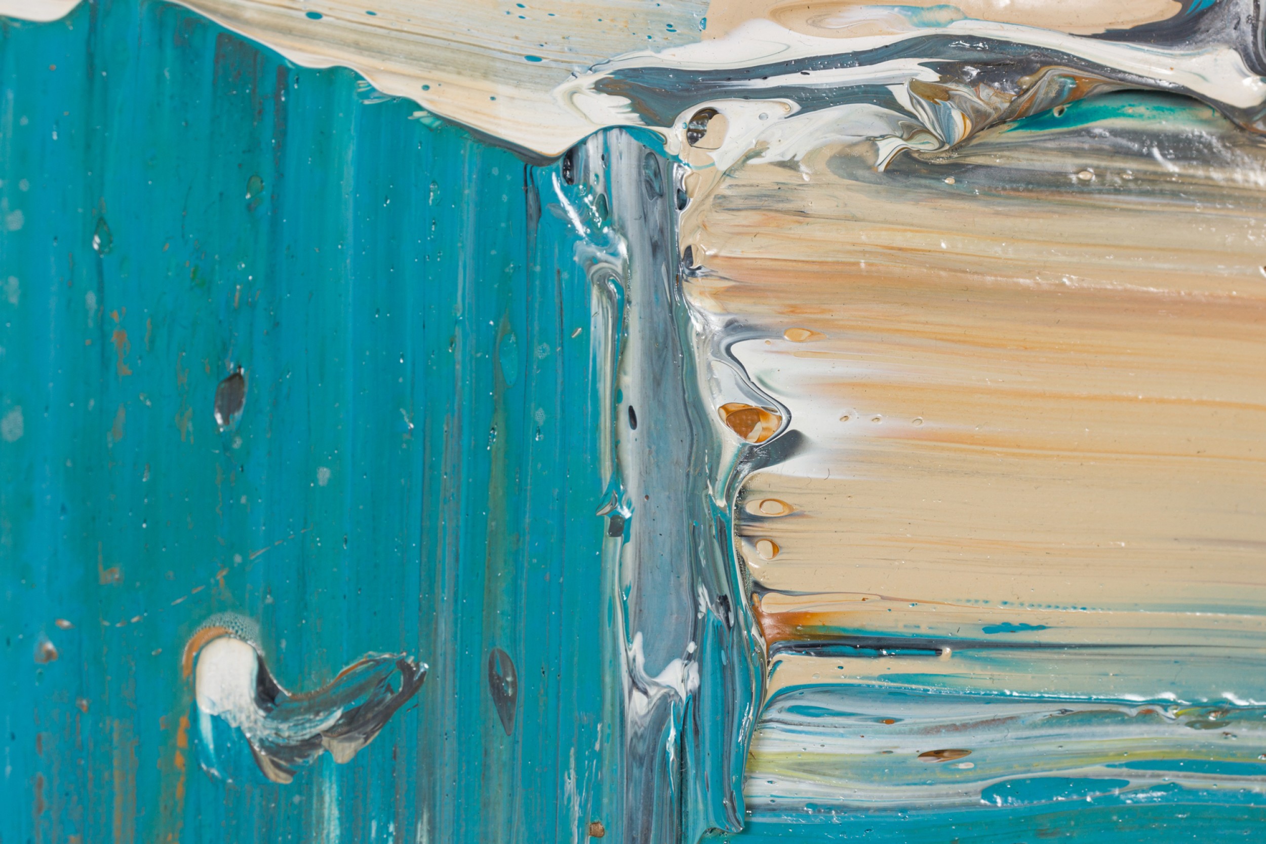 Contemporary abstract oil on canvas painting depicting horizontal and vertical broad brushstrokes in blue, white and ochre (signed: RICARDO RUMI)