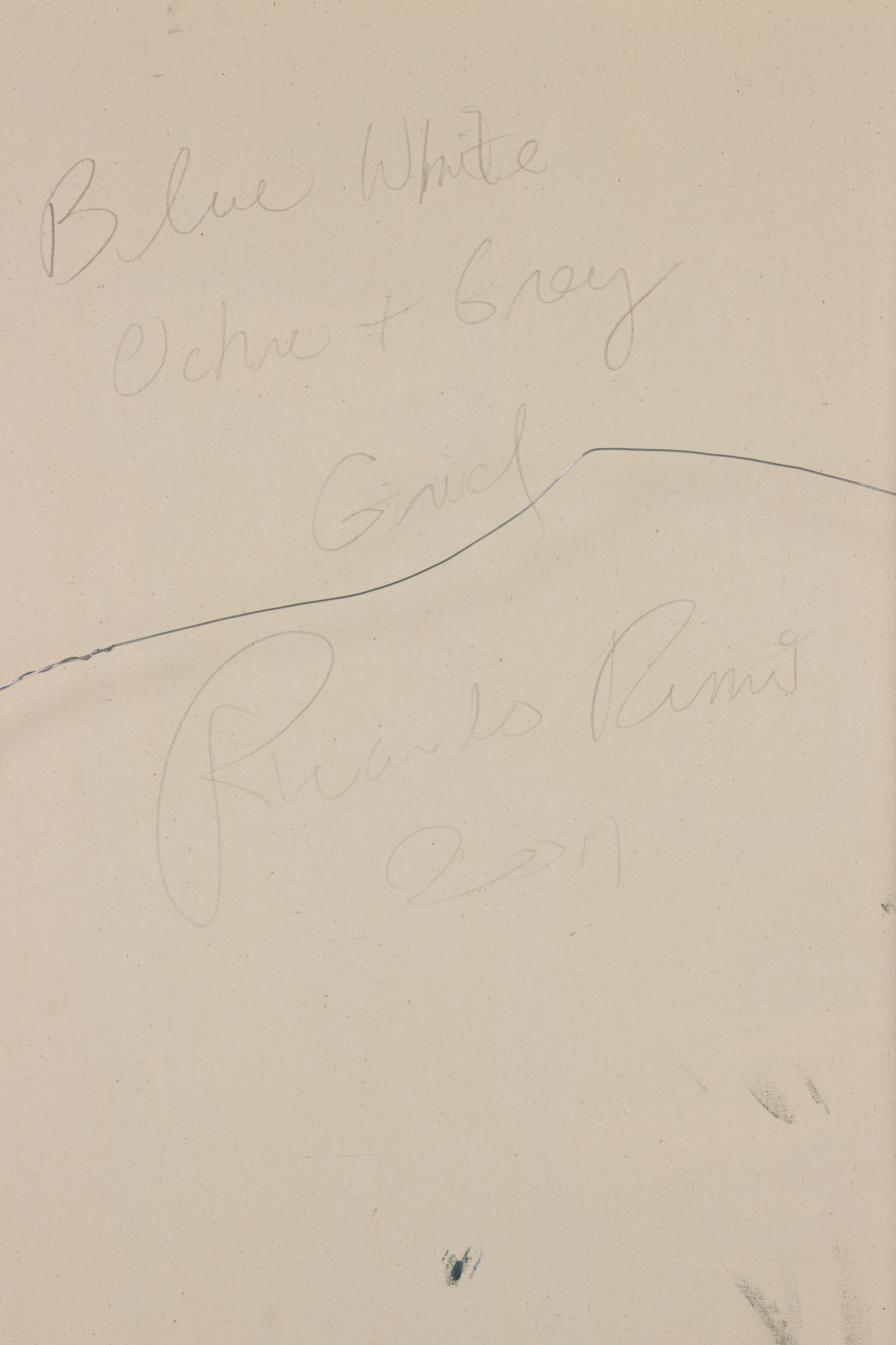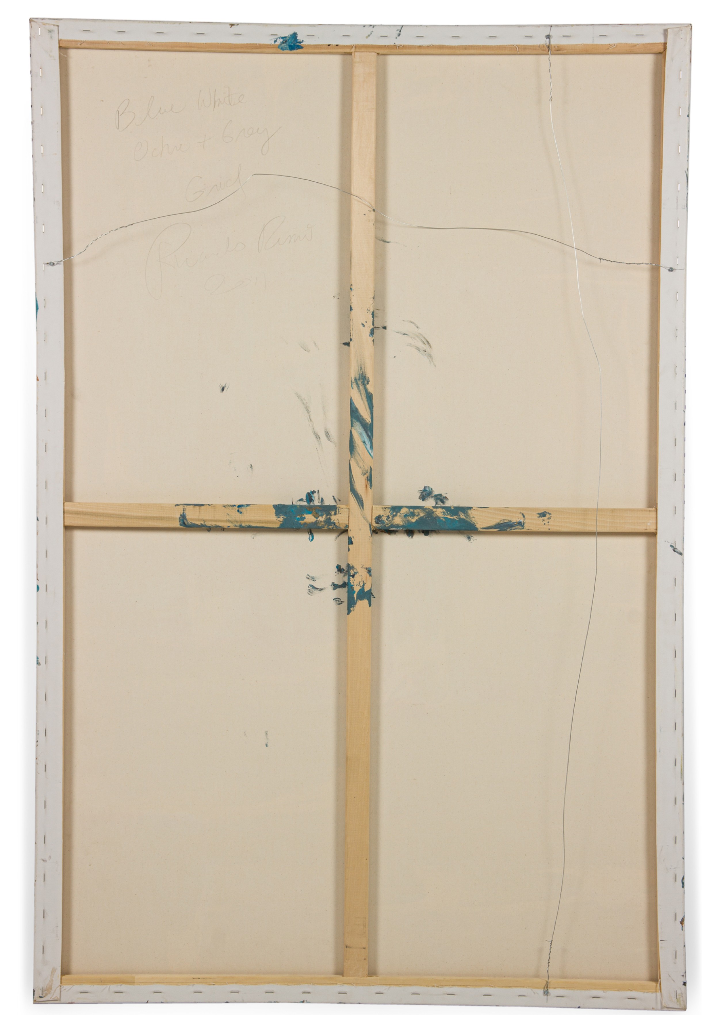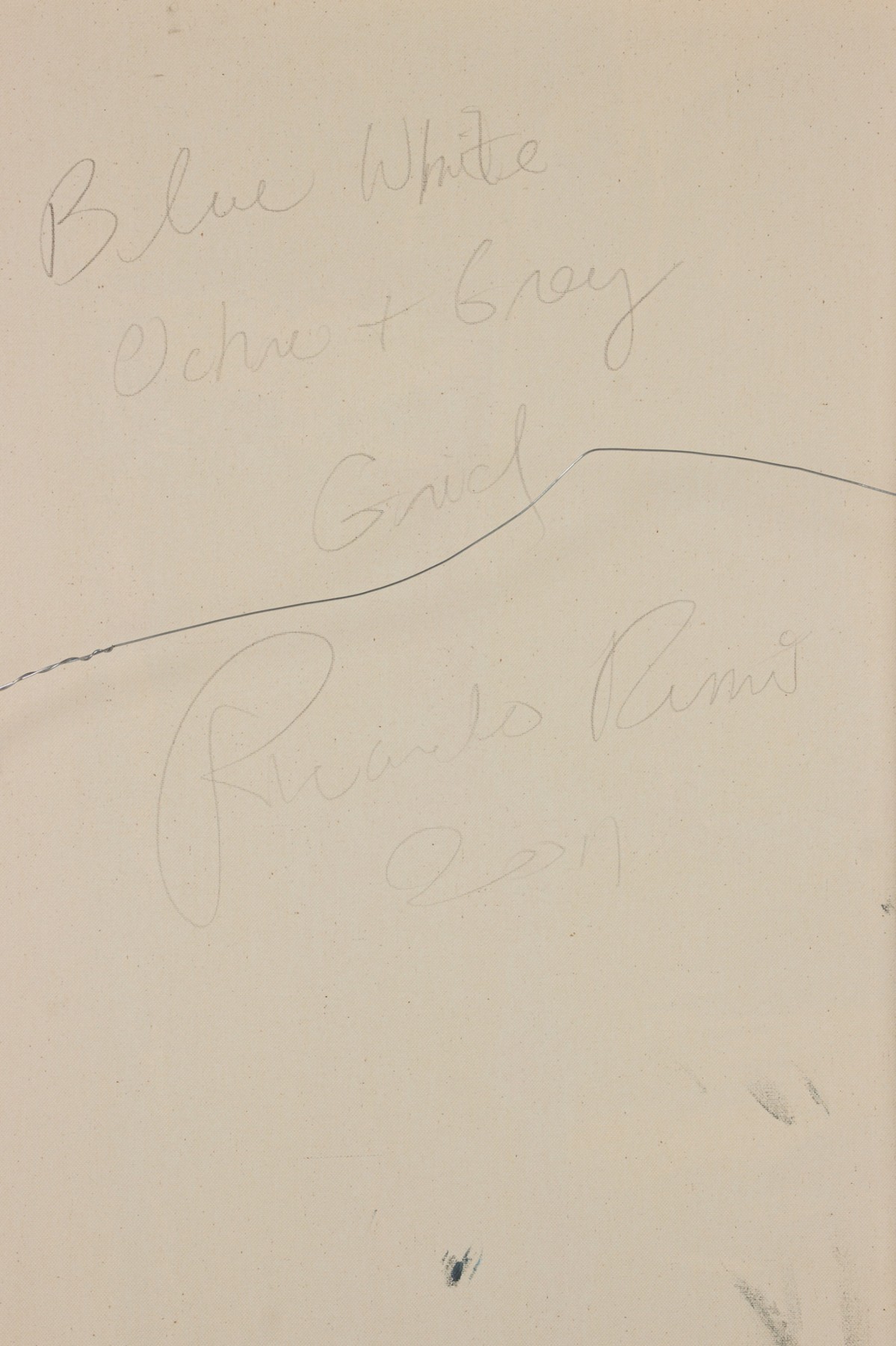 Ricardo Rumi American Contemporary Abstract Oil Painting, titled: "Blue, White, Ochre & Grey Grid" (2011)
