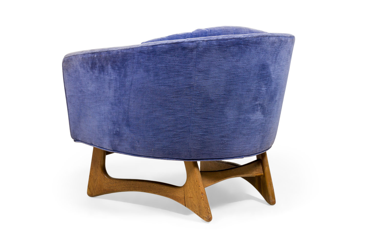 2 American Mid-Century armchairs with freeform sculptured walnut frames and bases, curved backs, and periwinkle velour upholstery with channeled back cushions. (PRICED EACH)