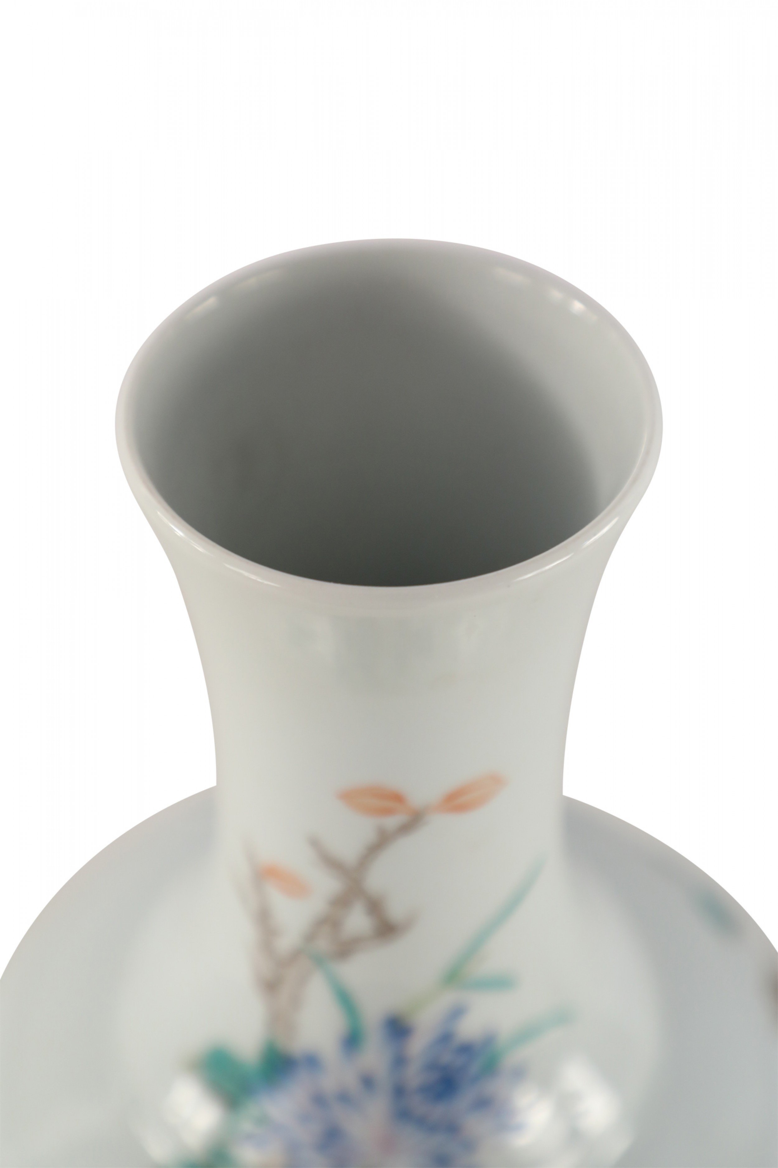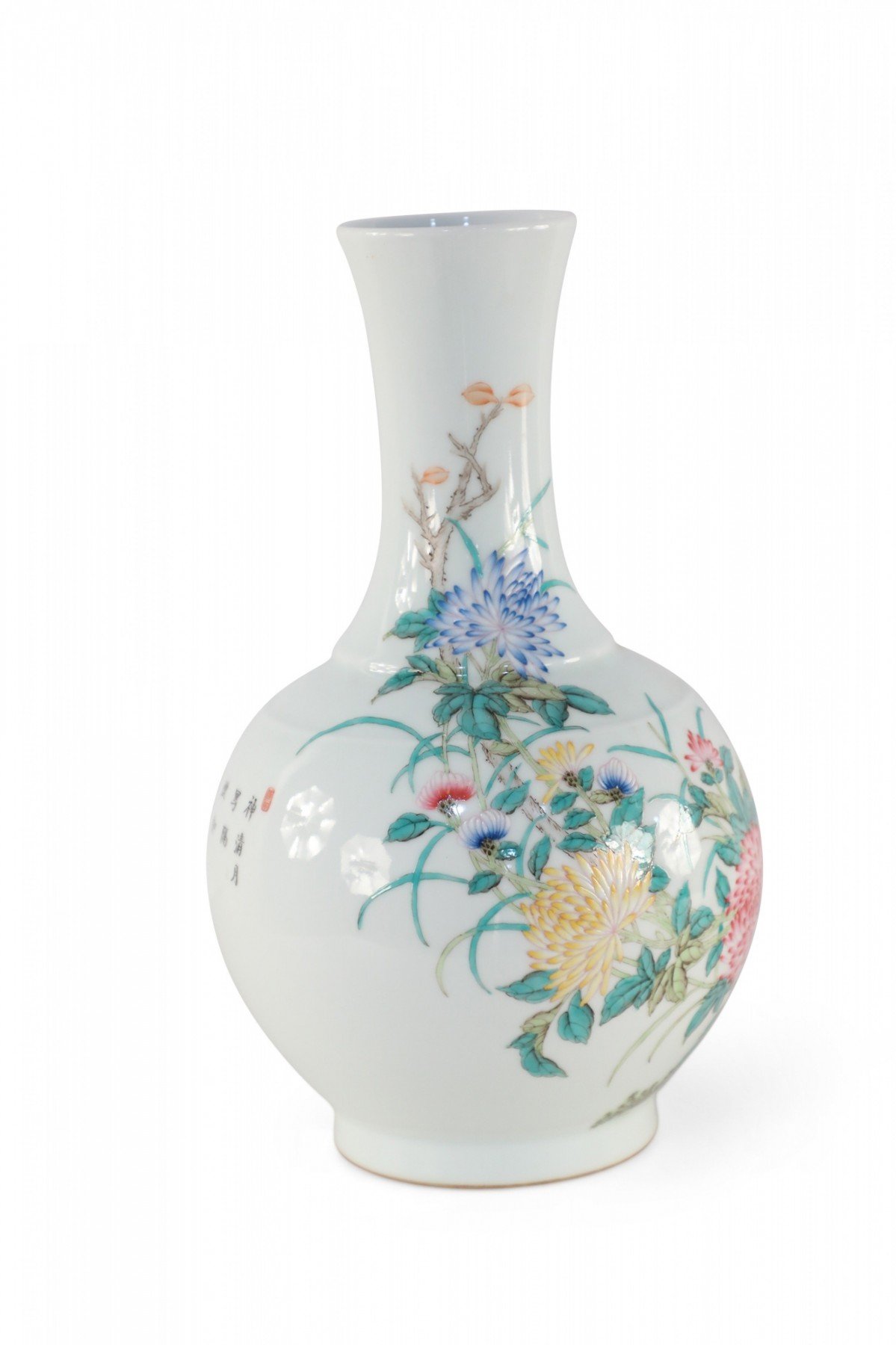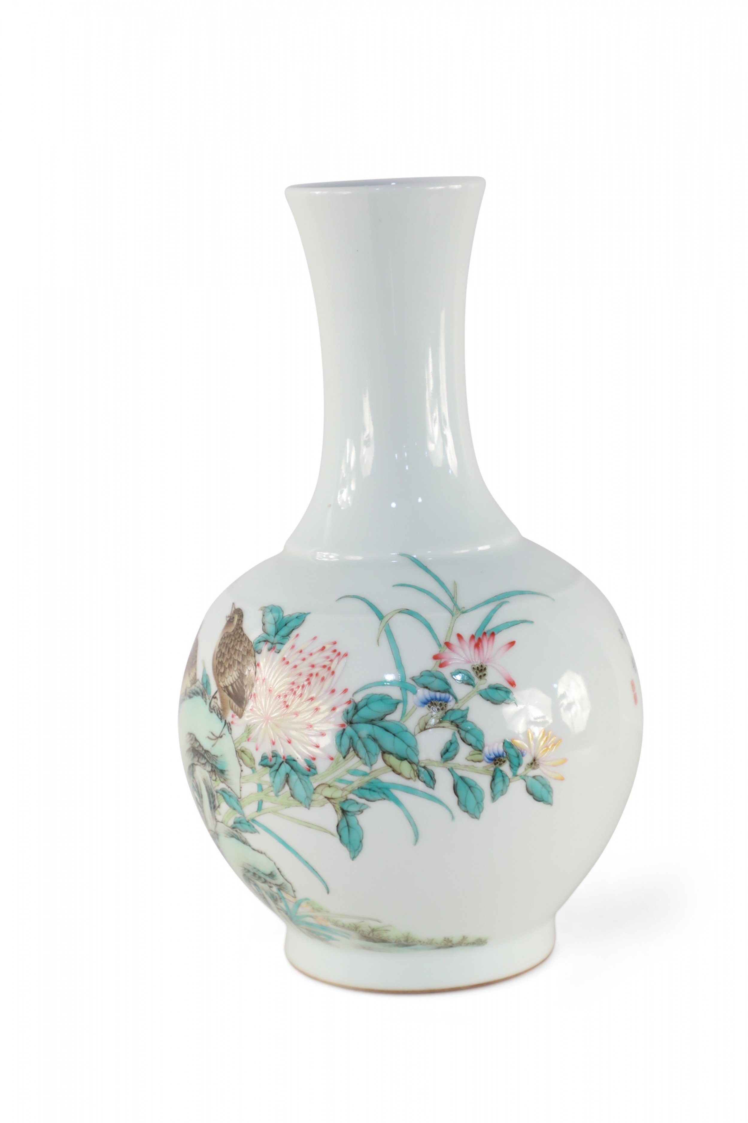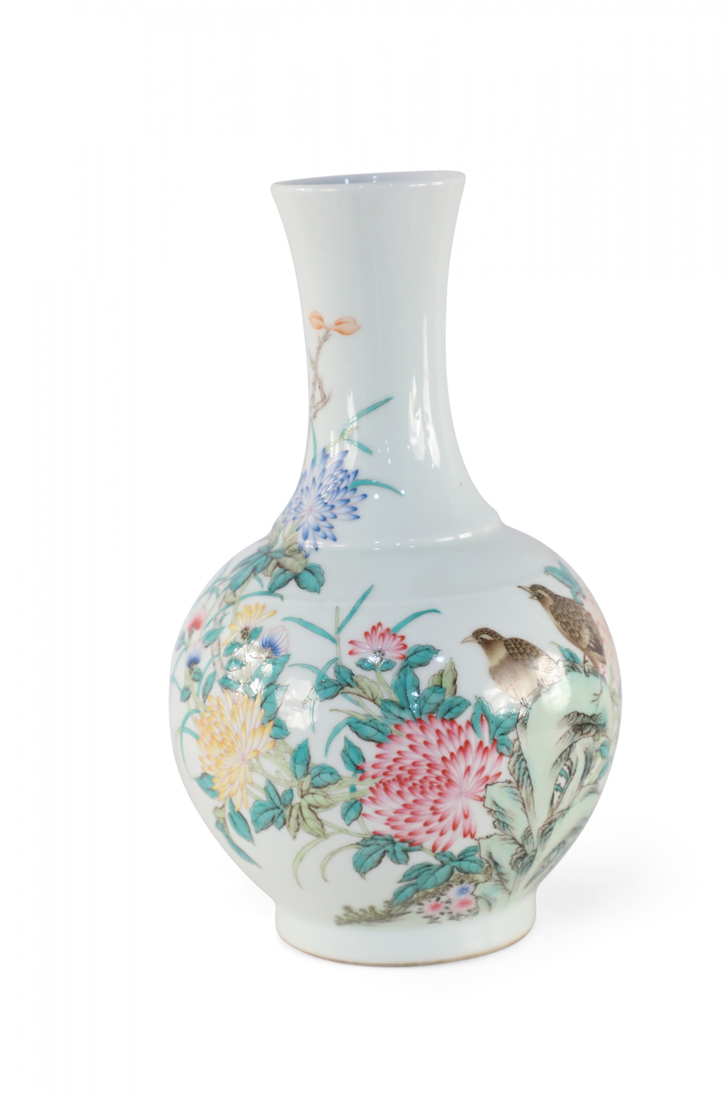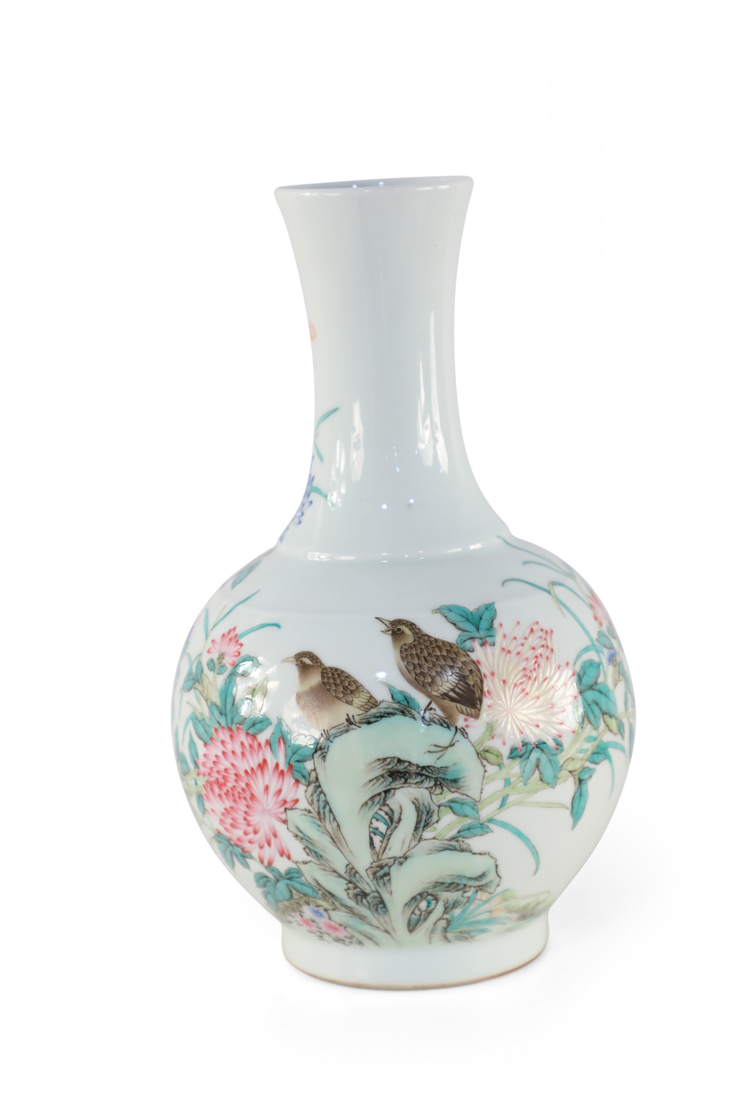Pair of Chinese Qing Dynasty Style White Chrysanthemum and Quail Design Globular Porcelain Vases