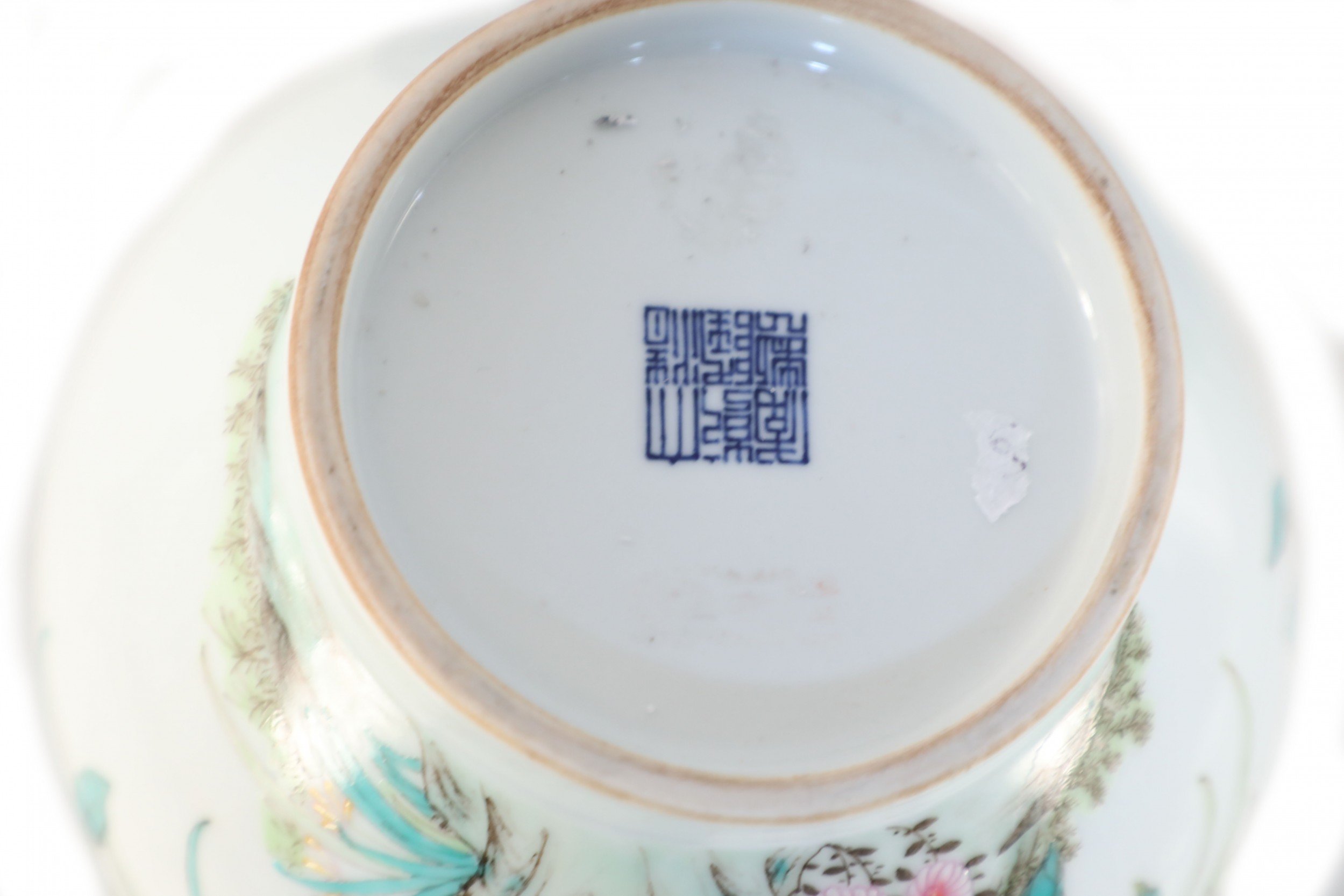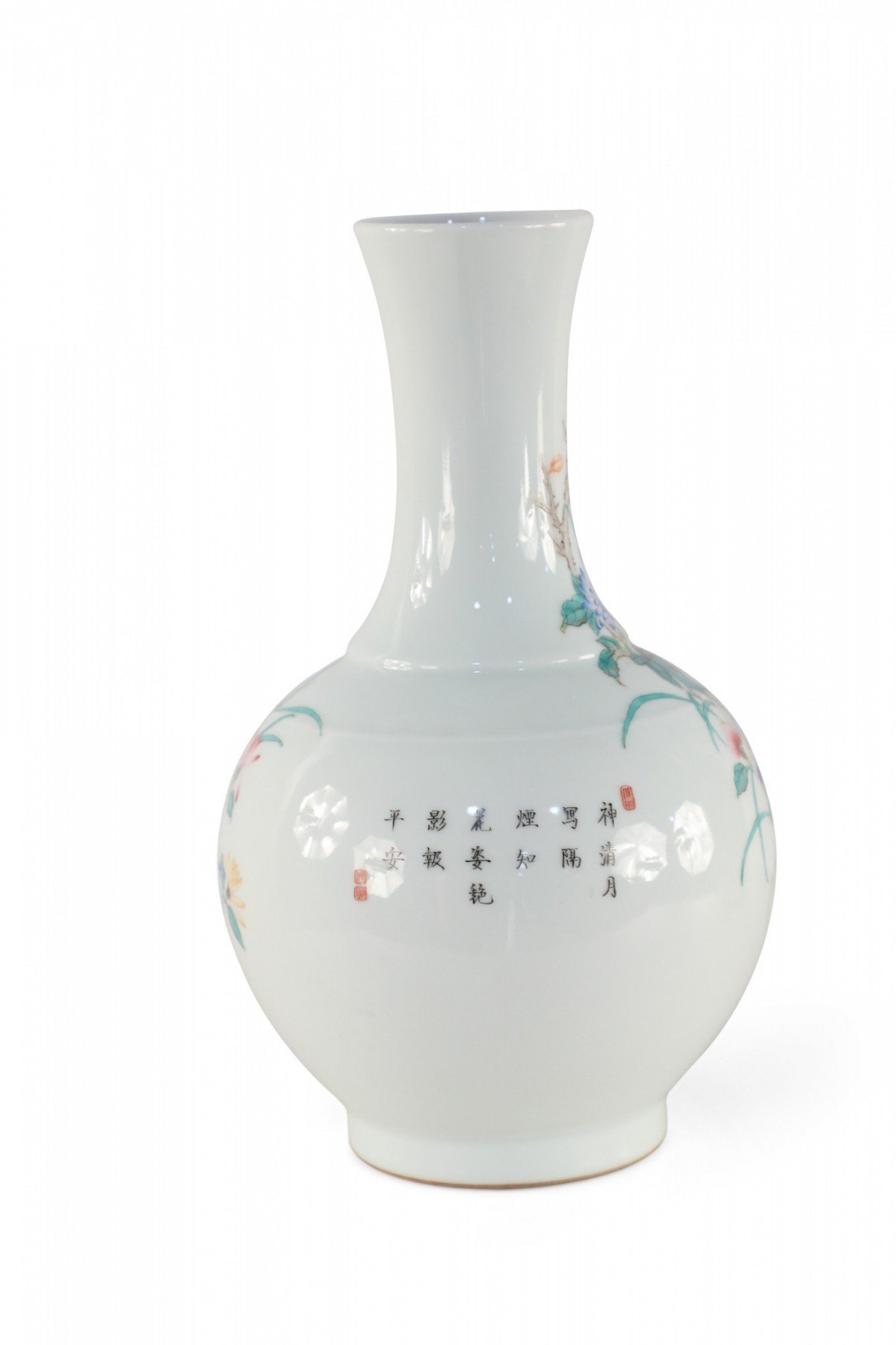 PAIR of Chinese Qing Dynasty Qianlong Period-style (late 19th Century) white porcelain globular vases decorated with mirrored quail and chrysanthemum designs, symbolizing a safe home and happy career, on the vase fronts and characters on the reverse (PRICED AS PAIR)