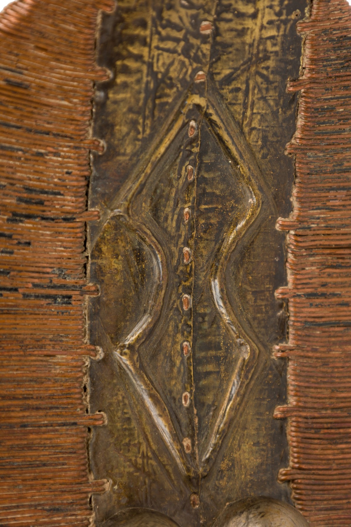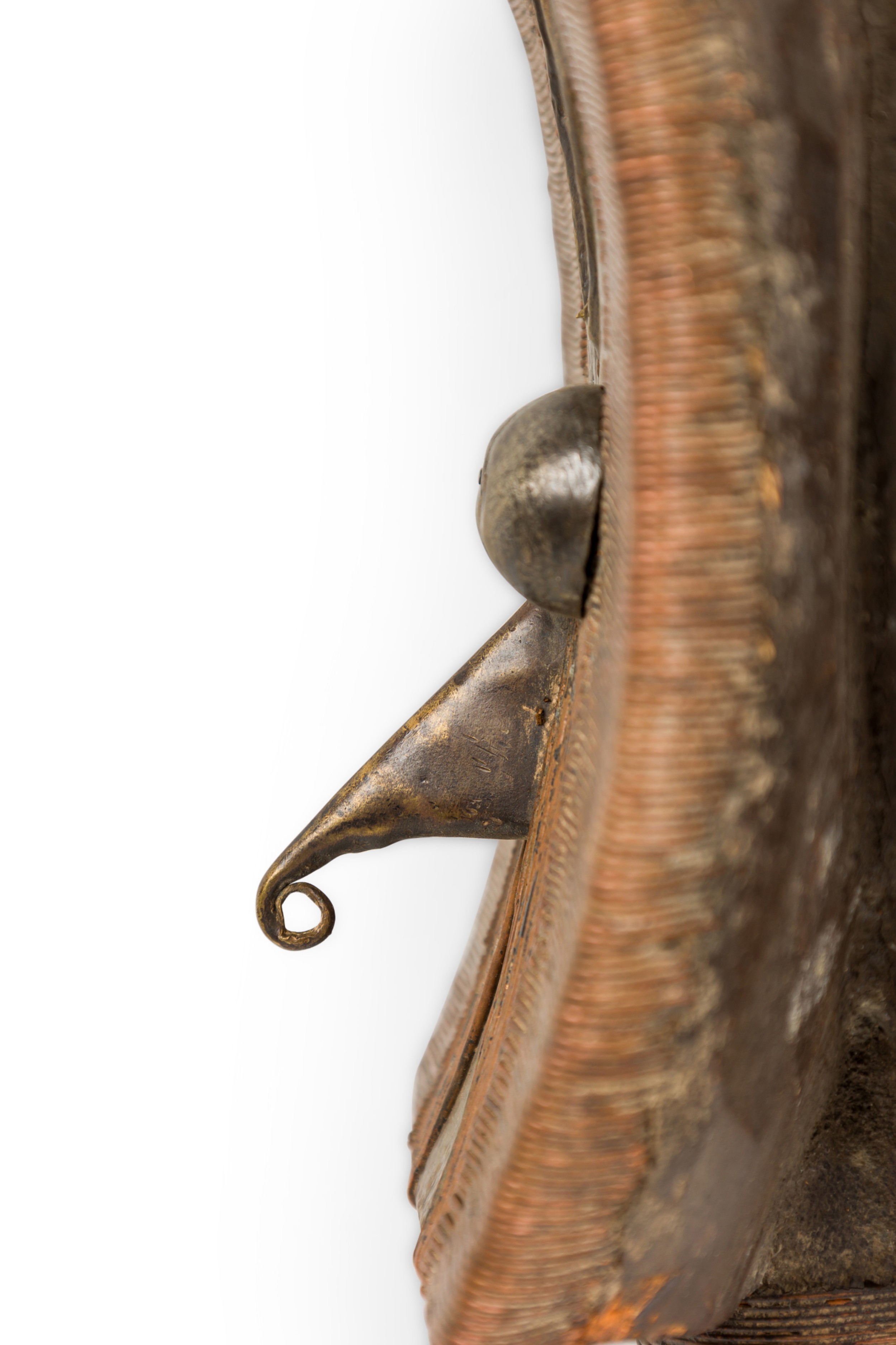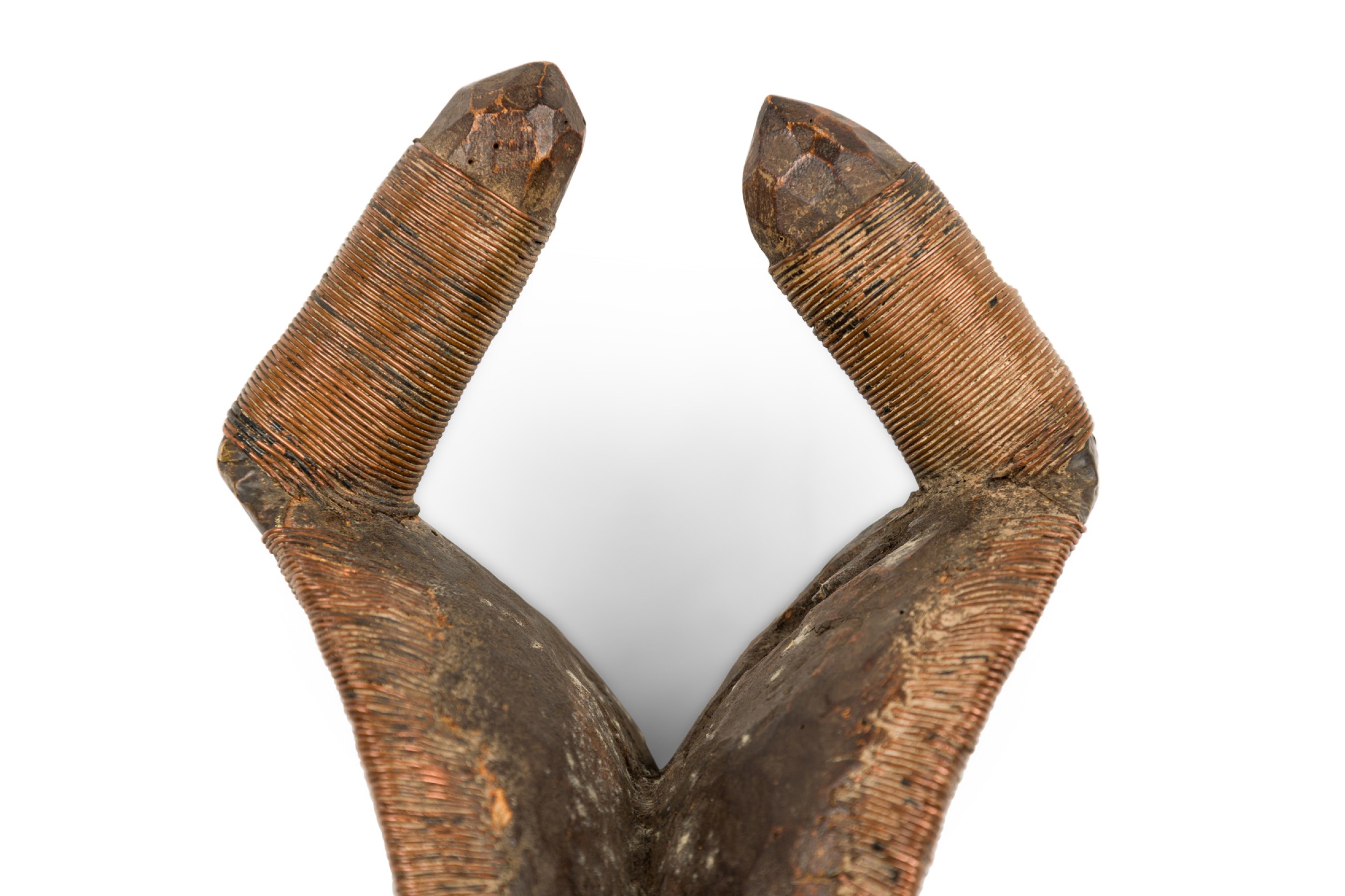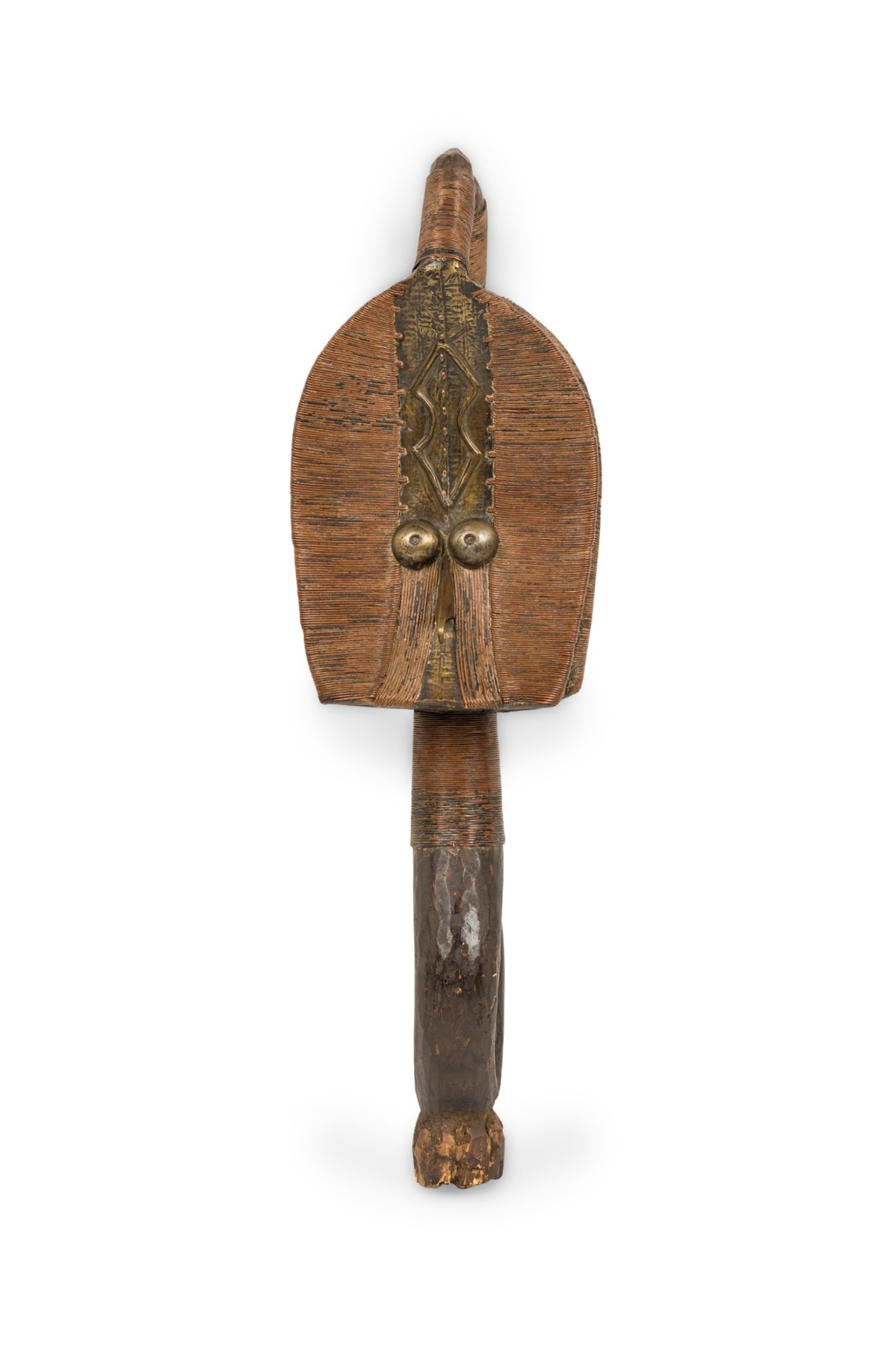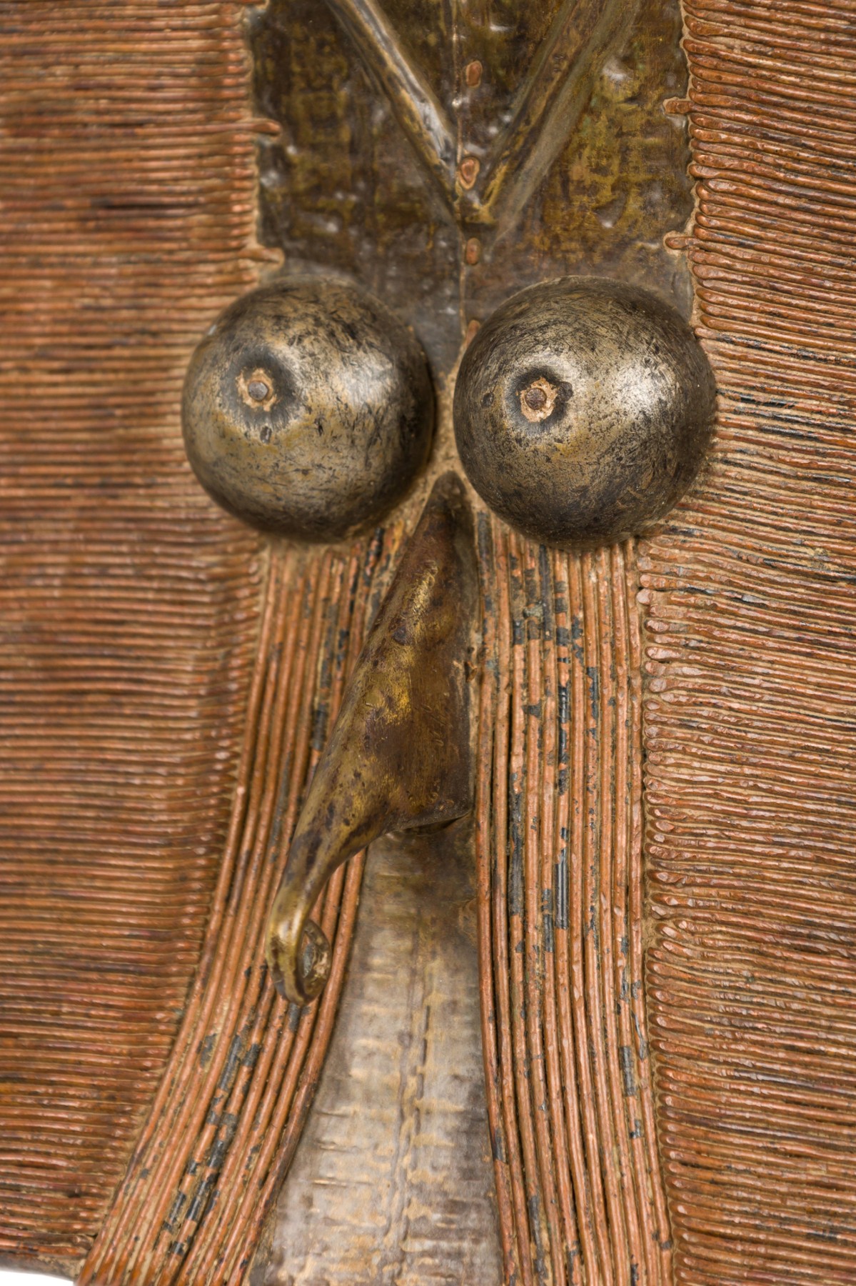 Gabonese 20th c. Reliquary hand made by the Kota people depicting a 2-sided / faced abstract figure with domed eyes and hooked noses, crafted from carved wood, copper and bronze