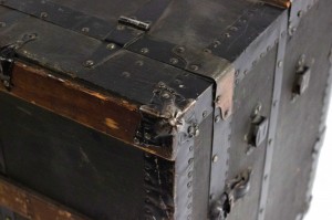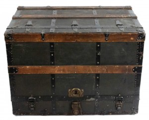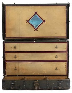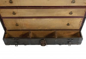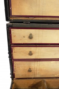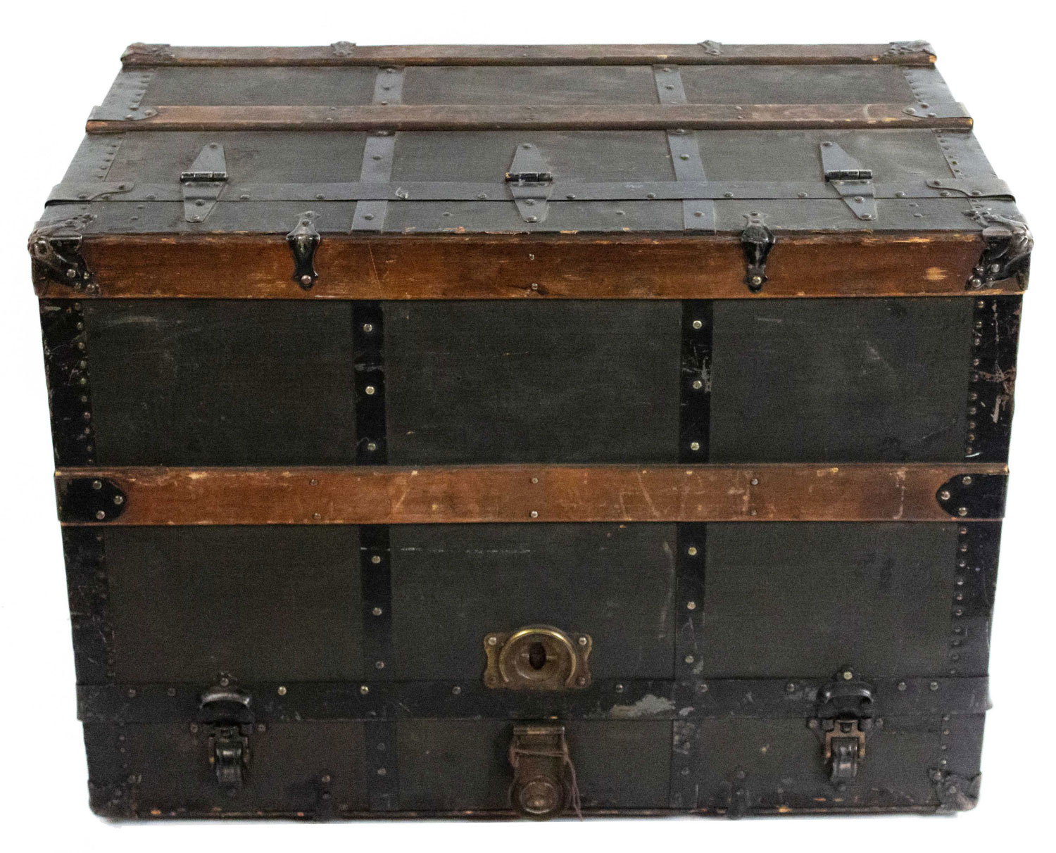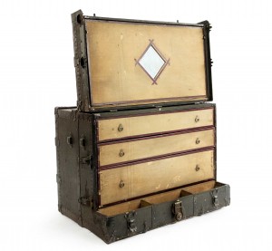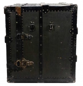 American ebonized canvas floor trunk with theatrical vaudeville design and drawers with mirror interior with metal and oak trim (19/20th Cent)