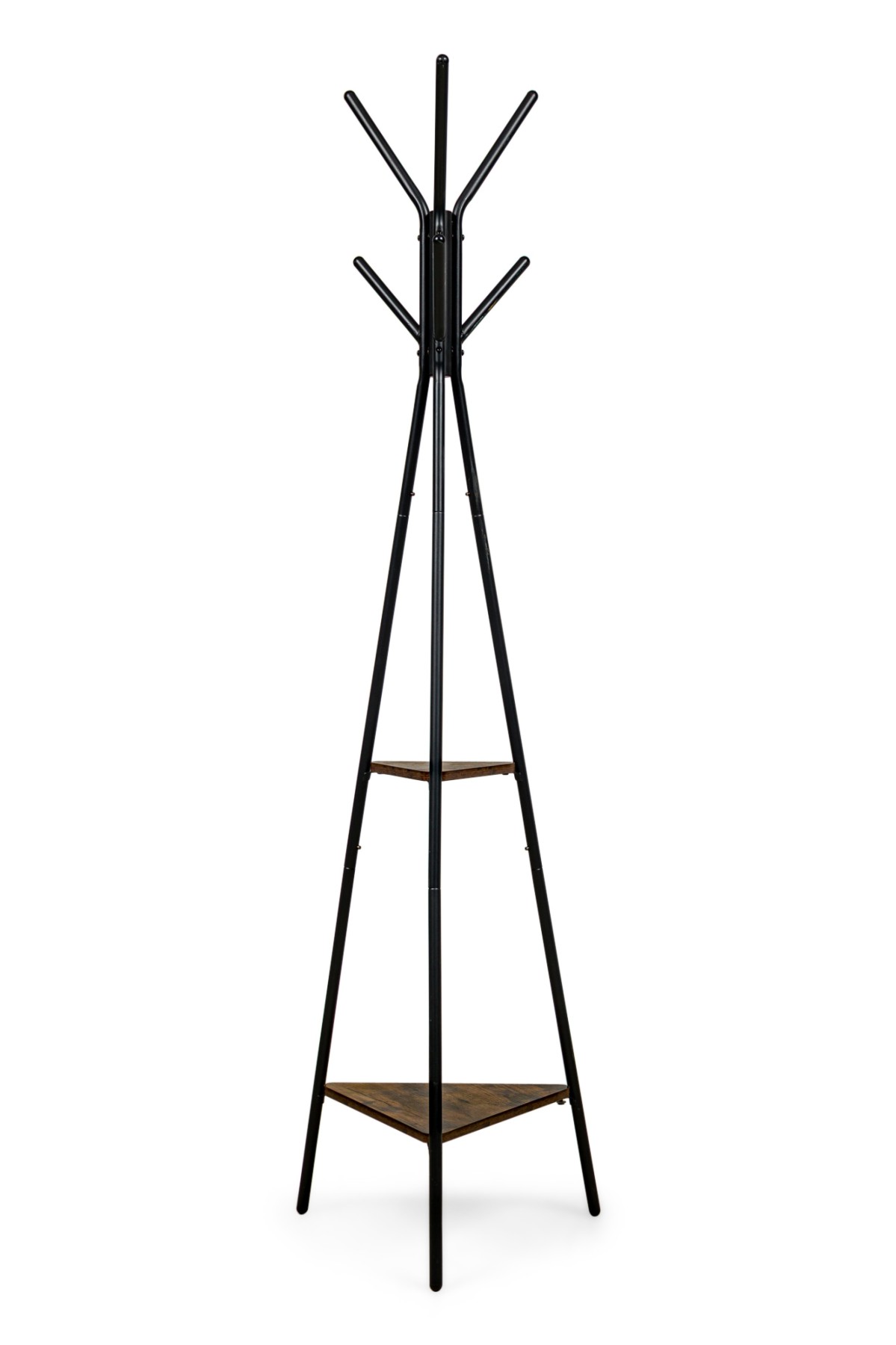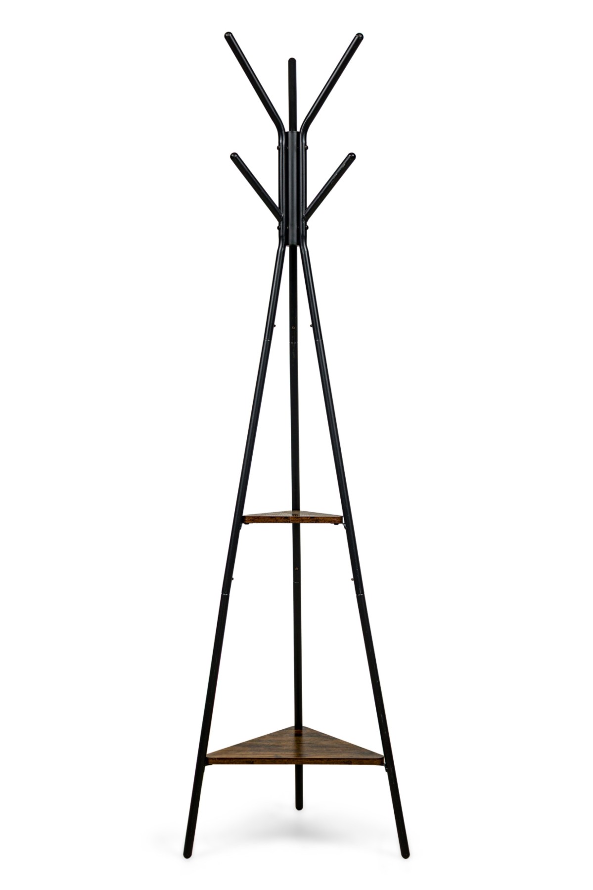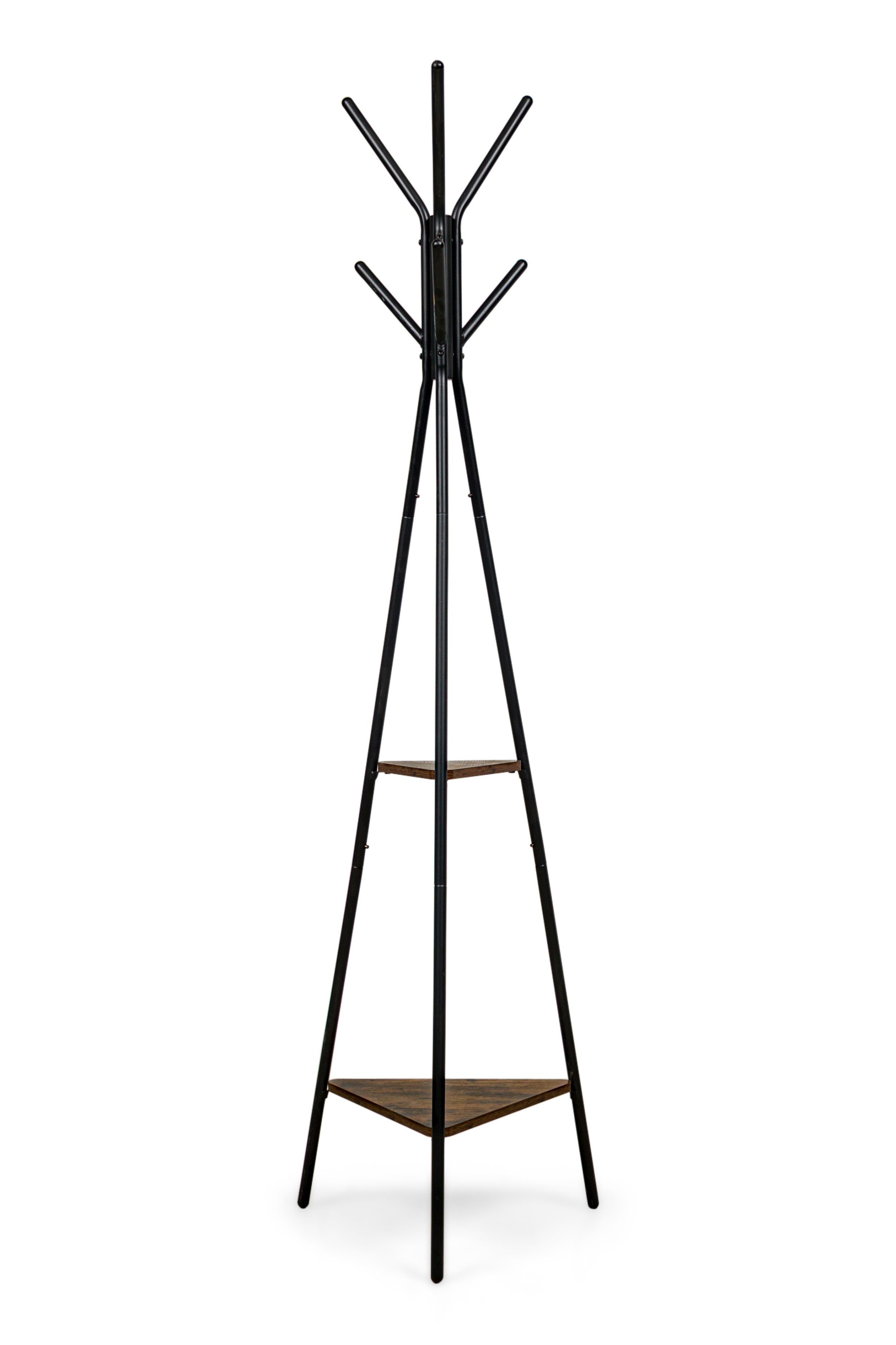 American Mid-Century style free standing black metal coat/ hattrack with prongs to hang and a triagular center shelf and platform base ending on three metal legs.
