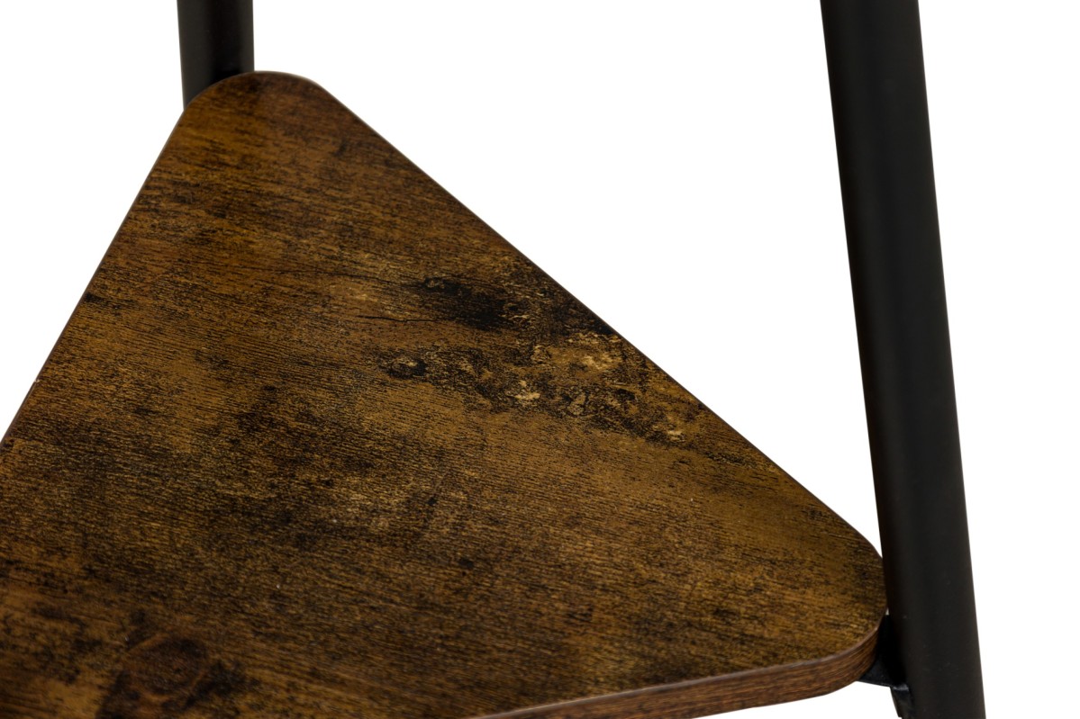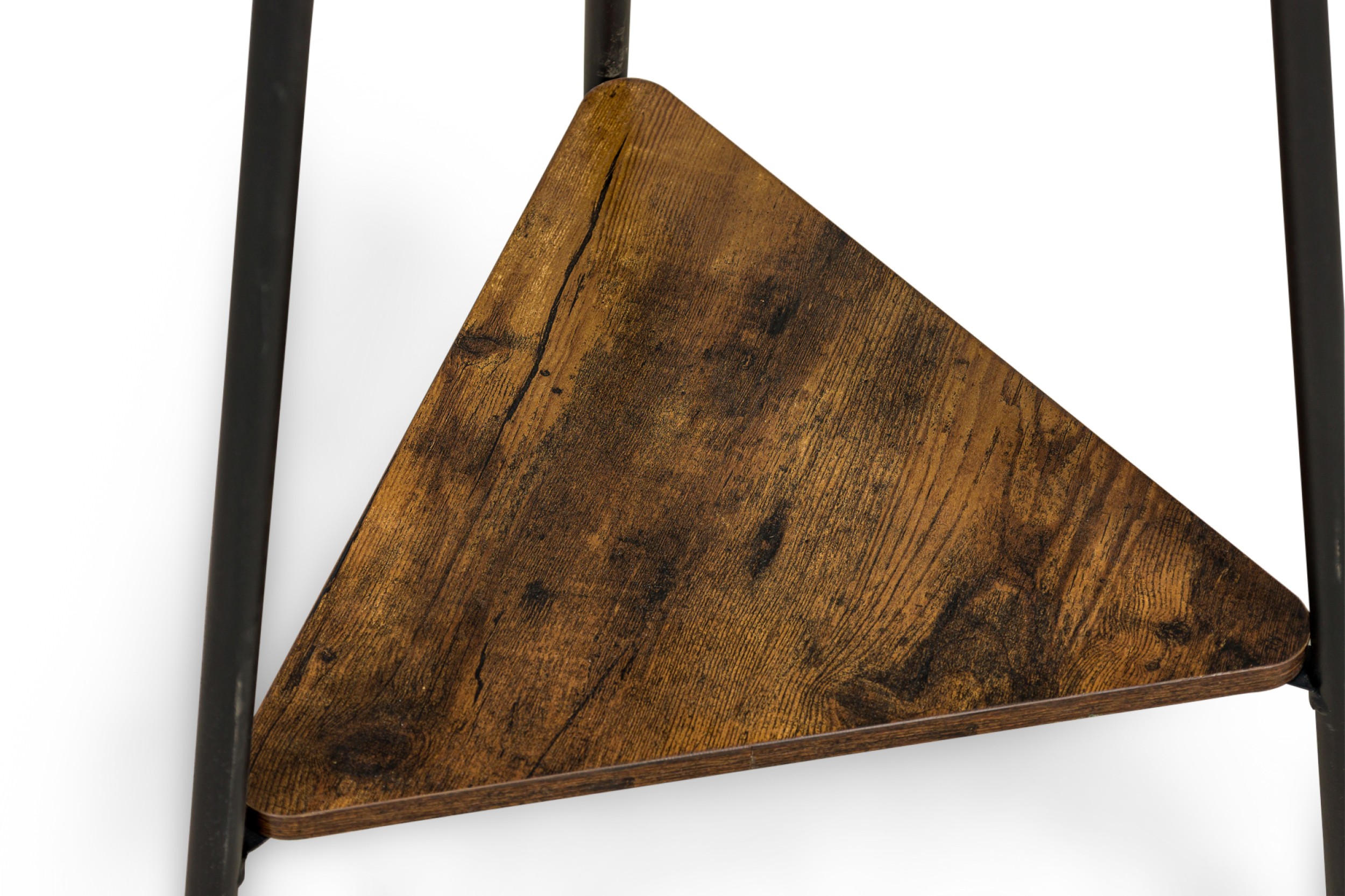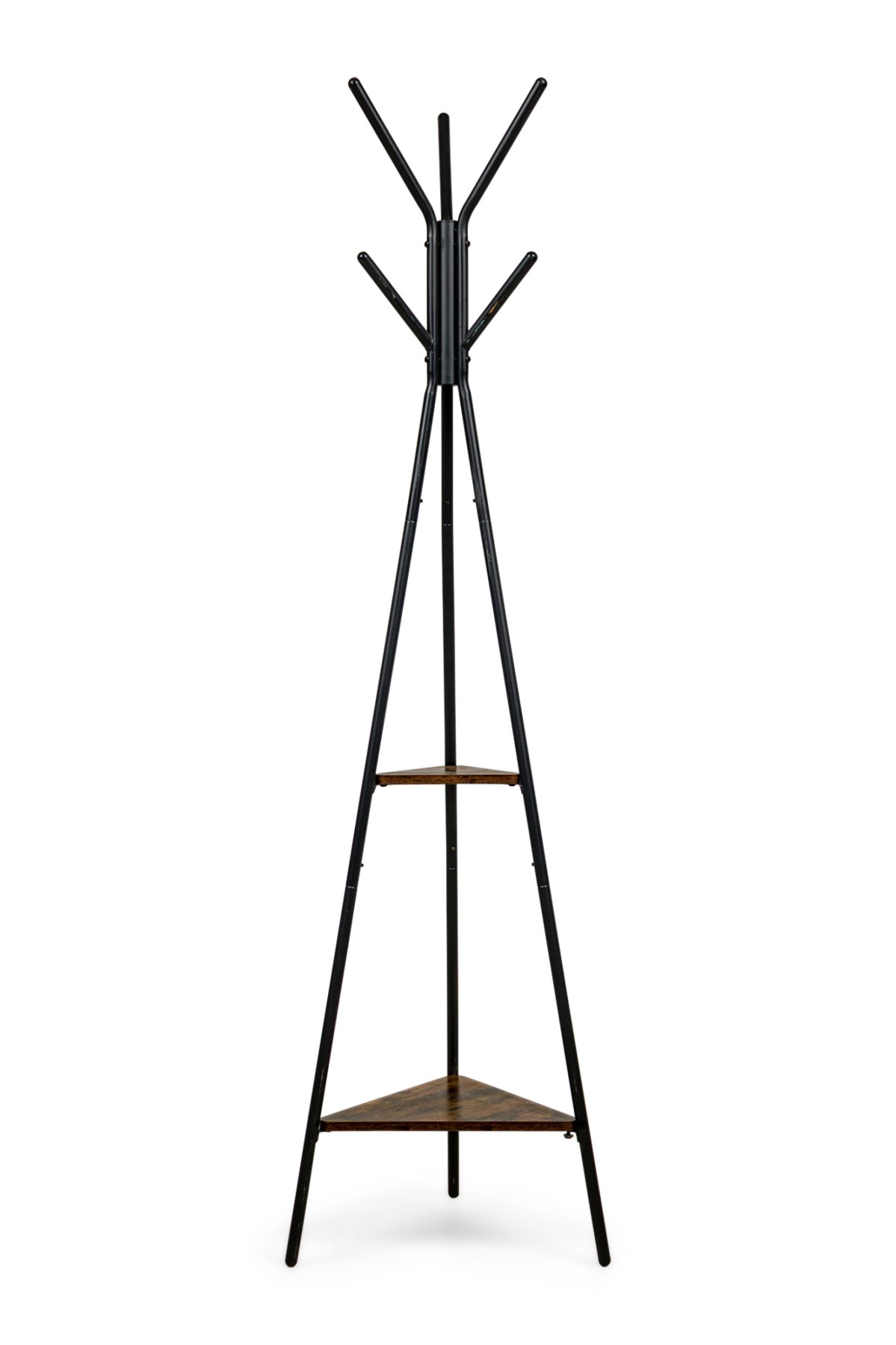 American Mid-Century style free standing black metal coat/ hattrack with prongs to hang and a triagular center shelf and platform base ending on three metal legs.