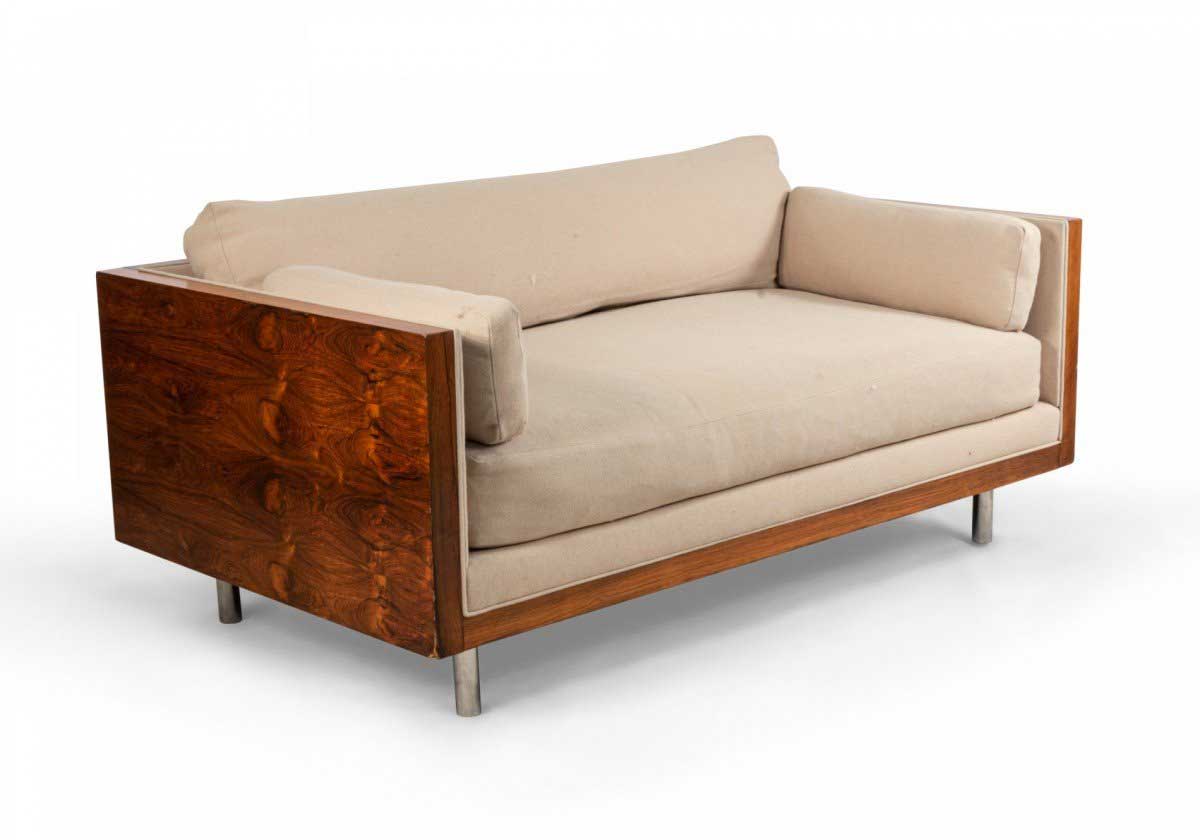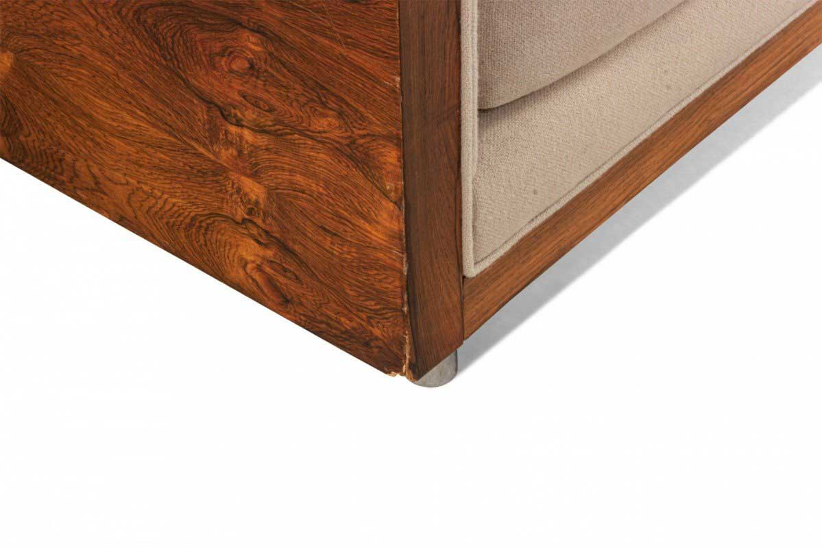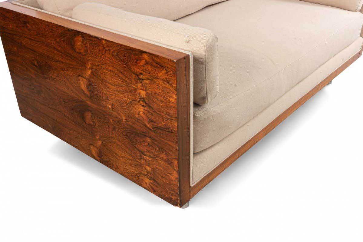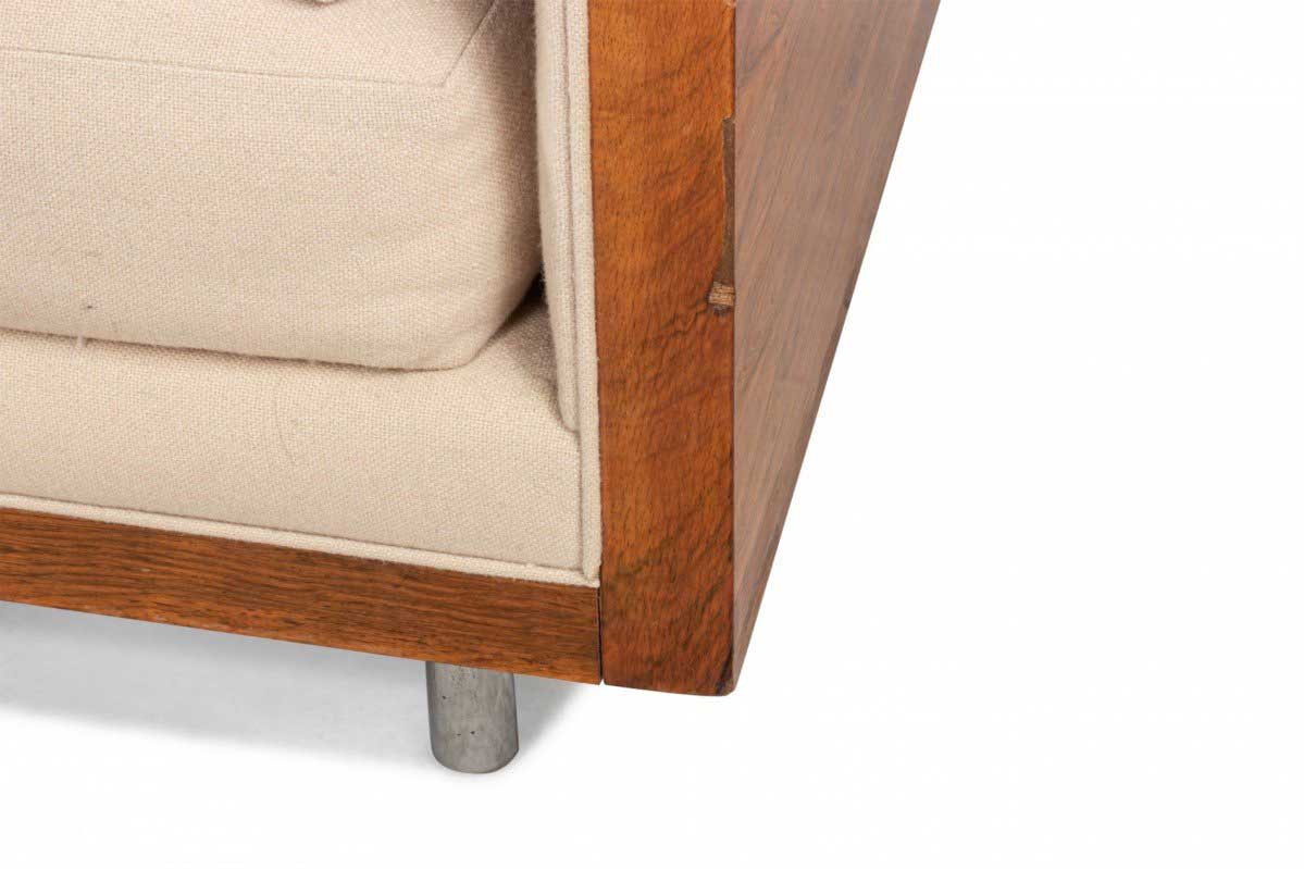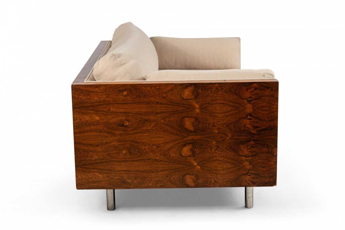 American Post-War design rosewood loveseat with chrome trim on cylindrical feet having light beige upholstery (designed by MILO BAUGHMAN)