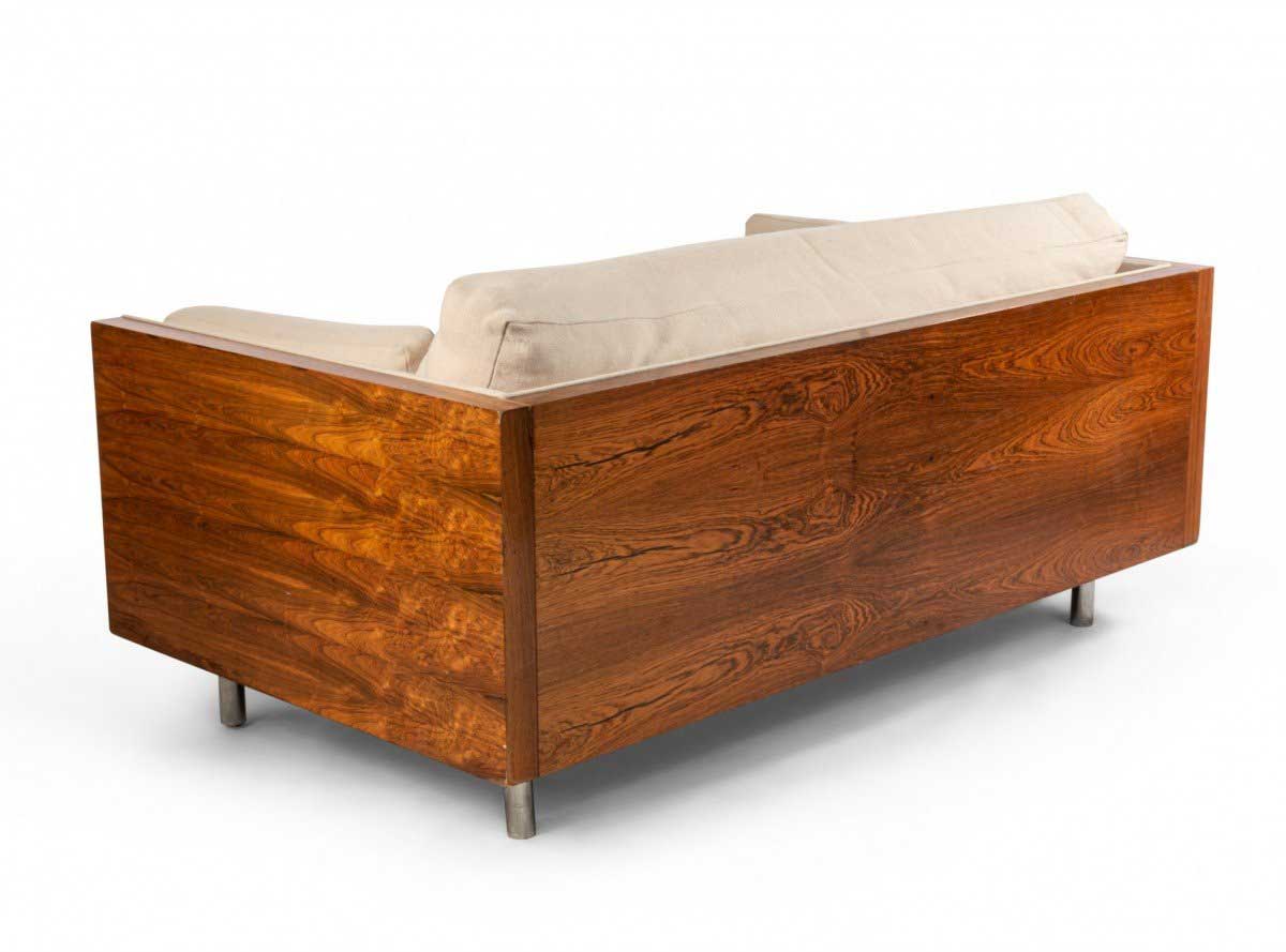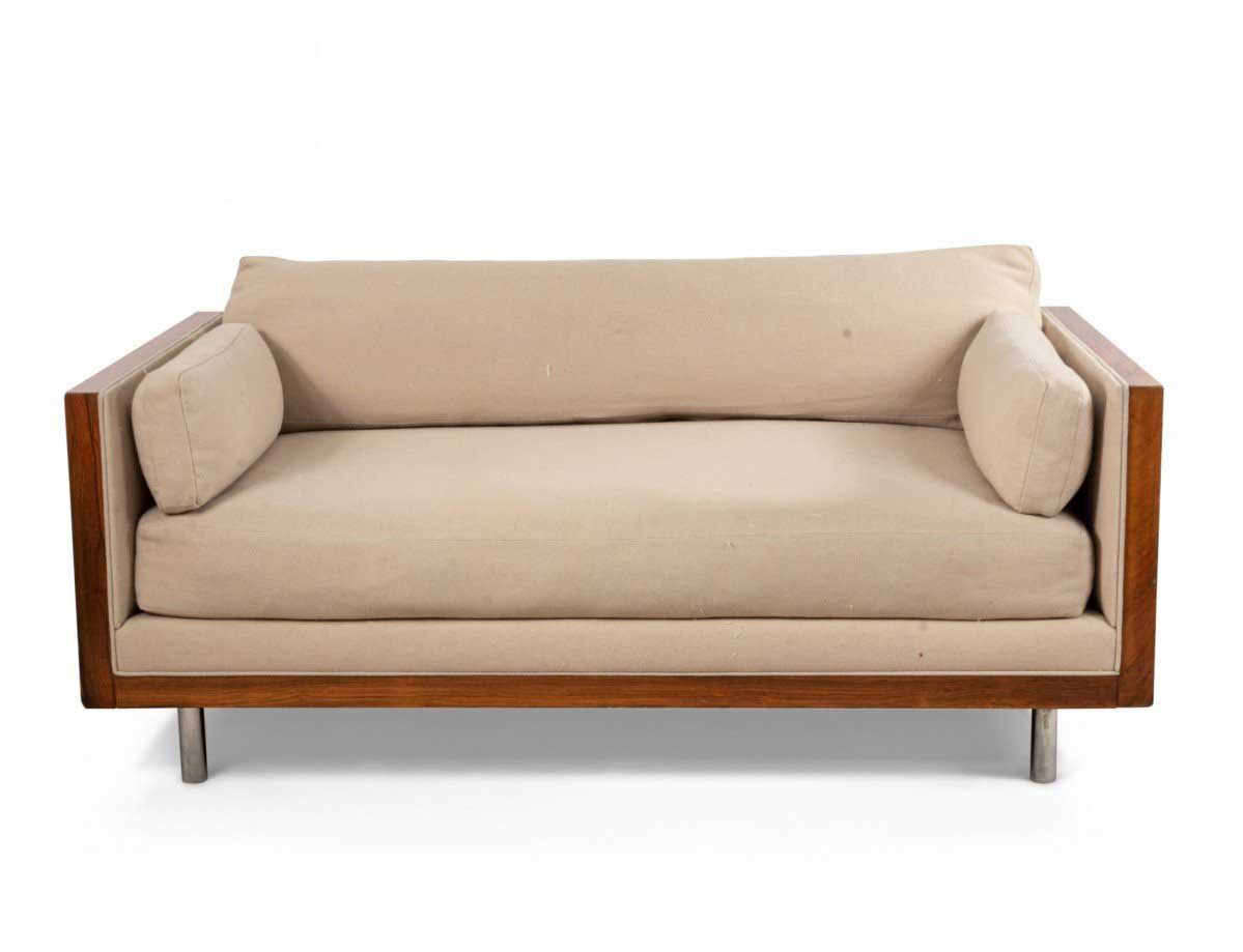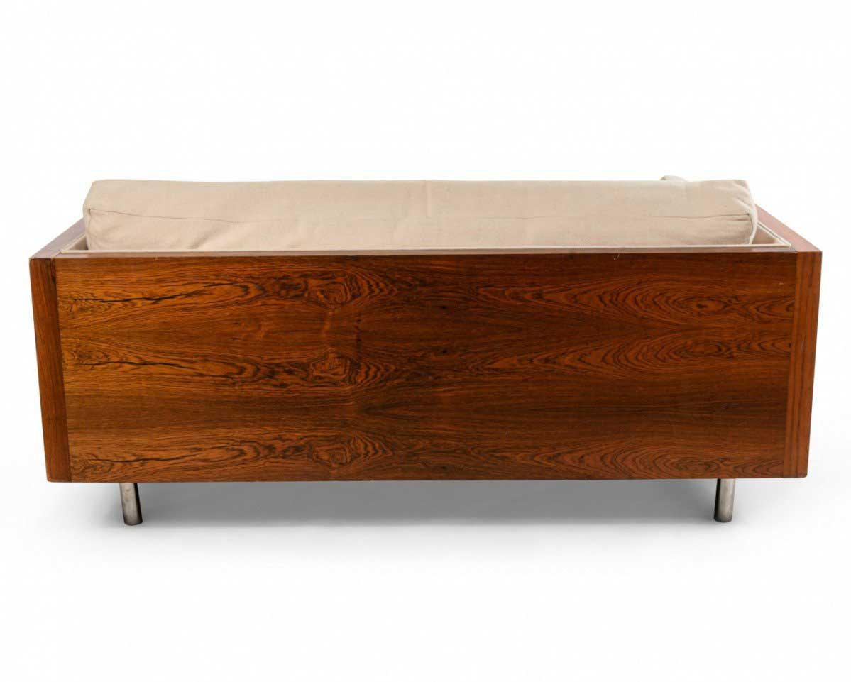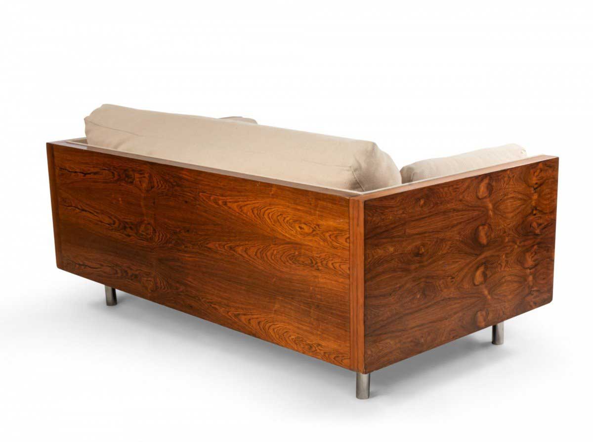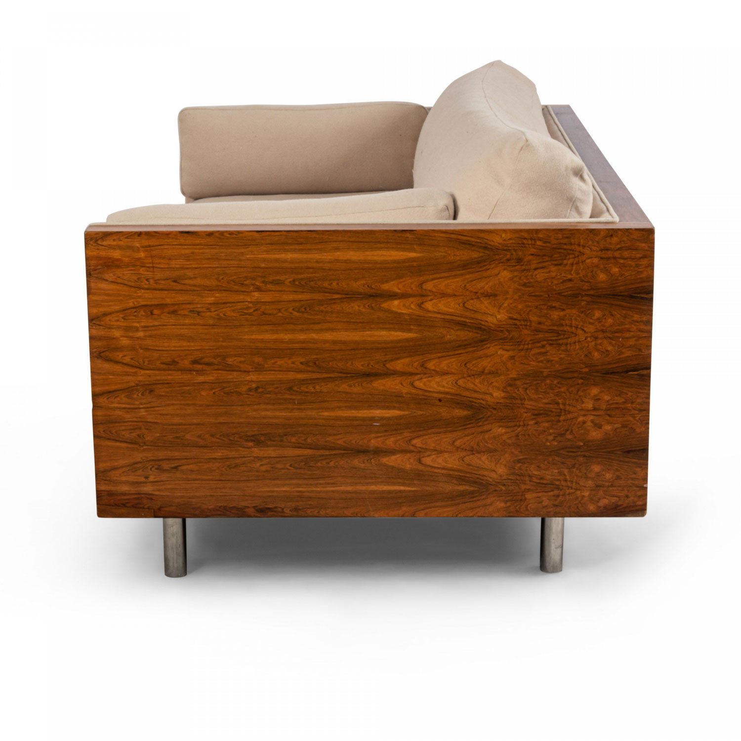 American Post-War design rosewood loveseat with chrome trim on cylindrical feet having light beige upholstery (designed by MILO BAUGHMAN)
