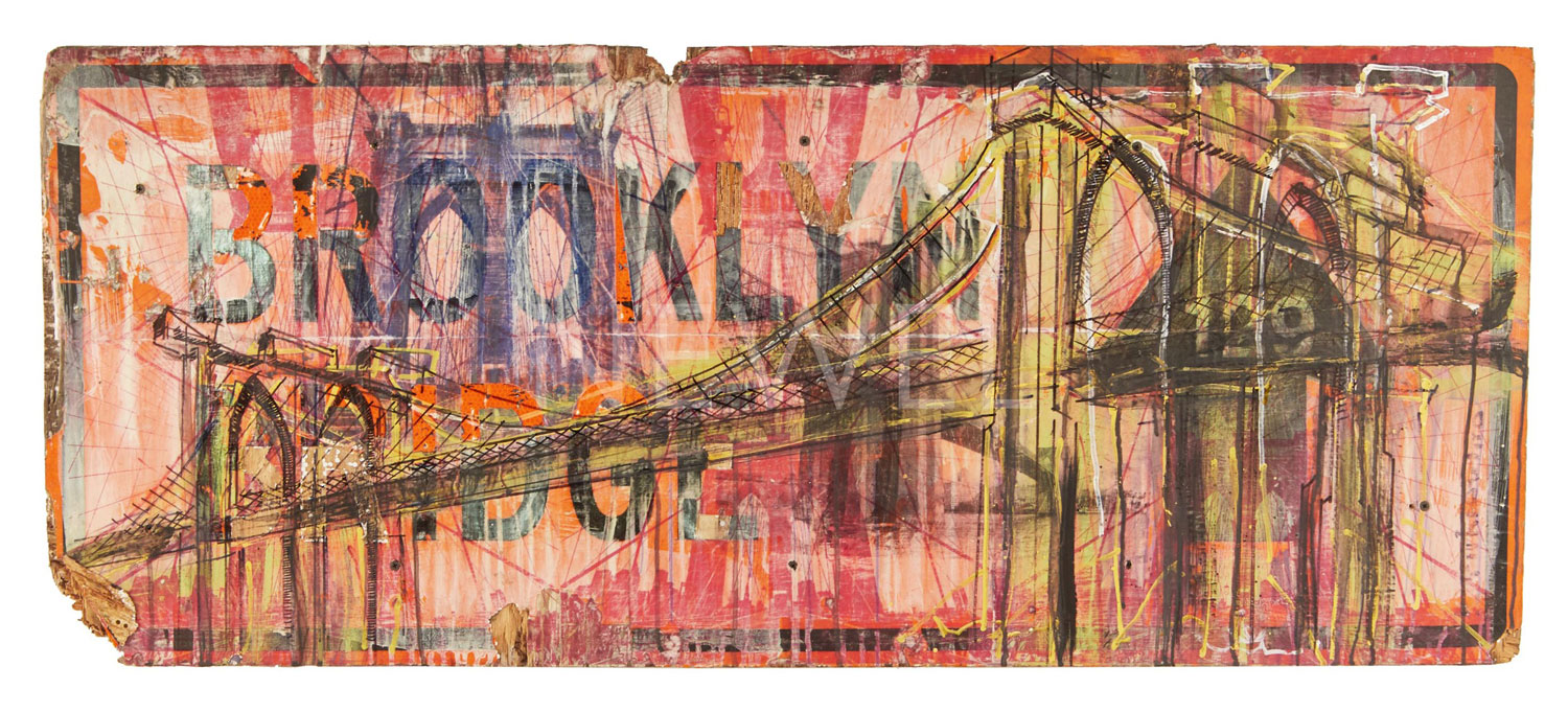 Contemporary abstract painting featuring the Brooklyn bridge and multi-colored paint splatters on a wooden street sign