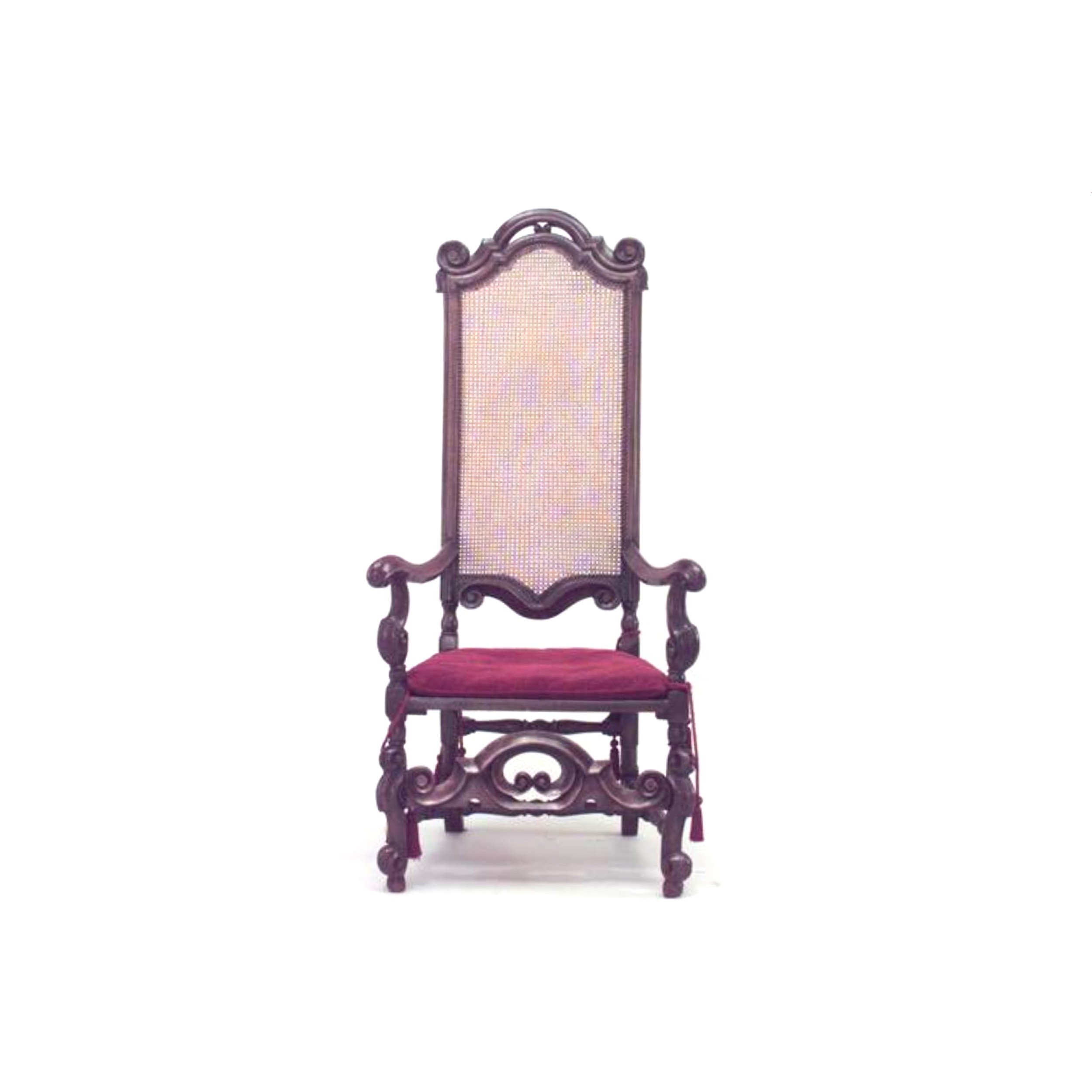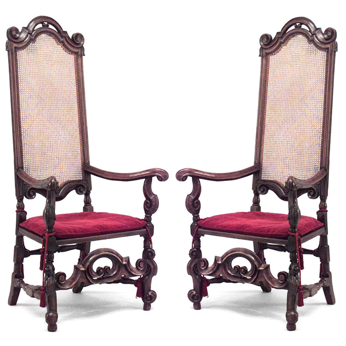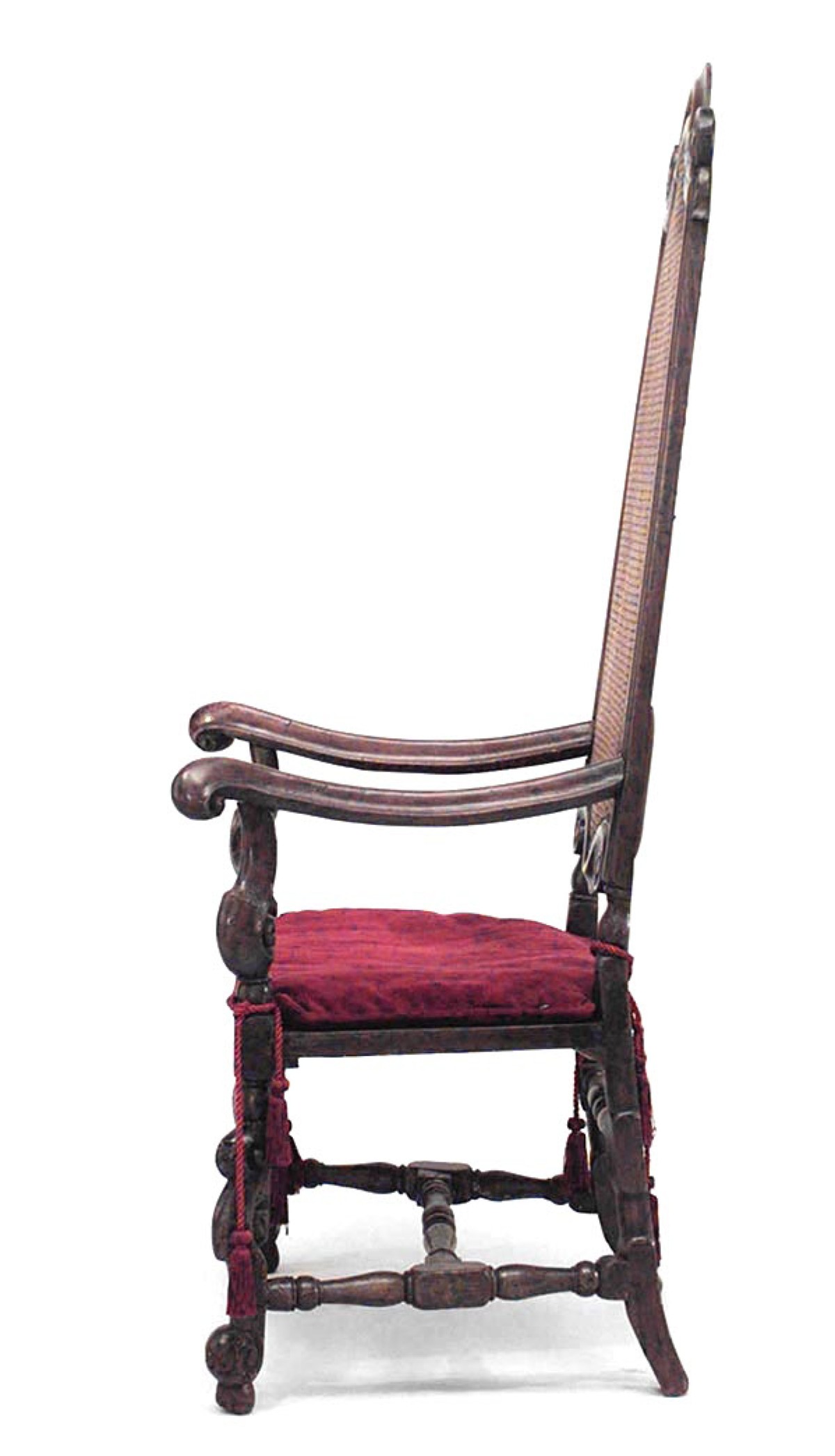 2 English Jacobean (17th/18th Cent) walnut high back armchairs with cane seat and back, stretcher, and red cushion. (Matching 2 side chairs 050181B) (PRICED EACH)