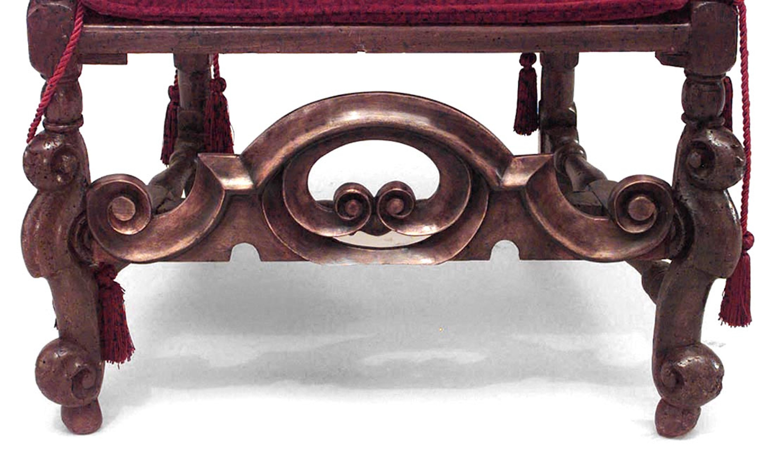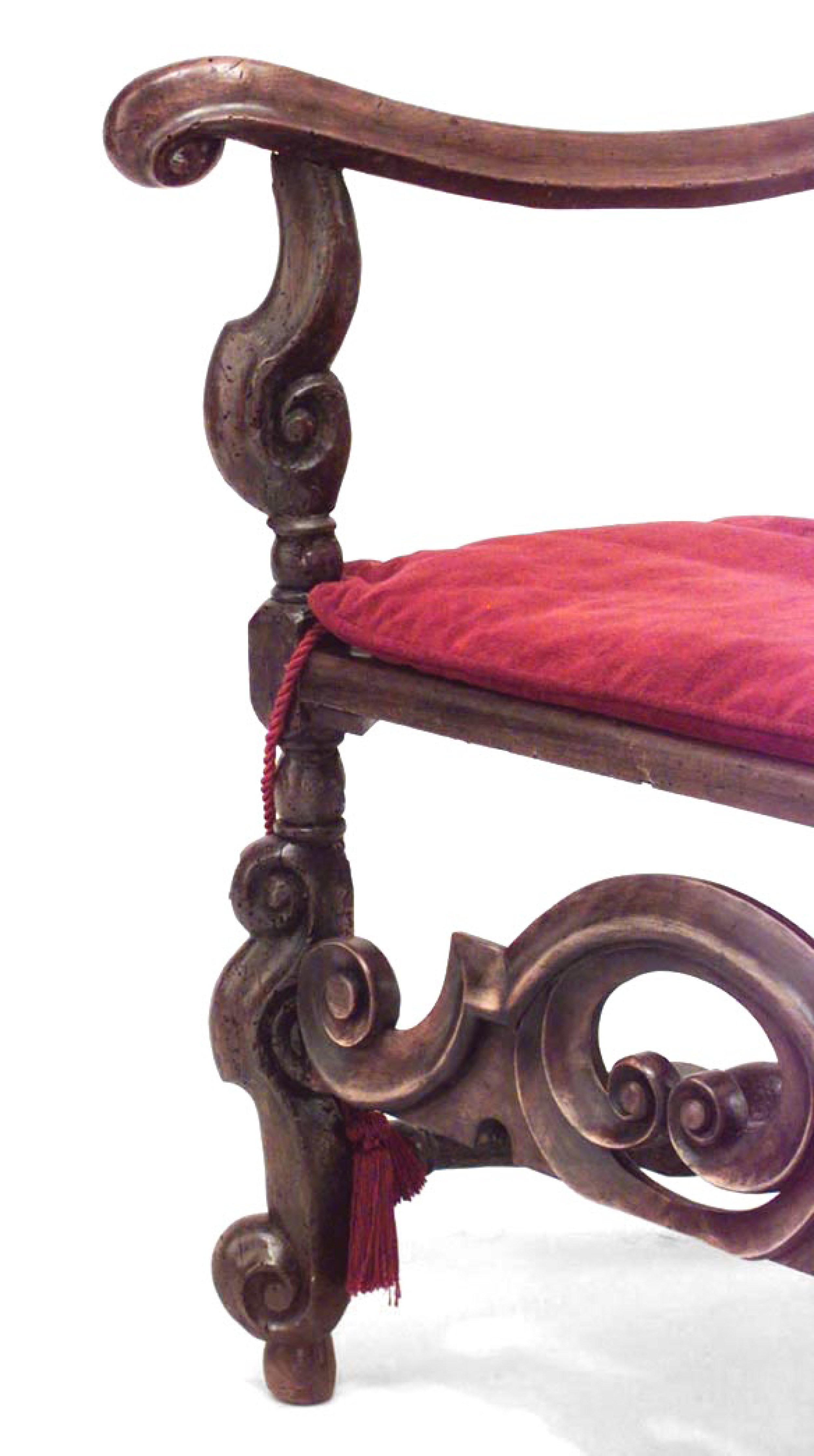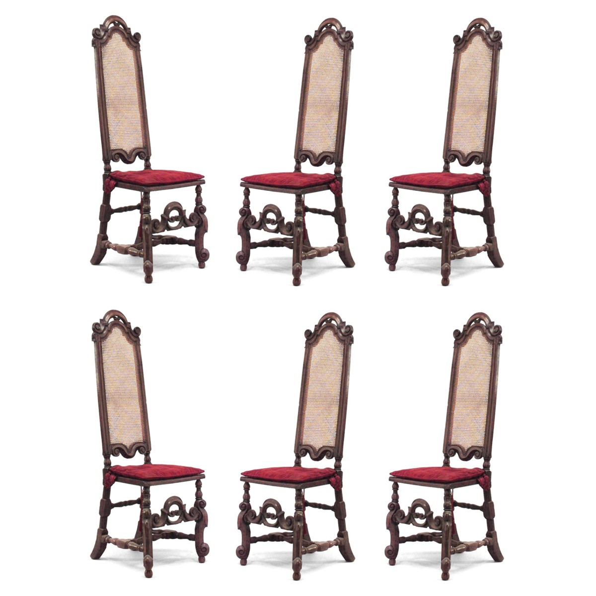 2 English Jacobean (17th/18th Cent) walnut high back armchairs with cane seat and back, stretcher, and red cushion. (Matching 2 side chairs 050181B) (PRICED EACH)