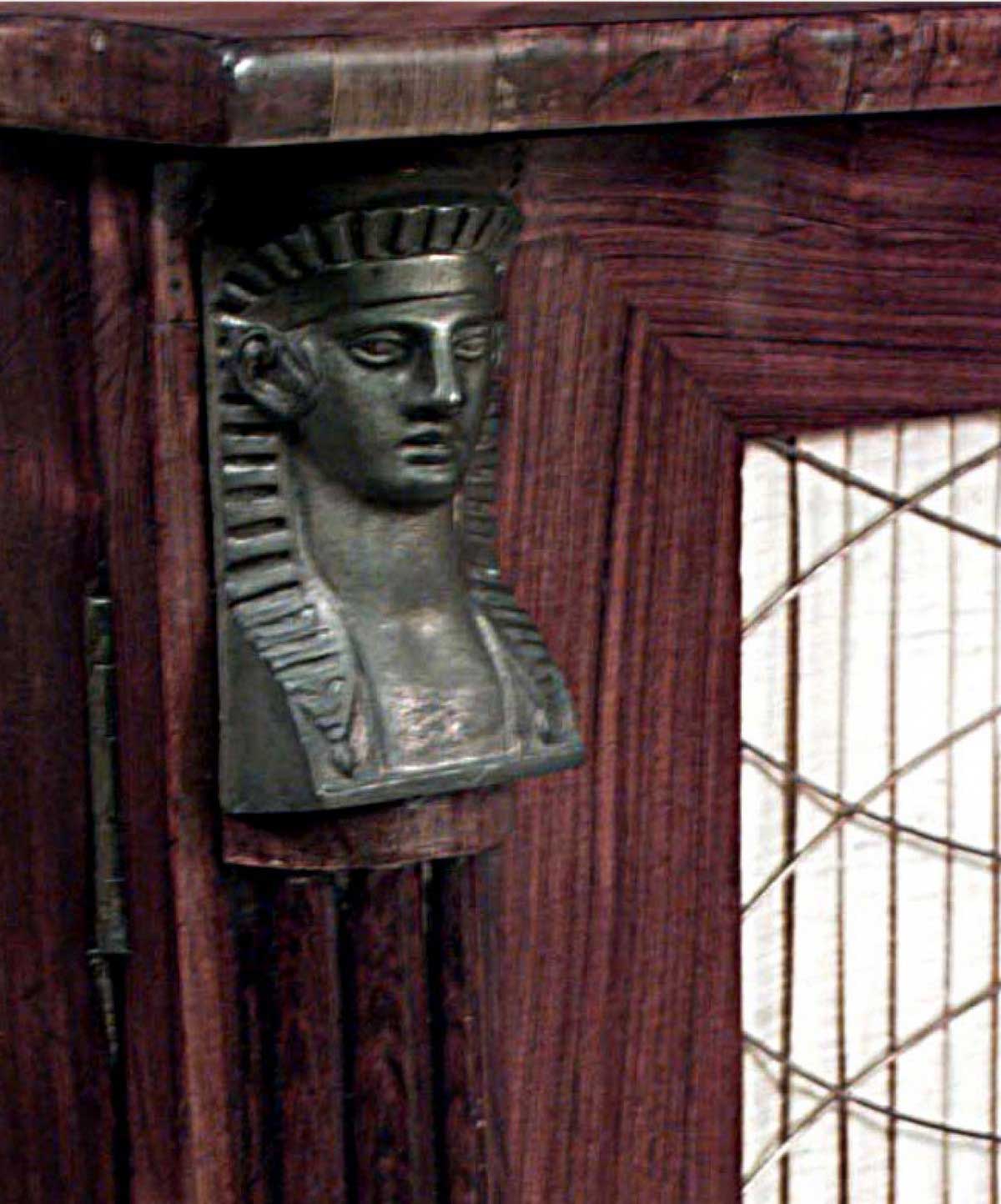 English Regency (Early 19th Century) bronze mounted rosewood chiffonier with 3 graduated tiers above a pair of grilled doors flanked by Egyptian headed pilasters on claw feet.