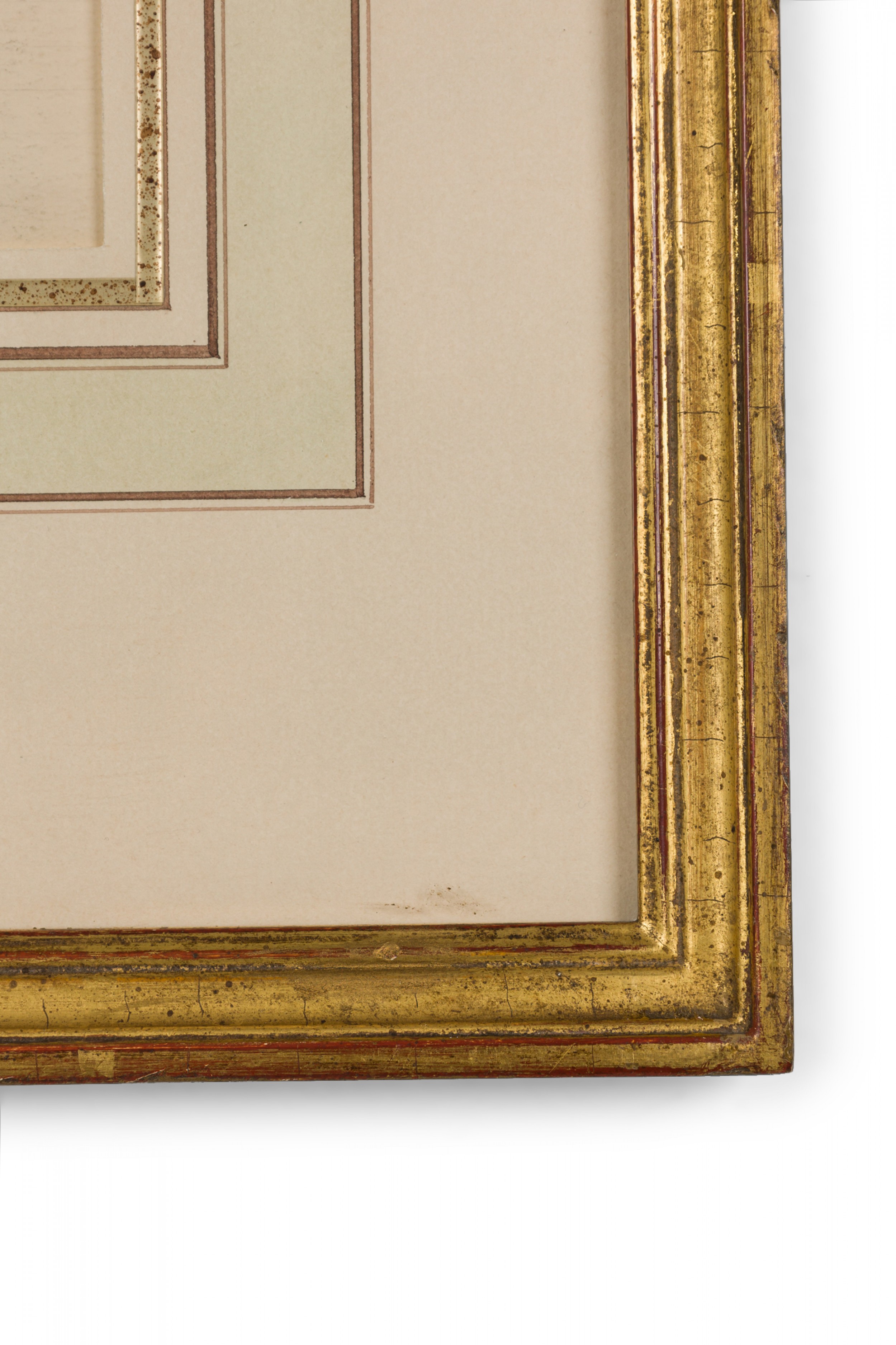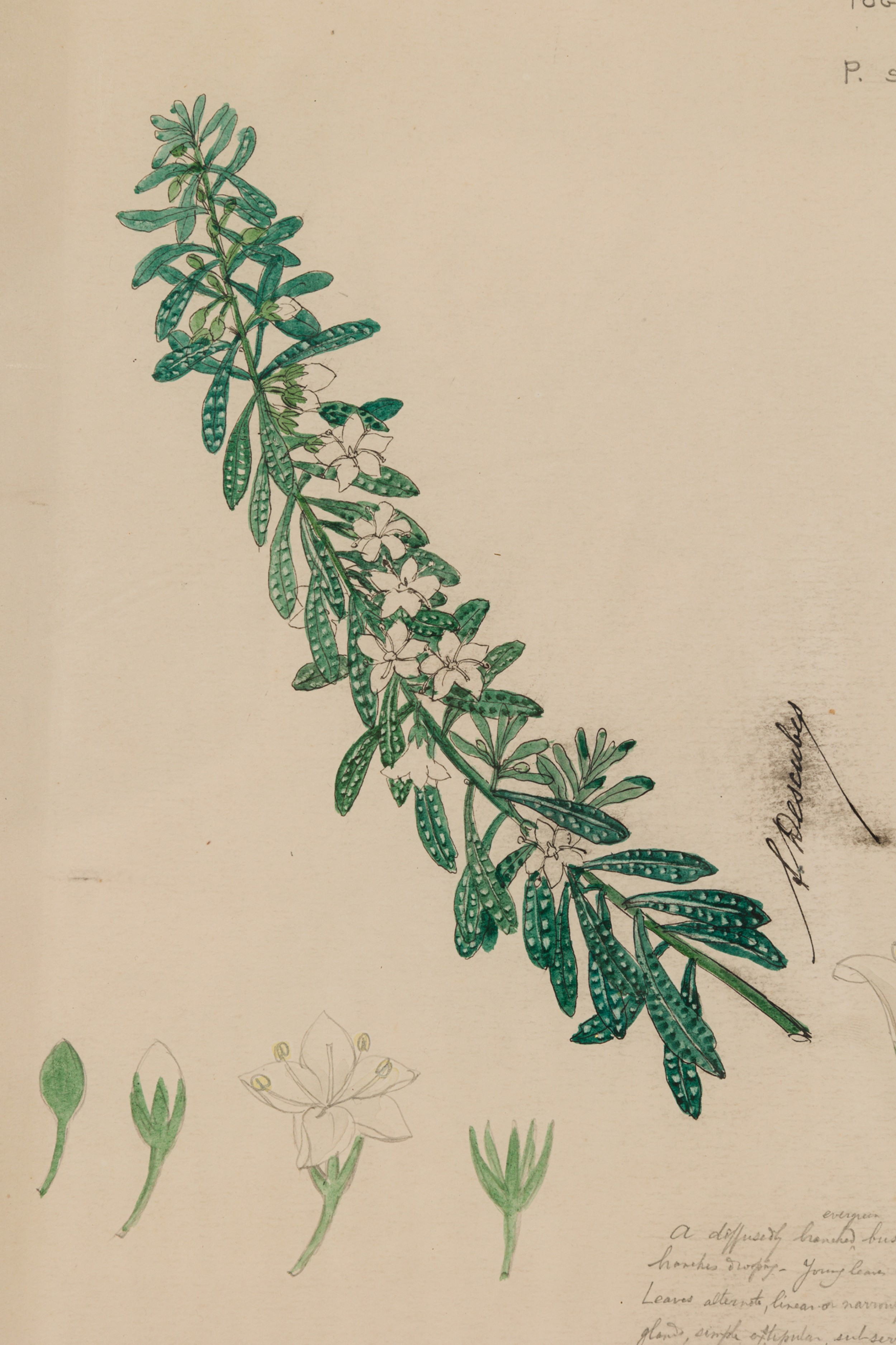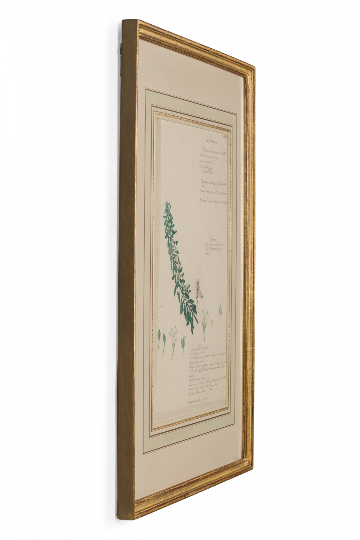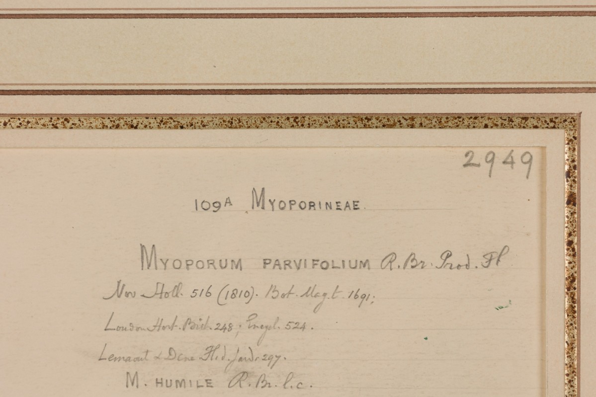 American Victorian (19th Century) watercolor, ink, and pencil botanical drawing depicting a Myoporum Parvifolium plant in green tones against a beige background, matted in a beveled parcel gilt painted wood frame. (Companion pieces: 063653-063701)