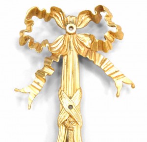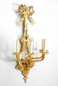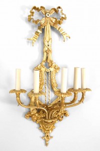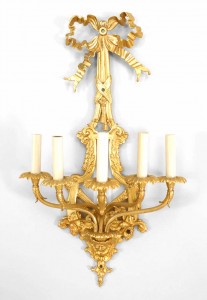 2 French Louis XVI-style (19th Century) bronze dore wall sconces with five arms, bow knot design, lyre-shaped center pieces and masks at bottoms (PRICED EACH)