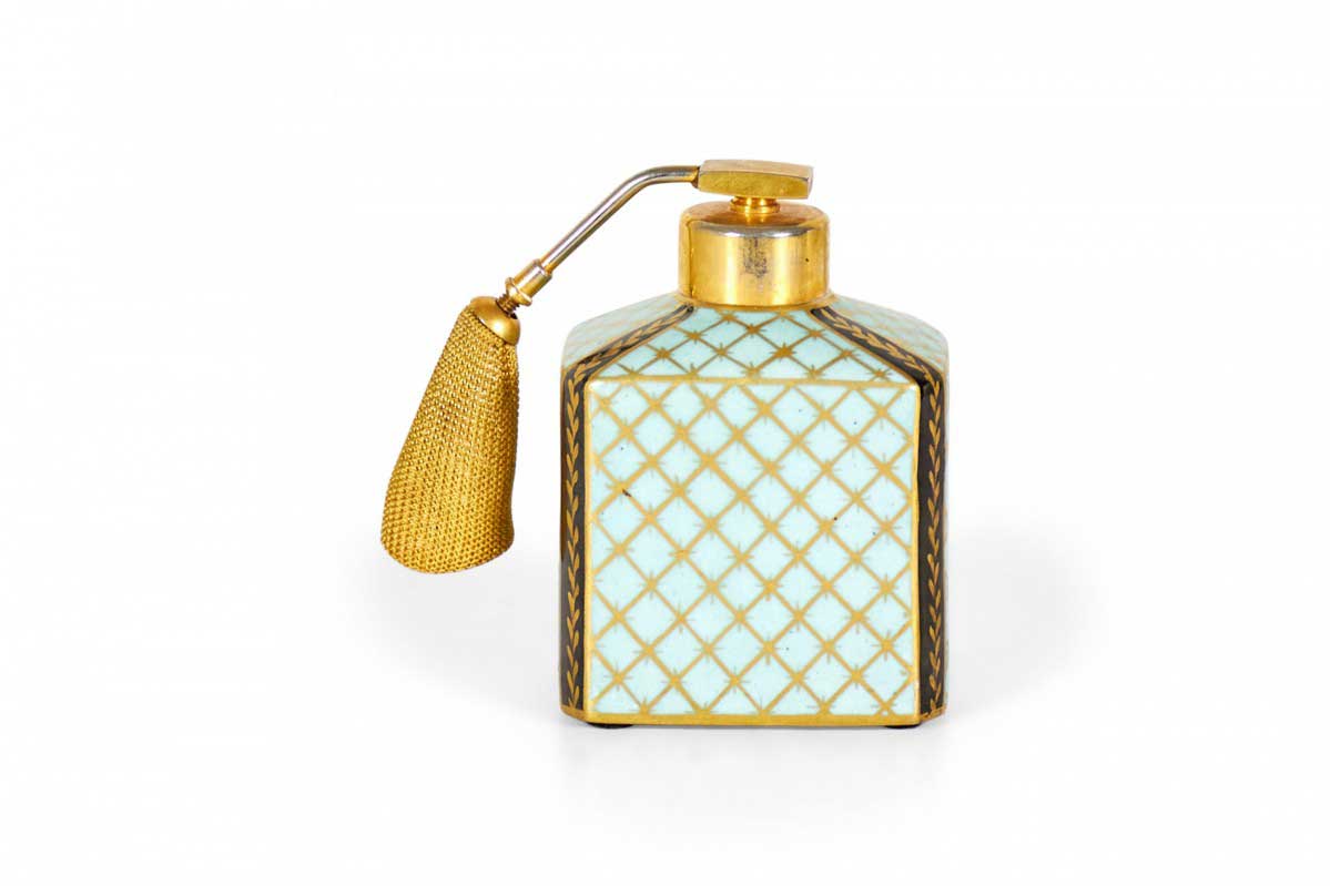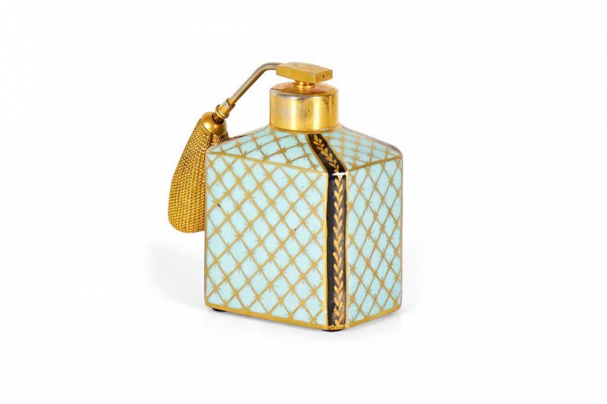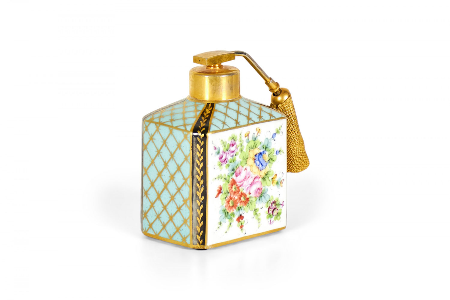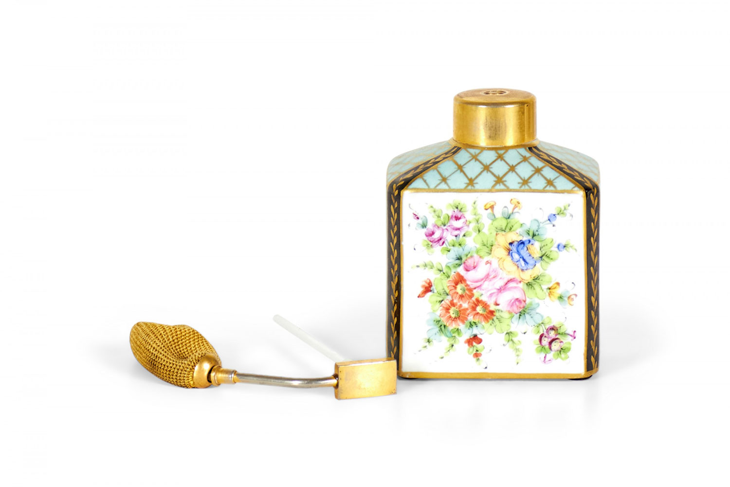 French Victorian blue and gilt trimmed porcelain perfume atomizer with floral design