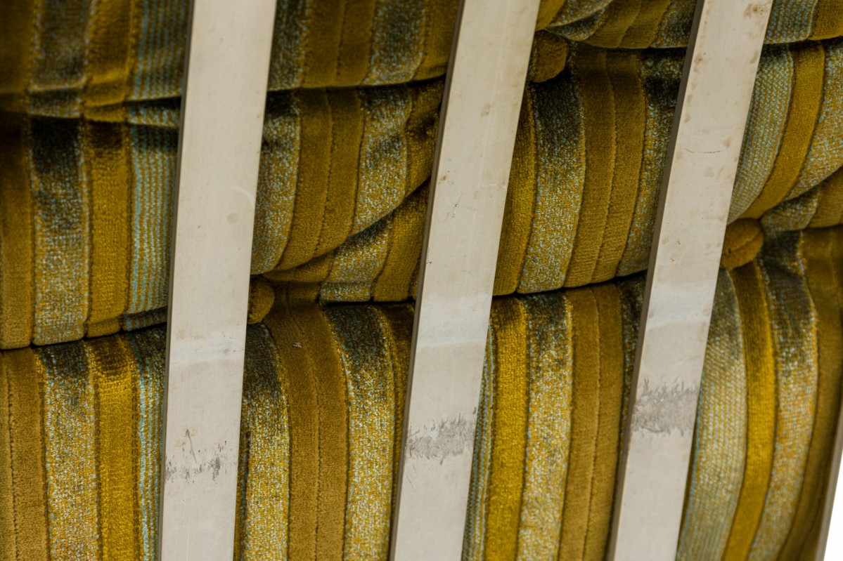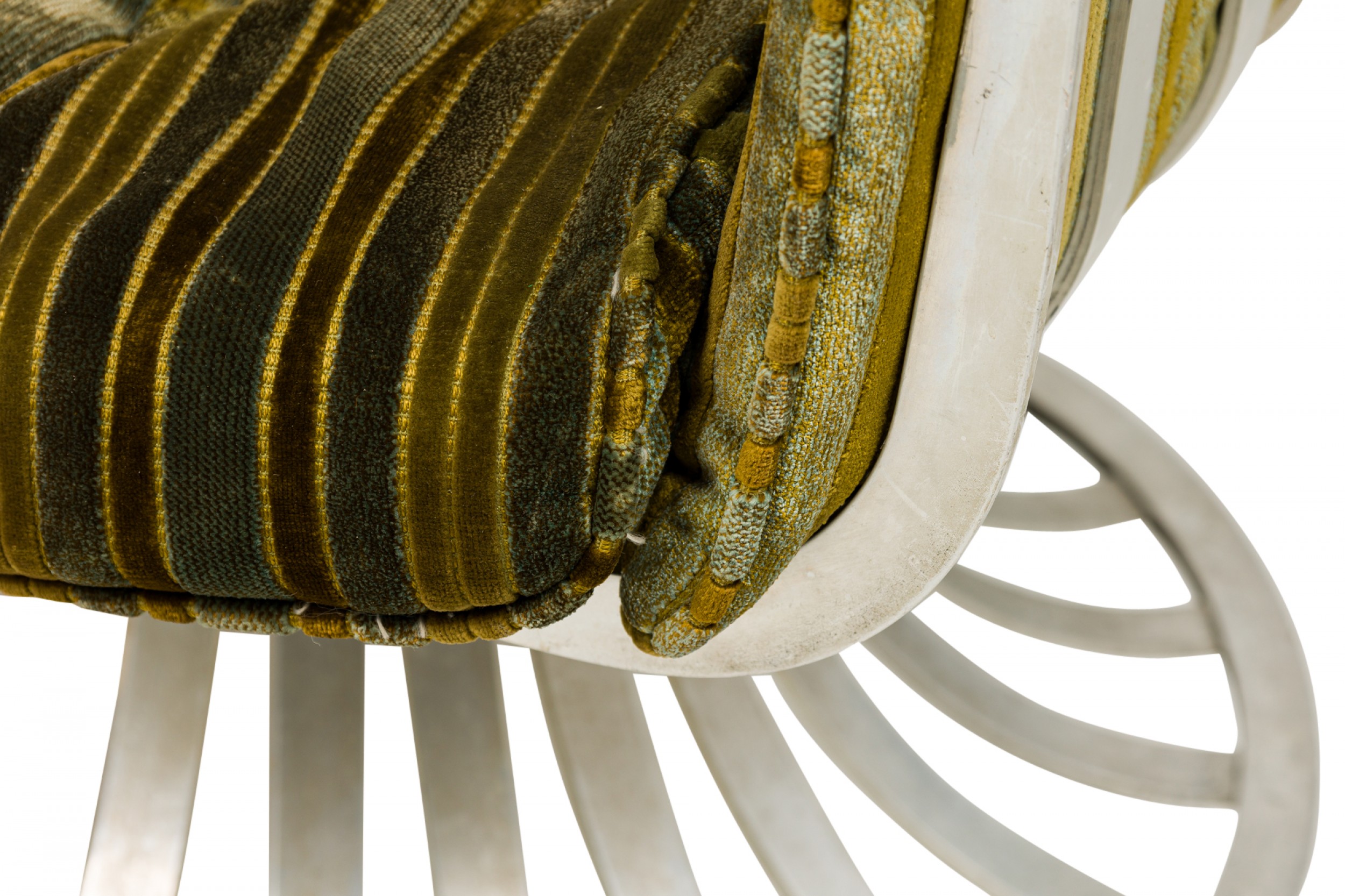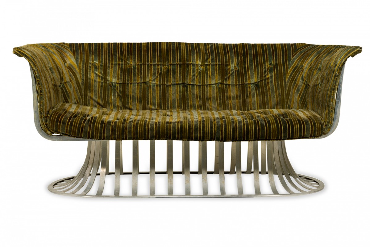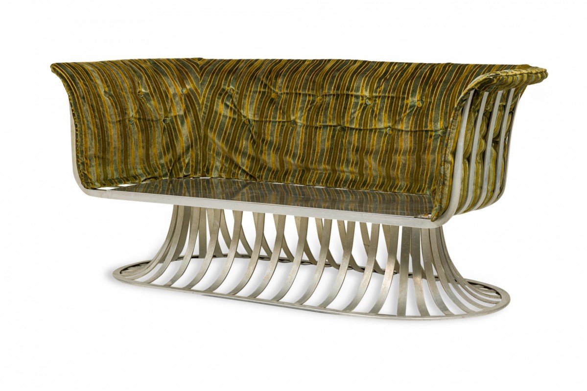 American Mid-Century settee with a form comprised or molded aluminum slats with sloped sides and a tulip base, upholstered with a button tufted multi-tonal green striped velvet fabric.
